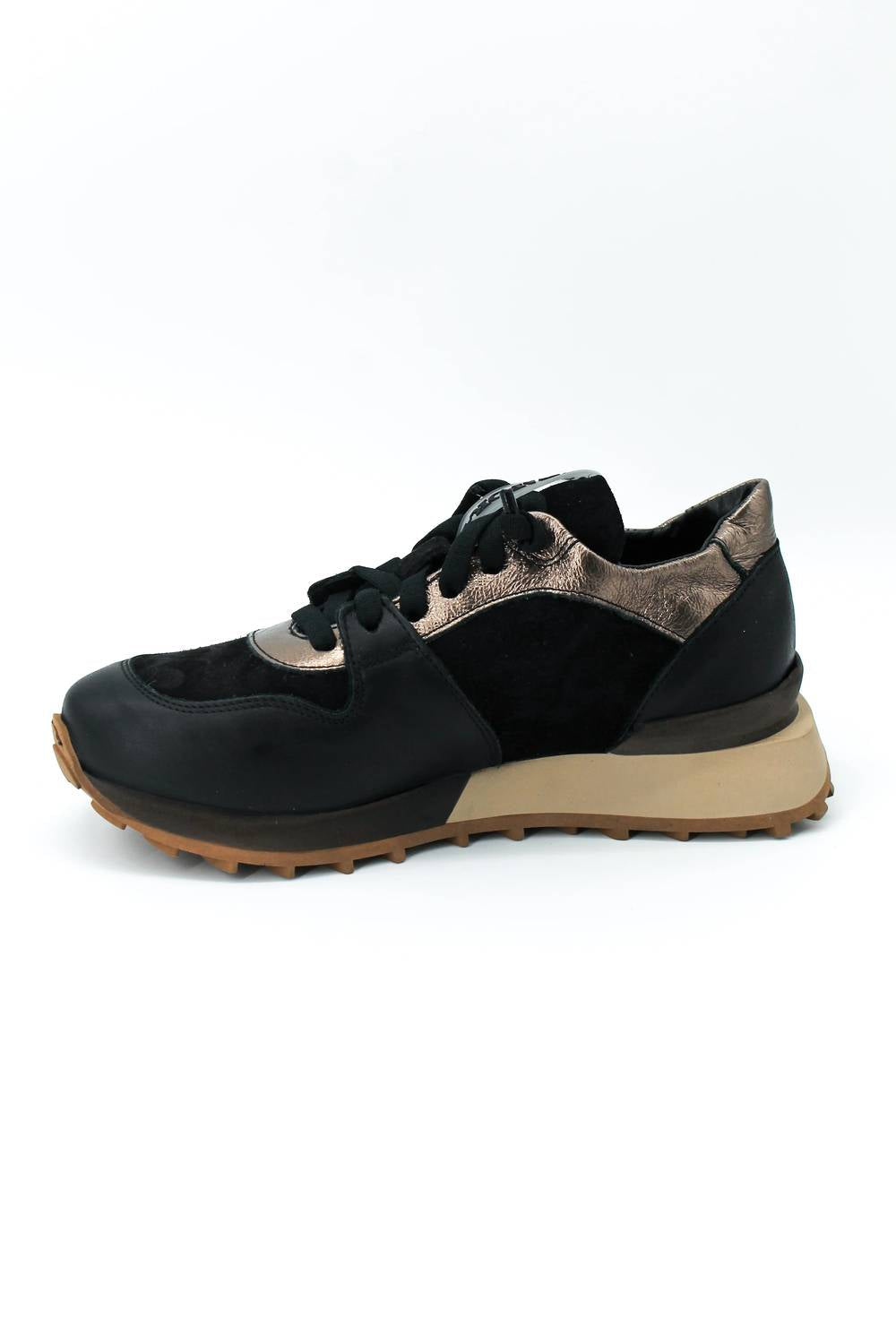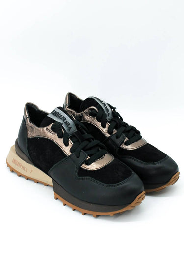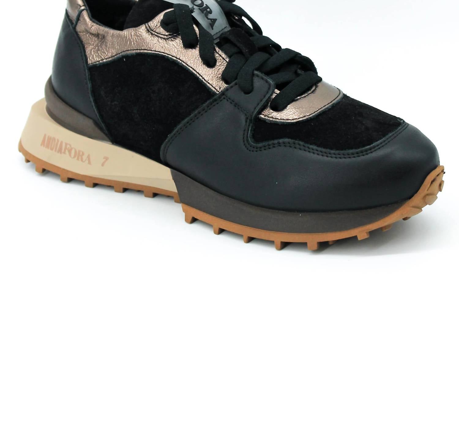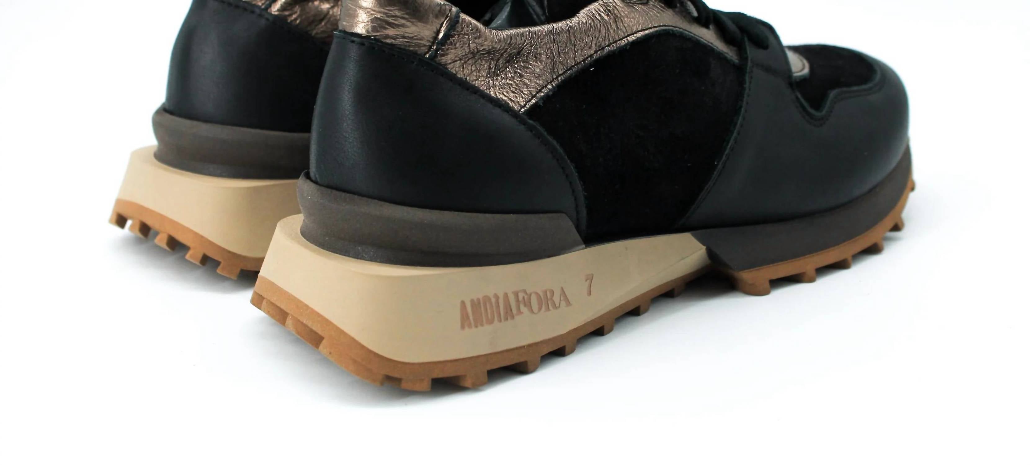 Andia Fora presents the Women's Ruffle Sneaker, a chic Italian-crafted sneaker in black that blends elegance with comfort. Made from premium leather, these sneakers offer a round toe design and feature a sophisticated mix of black, dark brown, and light brown tones. The soft elastic back and notched sole add both comfort and a stylish edge to your look. Ideal for various outfits, these sneakers perfectly highlight satin detailing for a sleek and modern appeal.