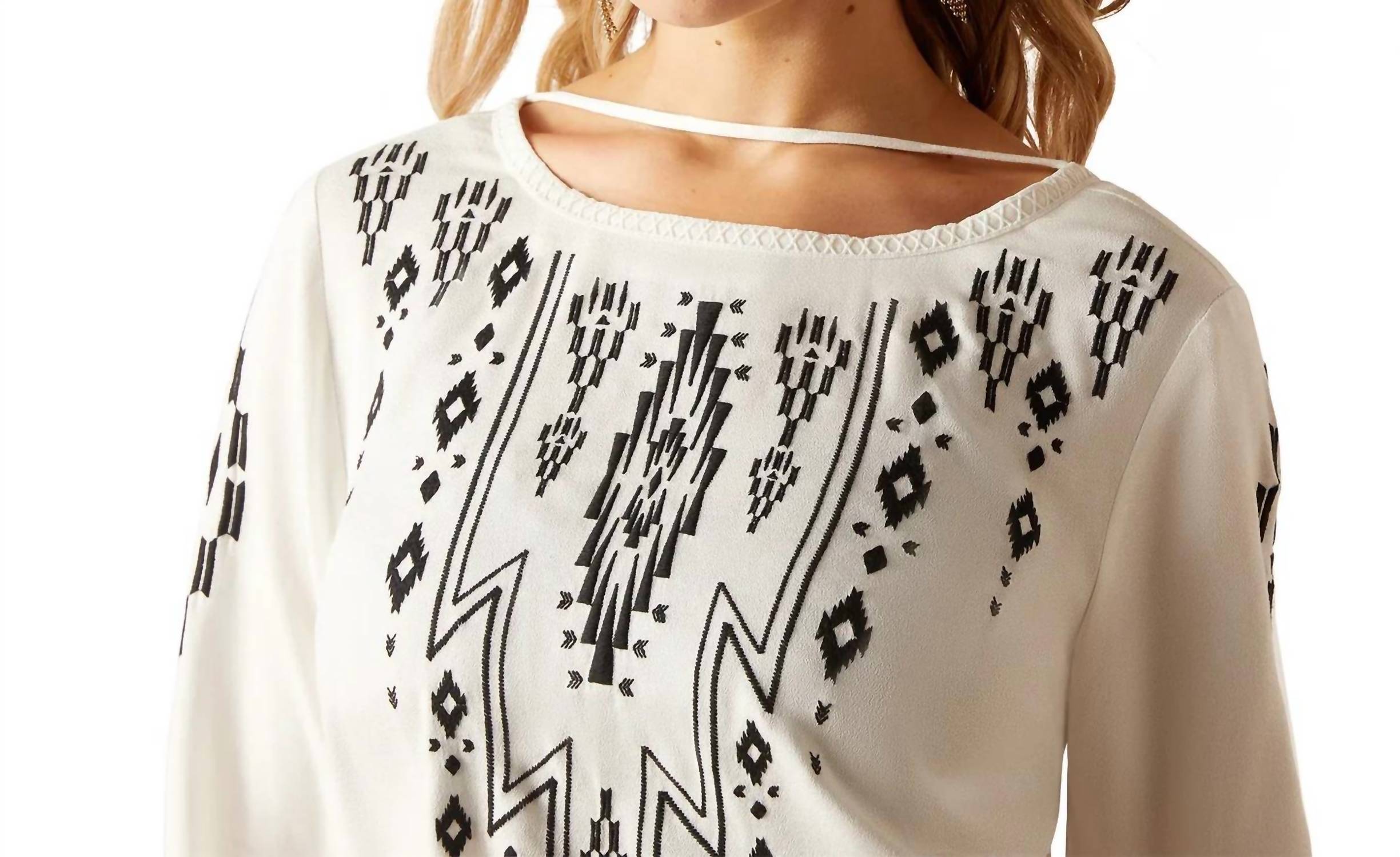 Introducing the Callie Top by ARIAT, a stylish choice for those who appreciate intricate details. This coconut milk blouse features three-quarter sleeves and a scoop neckline, adorned with eye-catching embroidery on soft rayon crepe. Composition: 100% Rayon. Closure: Pull-on design offers convenience. Care: Machine washable for easy maintenance.