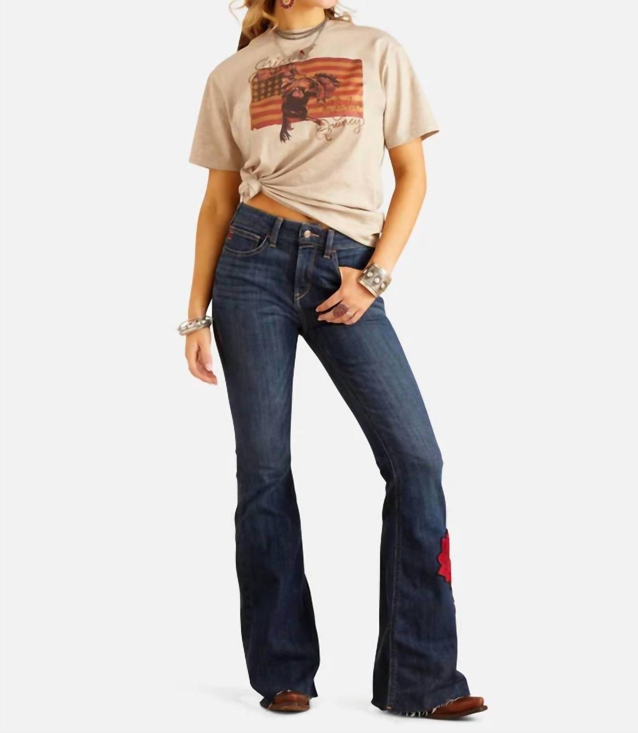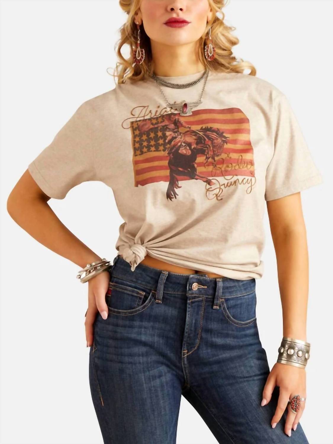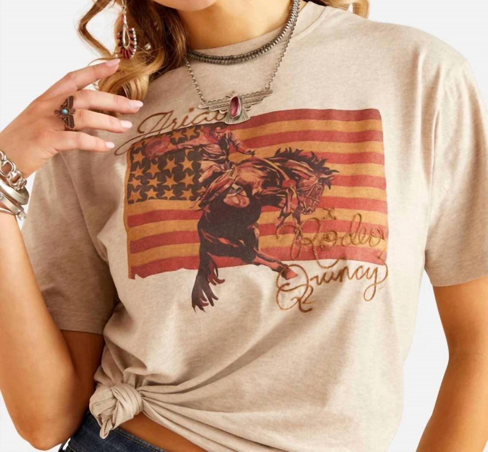 Introducing the Flag Rodeo Quincy Tee by Ariat, a vibrant celebration of Western spirit for the trendy cowgirl. This short-sleeve tee in striking gold features a bold flag and cowboy graphic design. Made from 100% cotton, it offers a comfortable, true-to-size fit with a classic crewneck. Closure is an easy pull-on style. Care: Machine wash as needed to maintain its Western allure.