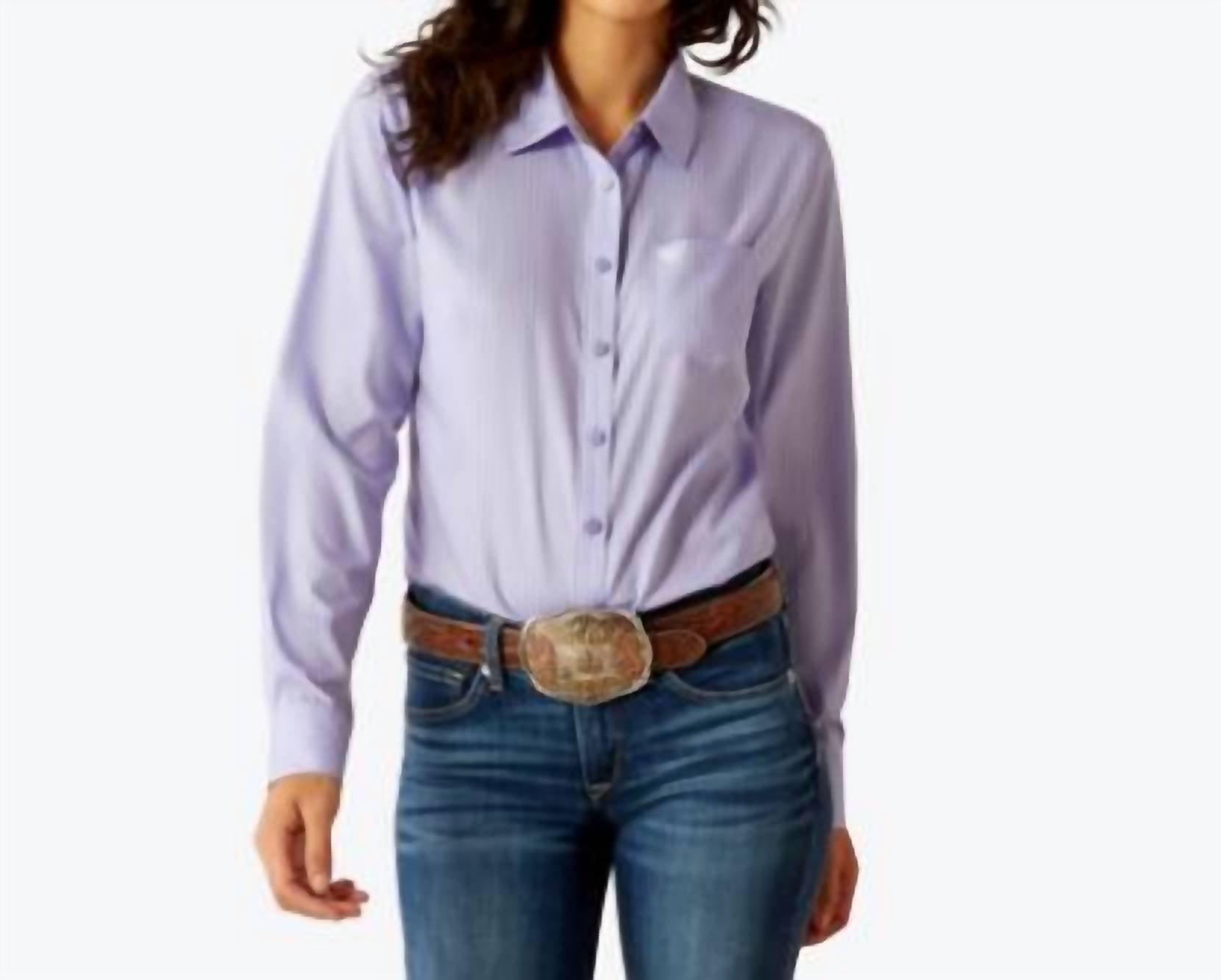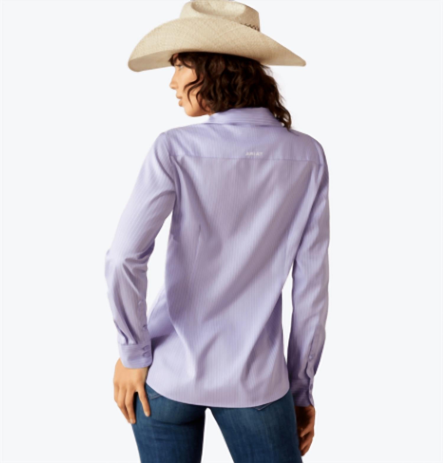 Introducing the Kirby Pro Shirt by ARIAT, a stylish choice in Sweet Lavender Stripe for your wardrobe. This button-down shirt features long sleeves and a button-front closure, designed with an athletic, form-following fit and extra length for coverage. Crafted from 100% Polyester, it offers Greater Arm Mobility™ and Sun Protection Fabric™ for confidence under the sun, boasting UPF 40. Imported and equipped with a chest pocket, this shirt's breathable, moisture-wicking, and stretch fabric ensures comfort and freedom of movement.