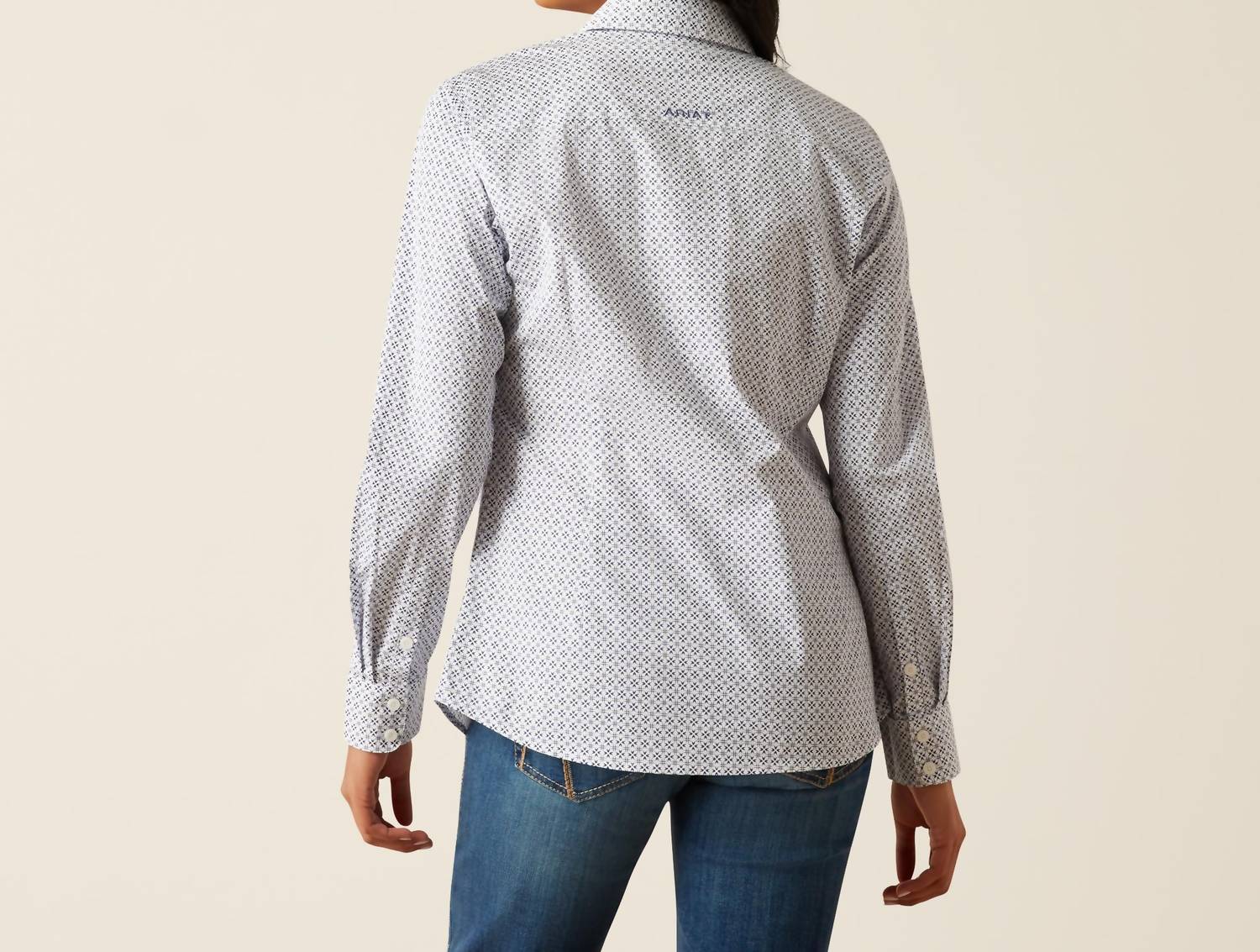 Presenting the Kirby Stretch Button-Down Shirt by ARIAT in Ocean Geo/Gold, a must-have for any wardrobe. This women's shirt features long sleeves and a classic collar for a polished look, with a single chest pocket for added utility. Made from 97% cotton poplin and 3% spandex, it offers both wrinkle resistance and stretch for comfort and ease of movement. The shirt is crafted with a button closure and thoughtfully designed seams, delivering a flattering silhouette.