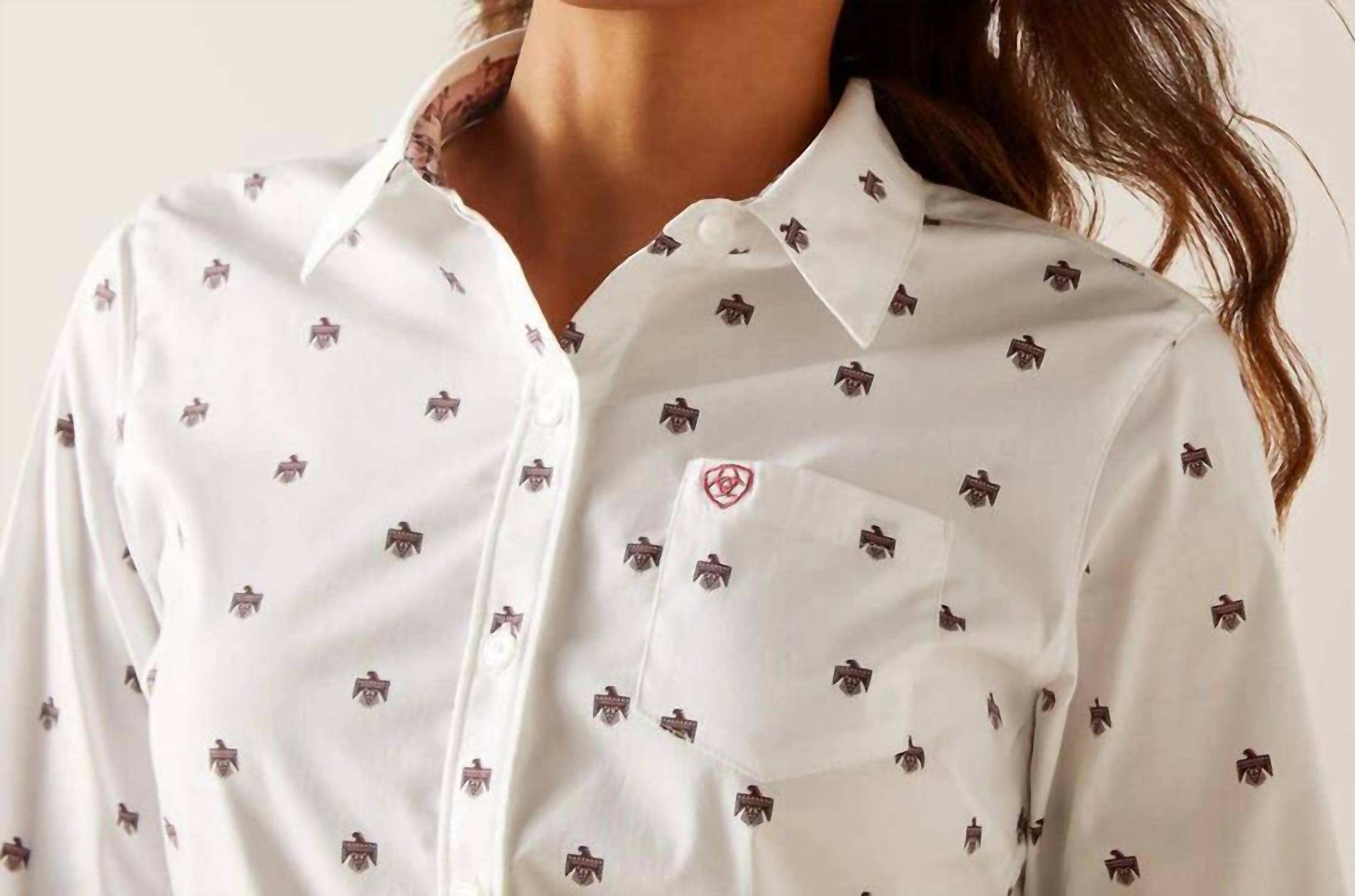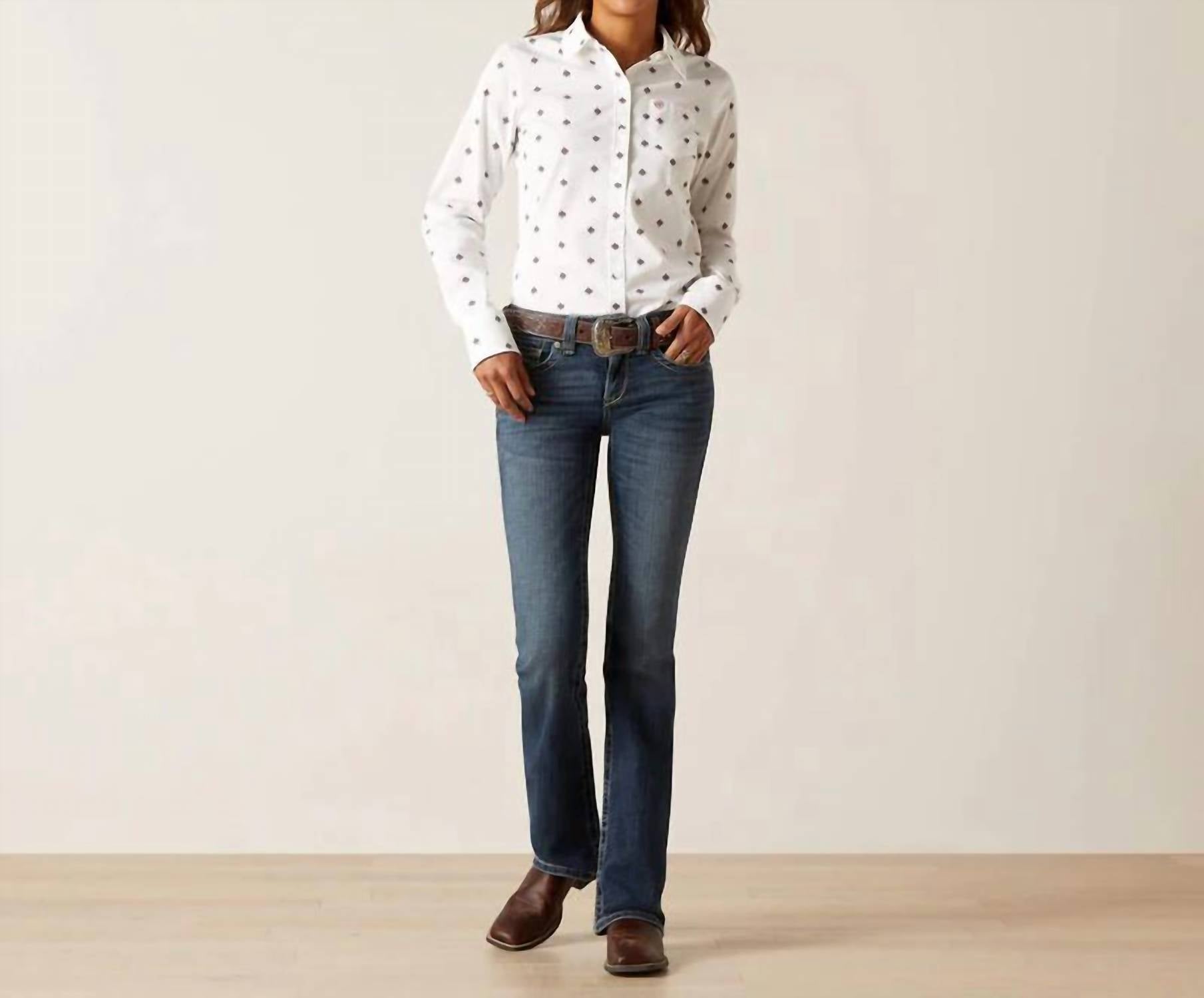 A classic button down shirt that will never go out of style.Ariat True Blue Stripe Kirby Stretch Shirt for women features a button front, long sleeves, and a single chest pocket. Designed with feminine seams and darts for shaping, it's wrinkle-resistant with a spread collar and straight-back yoke featuring small Ariat embroidery. Fabric: 97% cotton and 3% spandex.