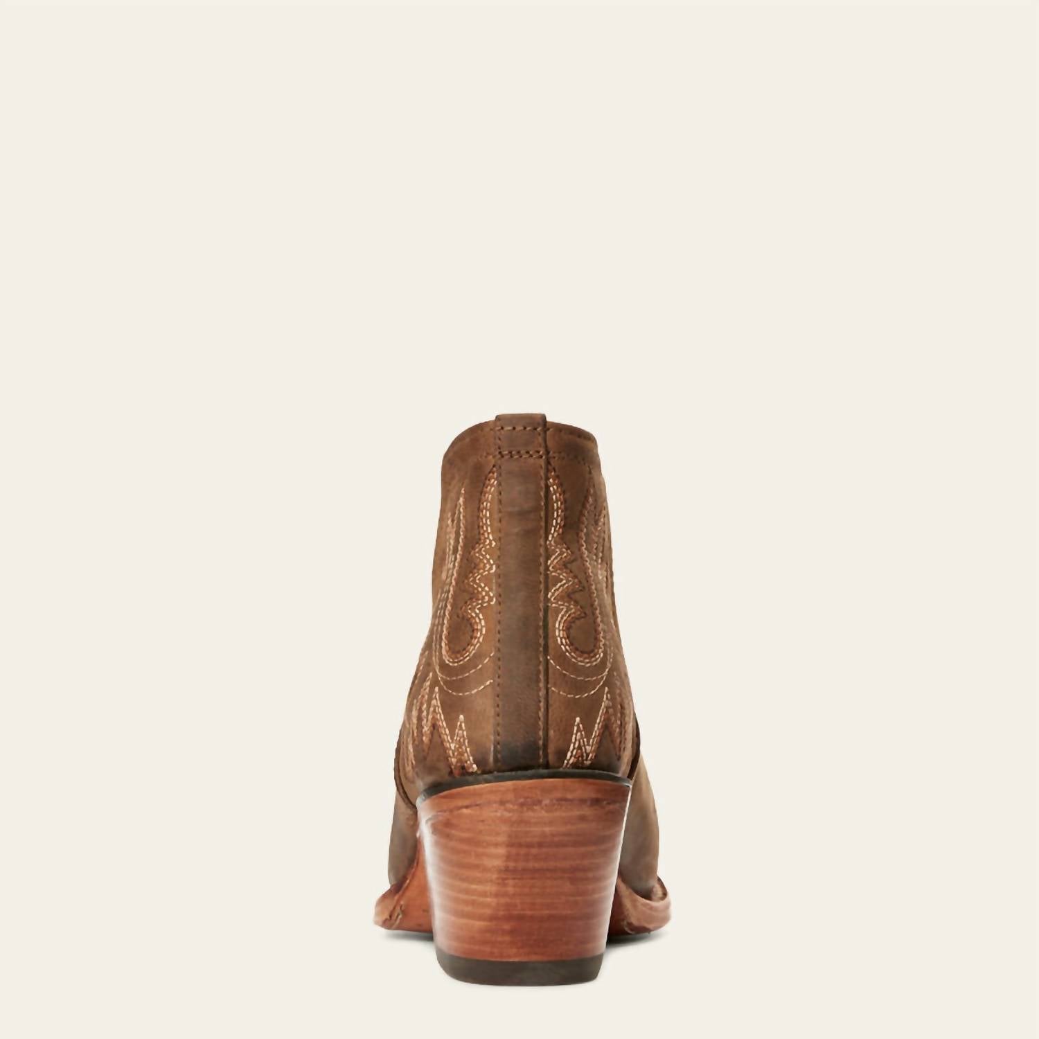 Step out in style with the Women's Dixon Bootie High Heel by ARIAT, crafted from premium weathered brown leather for a rustic yet fashionable look. This ankle boot features a pointed toe and boasts a block heel, offering a mid-range height of 2.5 inches perfect for a trendy Western vibe. Ideal for summer style versatility, it's designed exclusively for women with a flair for fashion-forward footwear.