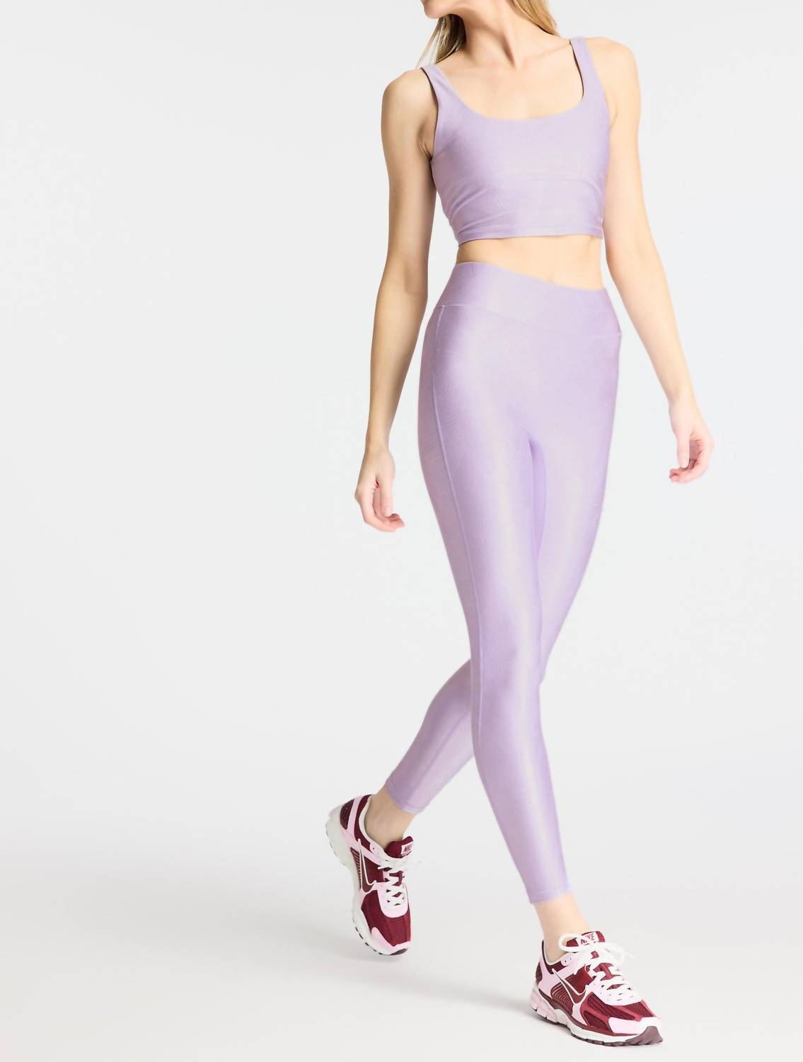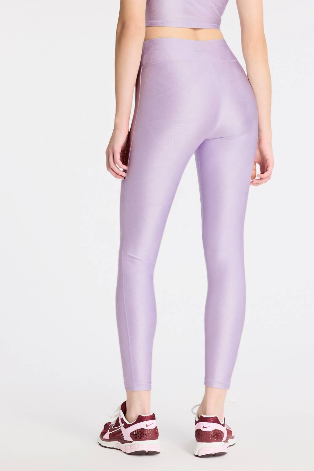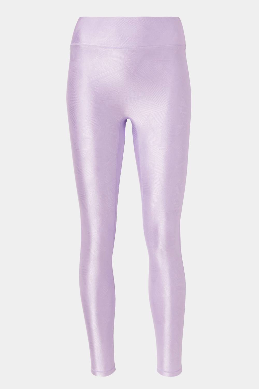 Introducing the Center Stage Geo Jacquard Legging by BANDIER, designed to take your workout to new heights in a sophisticated Lilac Haze hue. These leggings feature a high-waisted design with an extra-wide waistband, ensuring comfort and support without a front center seam. Composition: 73% Nylon, 27% Spandex. With a pull-on closure, these leggings are easy to wear and boast moisture-wicking and quick-drying properties to keep you cool and dry during any workout. Care: Machine washable and safe for tumble drying. The inseam measures 26.25 inches, fitting perfectly for fitness enthusiasts looking for sleek, squat-proof style.
