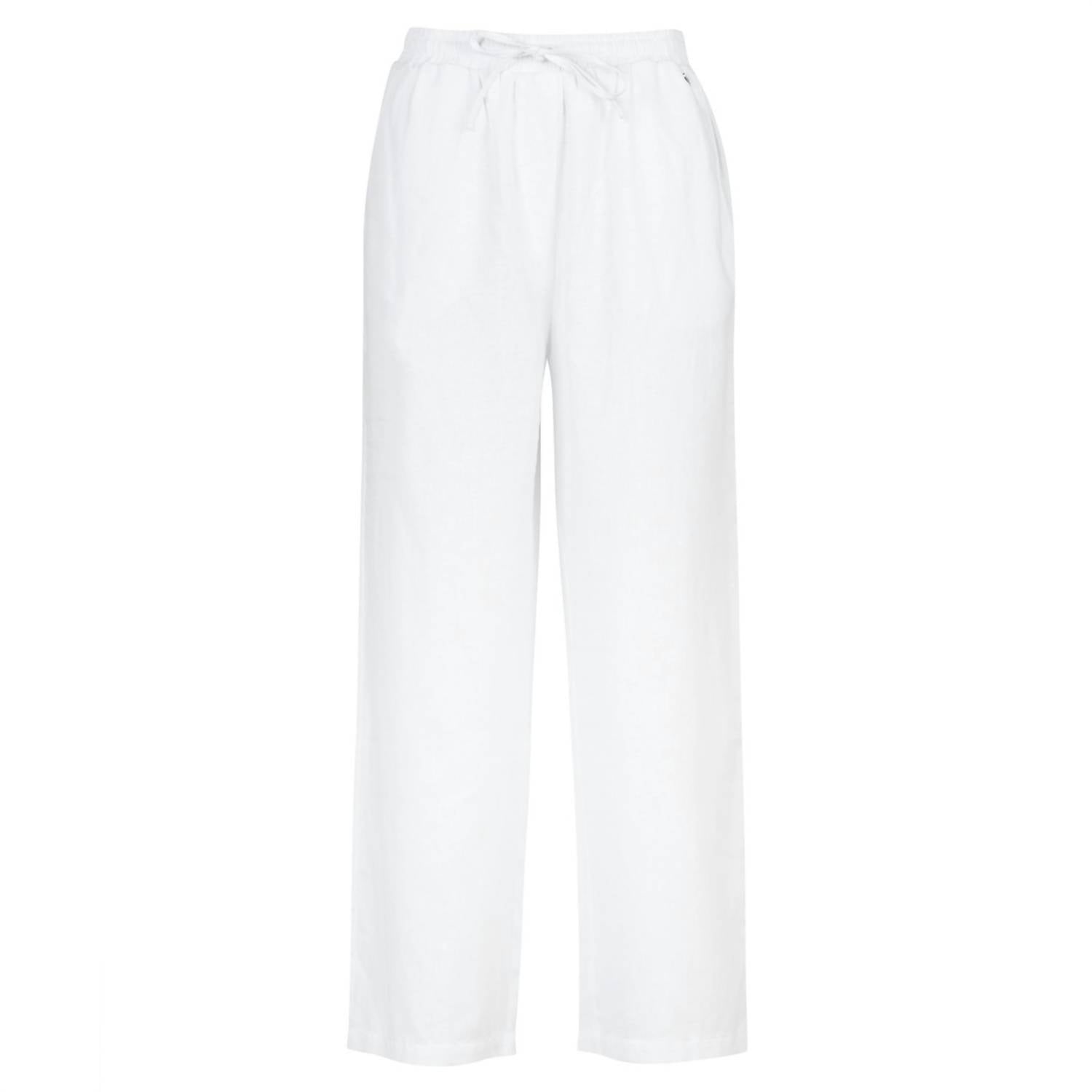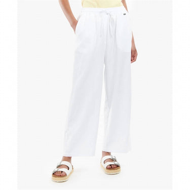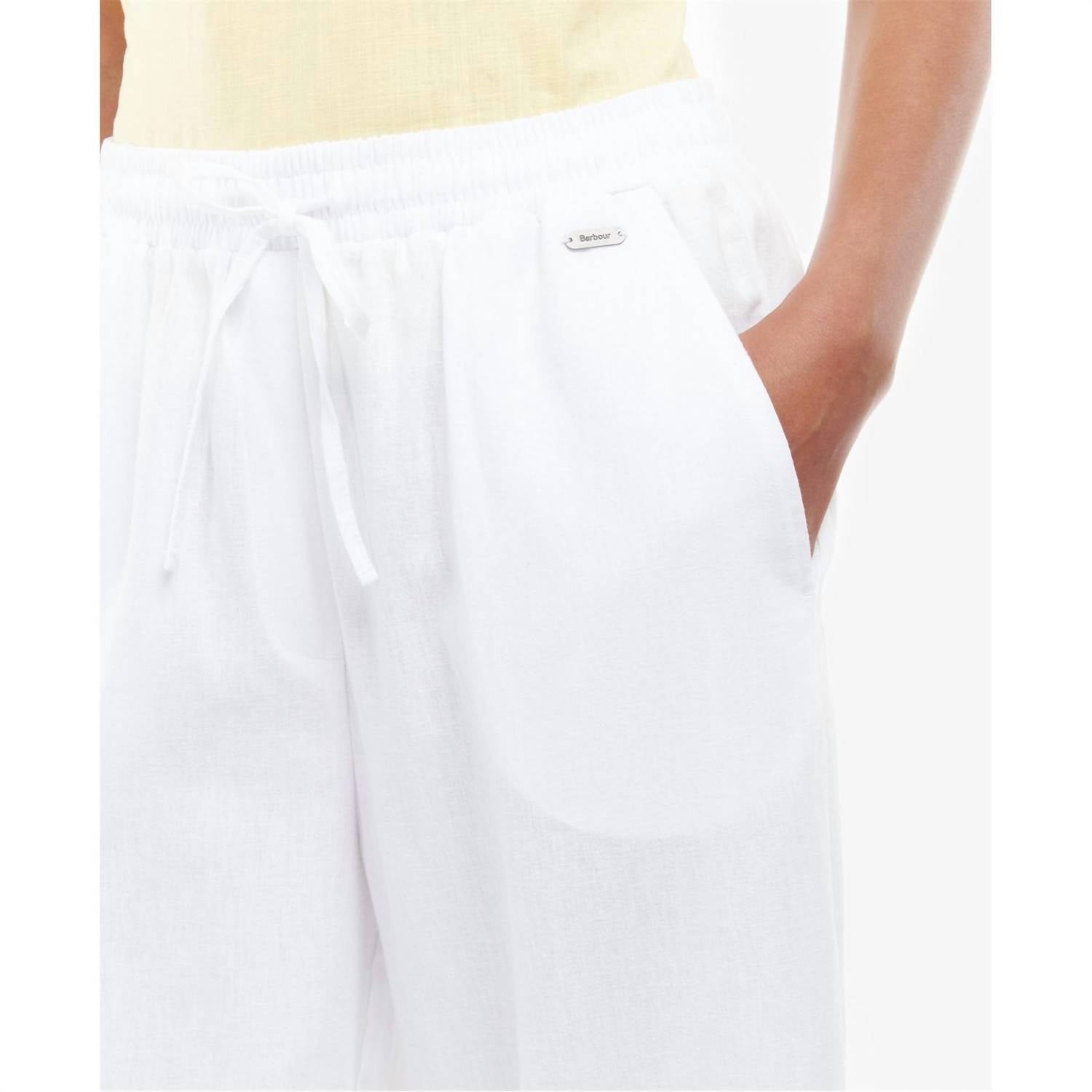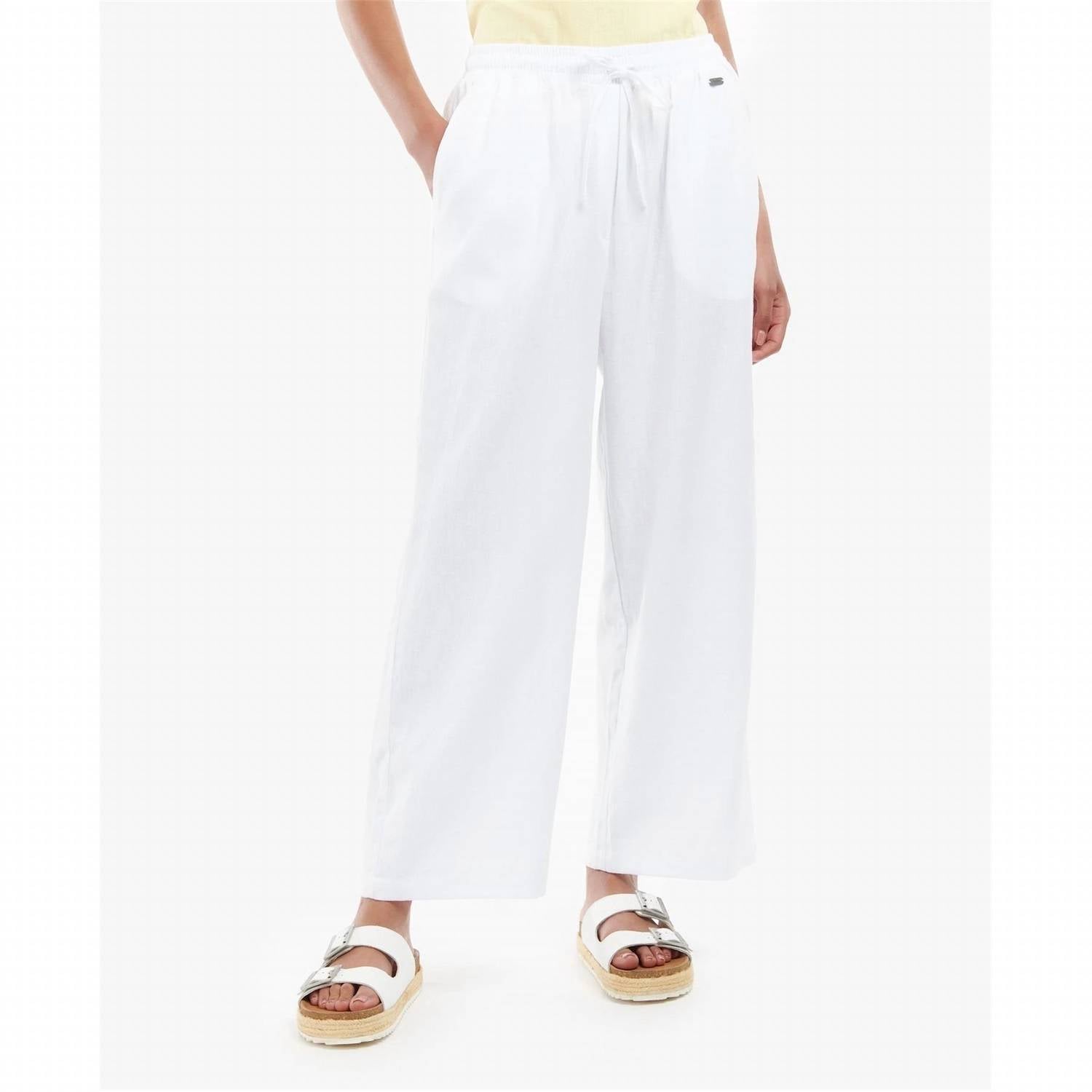 Experience ultimate comfort with the Christie Trousers by Barbour, made from a breathable blend of 70% cotton and 30% linen. Designed for women, these white, wide-leg trousers feature a relaxed fit and high-rise waist, enhanced by an elasticated waistband and drawcords for a customizable fit. With a convenient pull-on closure, these solid-pattern trousers effortlessly blend style with ease. Perfect for summer, they include functional pockets and are easy to maintain with machine wash care.