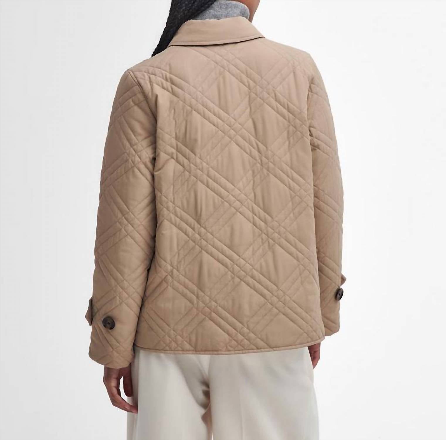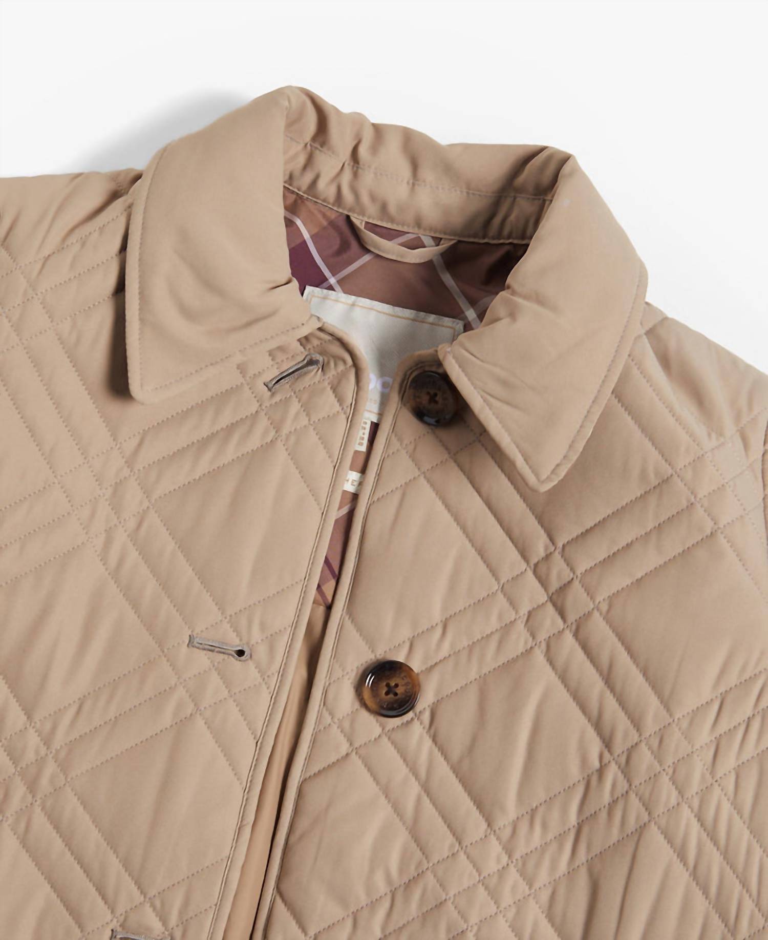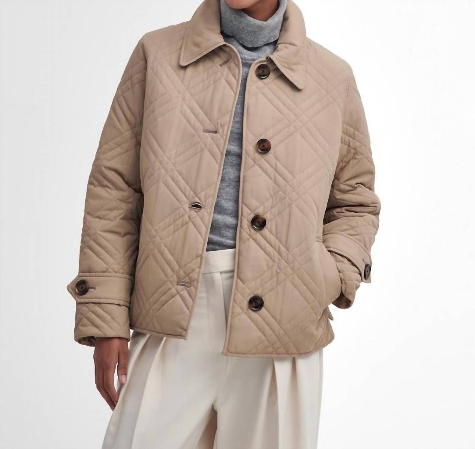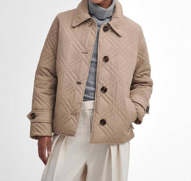 Experience the blend of functionality and style with the Walton Quilted Jacket by Barbour, presented in a chic Honey/Muted Cabernet Tartan. This elegant casual jacket features long sleeves with button-tab cuffs, and a spread collar adding a classic touch. Crafted from durable polyester, its quilted design enhances warmth, while button closures and two front welt pockets ensure practicality. Perfect for women who value both comfort and sophistication, it is conveniently machine washable.