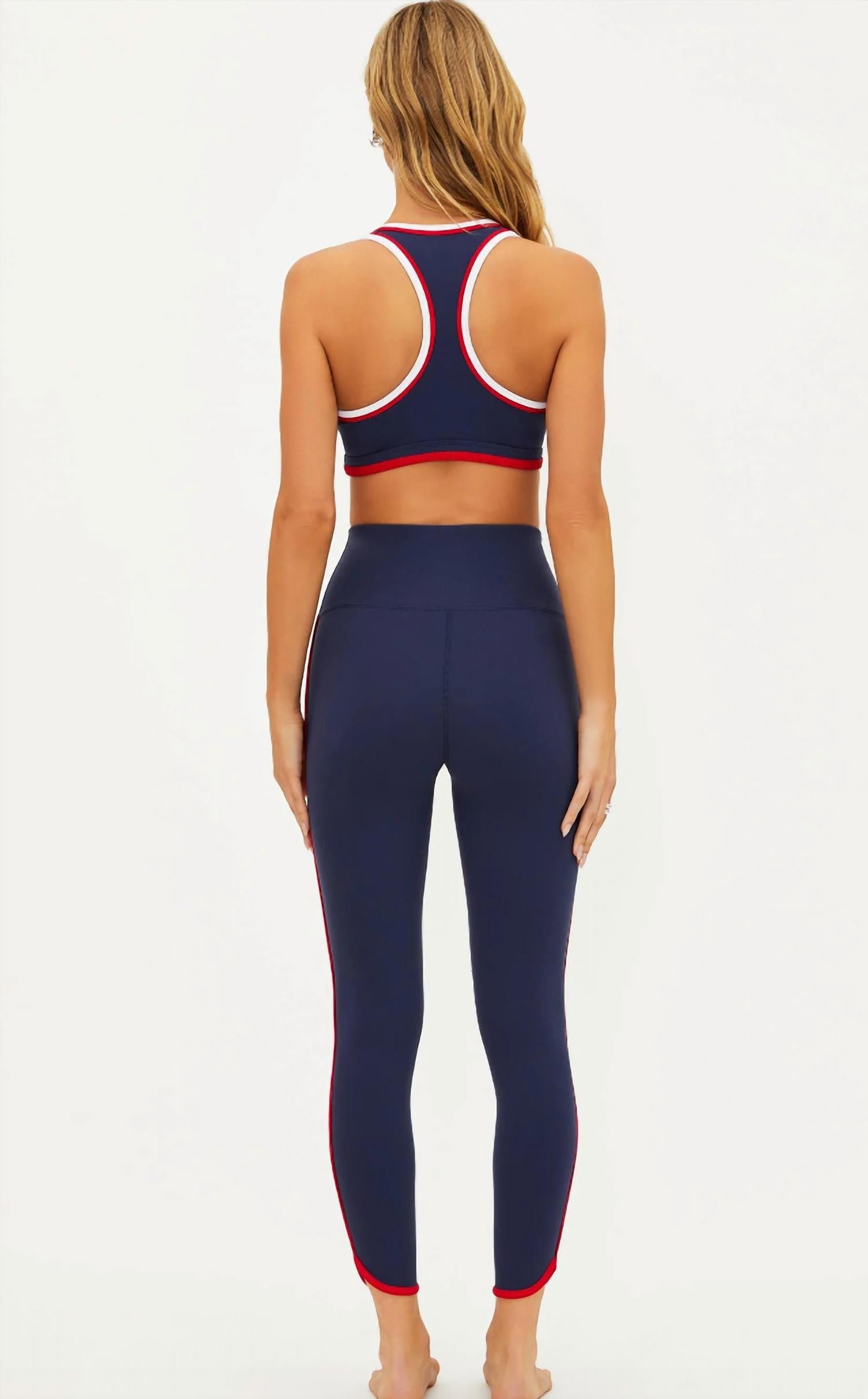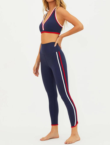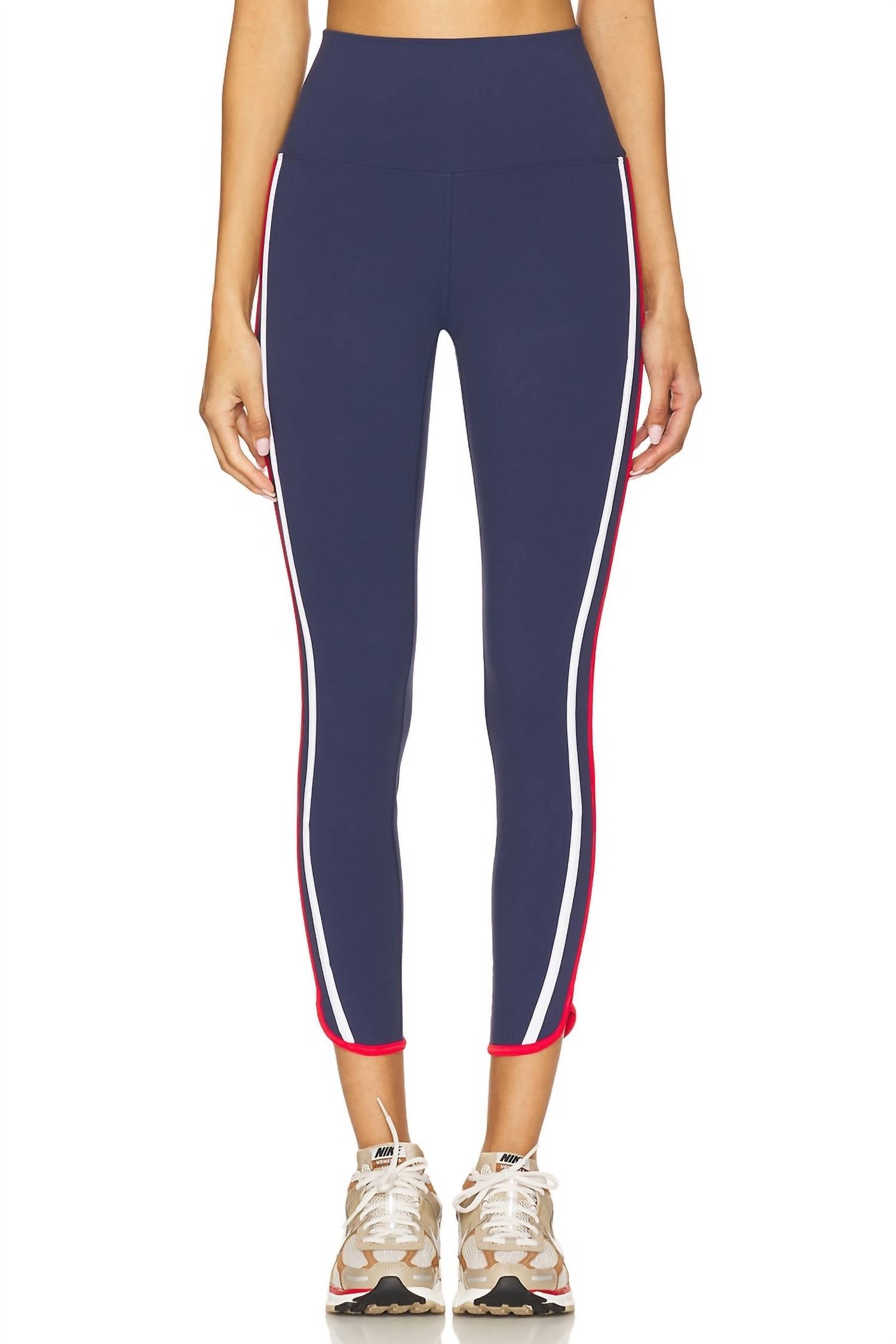 Step into summer with the Americana Colorblock Nella Active Leggings by Beach Riot, designed to keep you stylish during your workout. These high-rise, slim fit leggings feature a 7/8 length with a 25" inseam, crafted from a moisture-wicking matte core fabric composed of 70% Nylon and 30% Lycra. The ultra-soft fabric has a pull-on closure and a chic stripe pattern for a trendy athleisure look. Care instructions recommend hand washing and laying flat to dry, ensuring longevity for your activewear essentials. Model is wearing a size small.