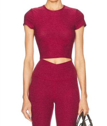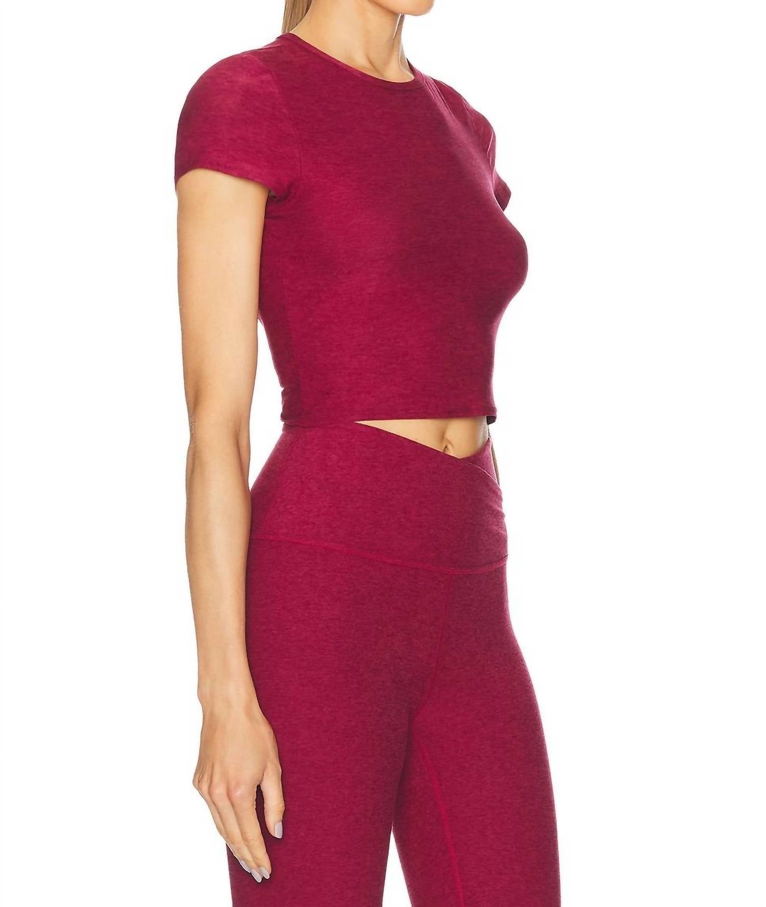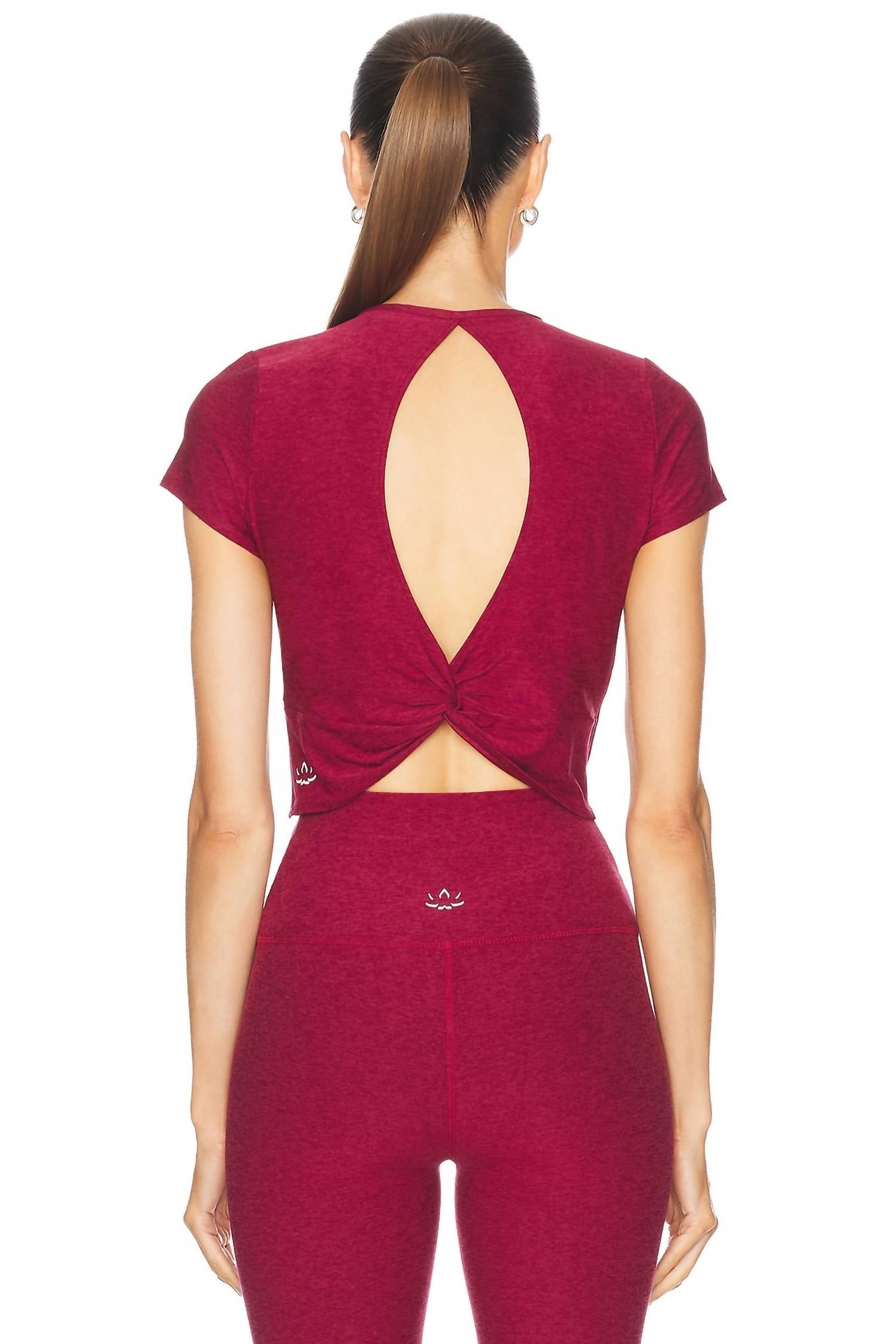 Pair this crop top with your favorite high-waisted jeans or maxi skirt. Introducing the Featherweight Let Go Twist Back Cropped Top by BEYOND YOGA in a stunning Bordeaux Heather hue, designed to add flair to your evening events. This short-sleeve top, crafted from 94% polyester and 6% elastane, showcases a back twist detail with a keyhole for a stylish touch. Its pull-on closure and crewneck design offer comfort, while the cropped length flatters every shape. Care for it easily with a machine wash to keep it looking fresh.