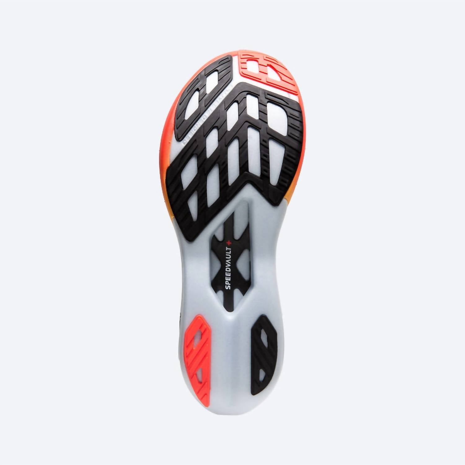 Workout in style with these adorable athletic sneakers. Step up your race game with the Unisex Hyperion Elite 4 by Brooks, crafted for runners aiming to shatter personal records across 5K to marathon distances. These lightweight road running shoes feature advanced cushioning and a carbon fiber propulsion plate to maximize impact absorption and forward thrust. Enhanced breathability is achieved through a newly designed upper, while a narrow fit ensures tailored comfort. The vibrant 488 Illusion Blue, coral, and orange colorway ensures you stand out with every stride.