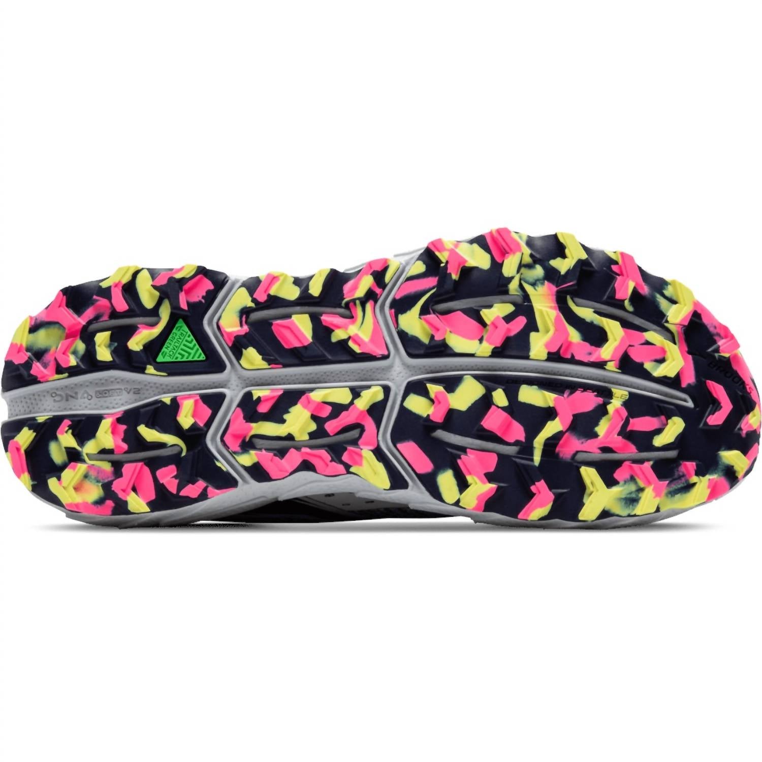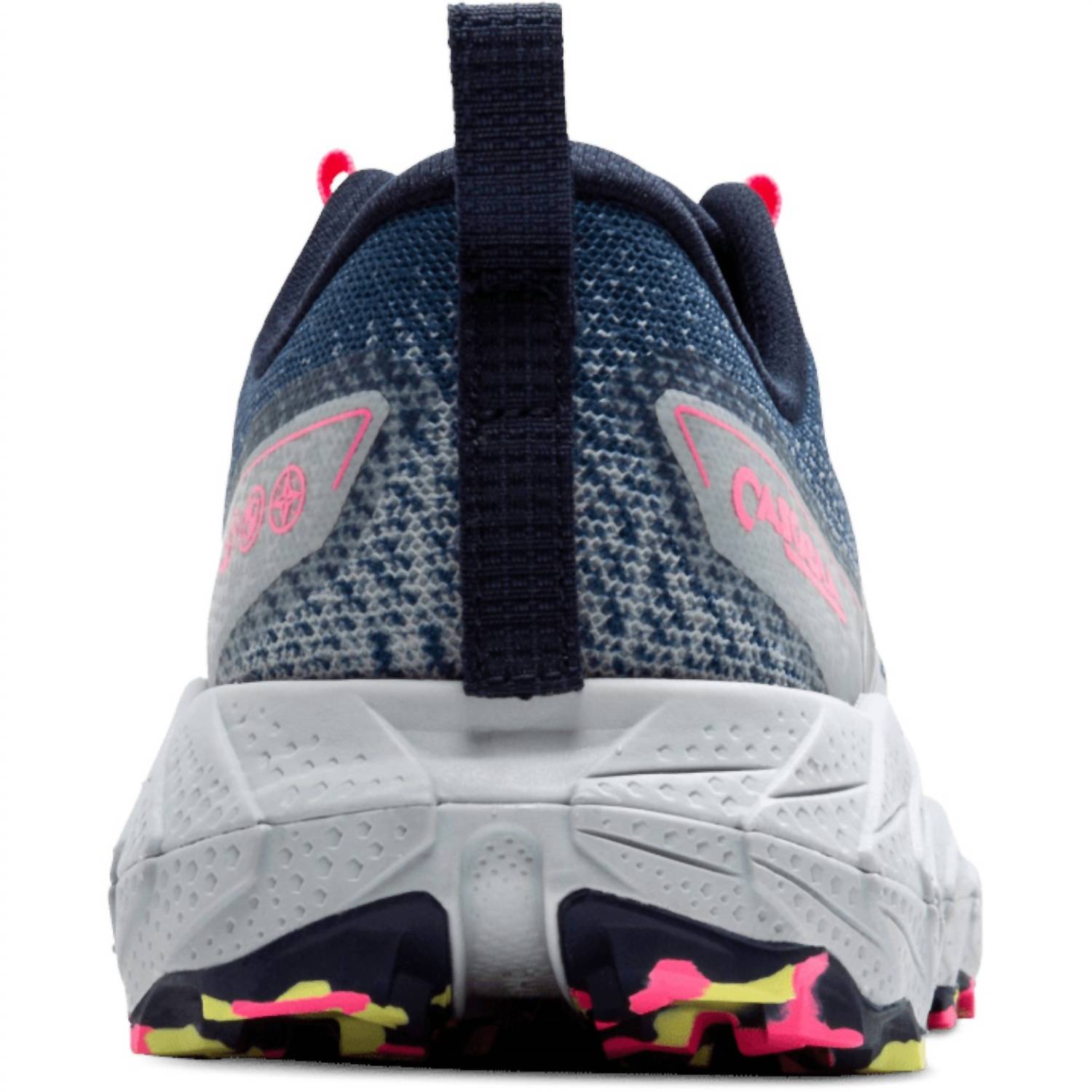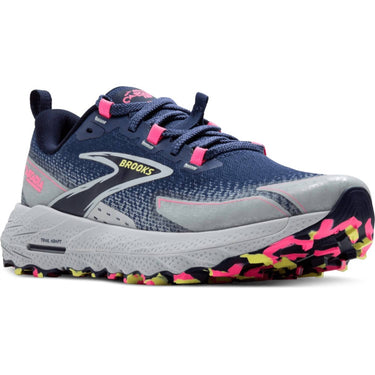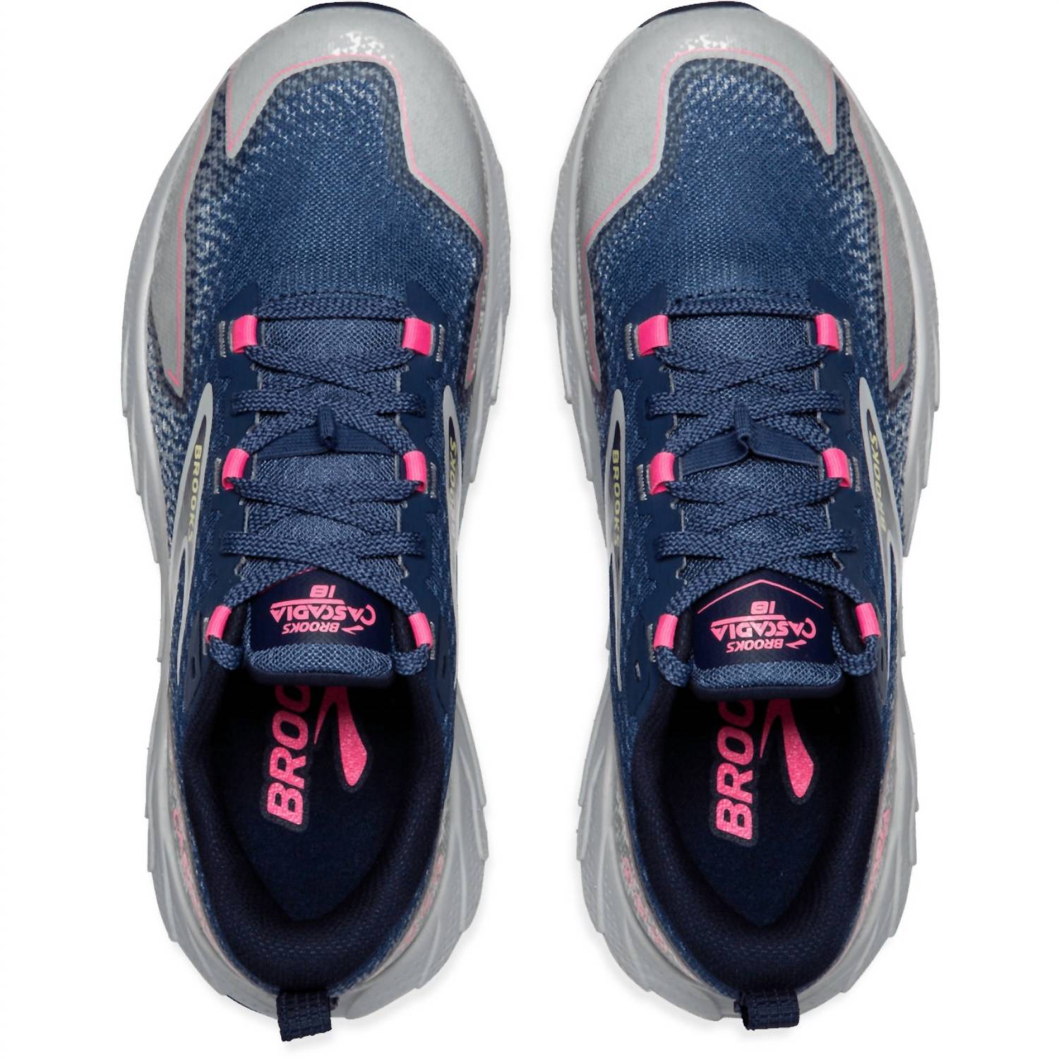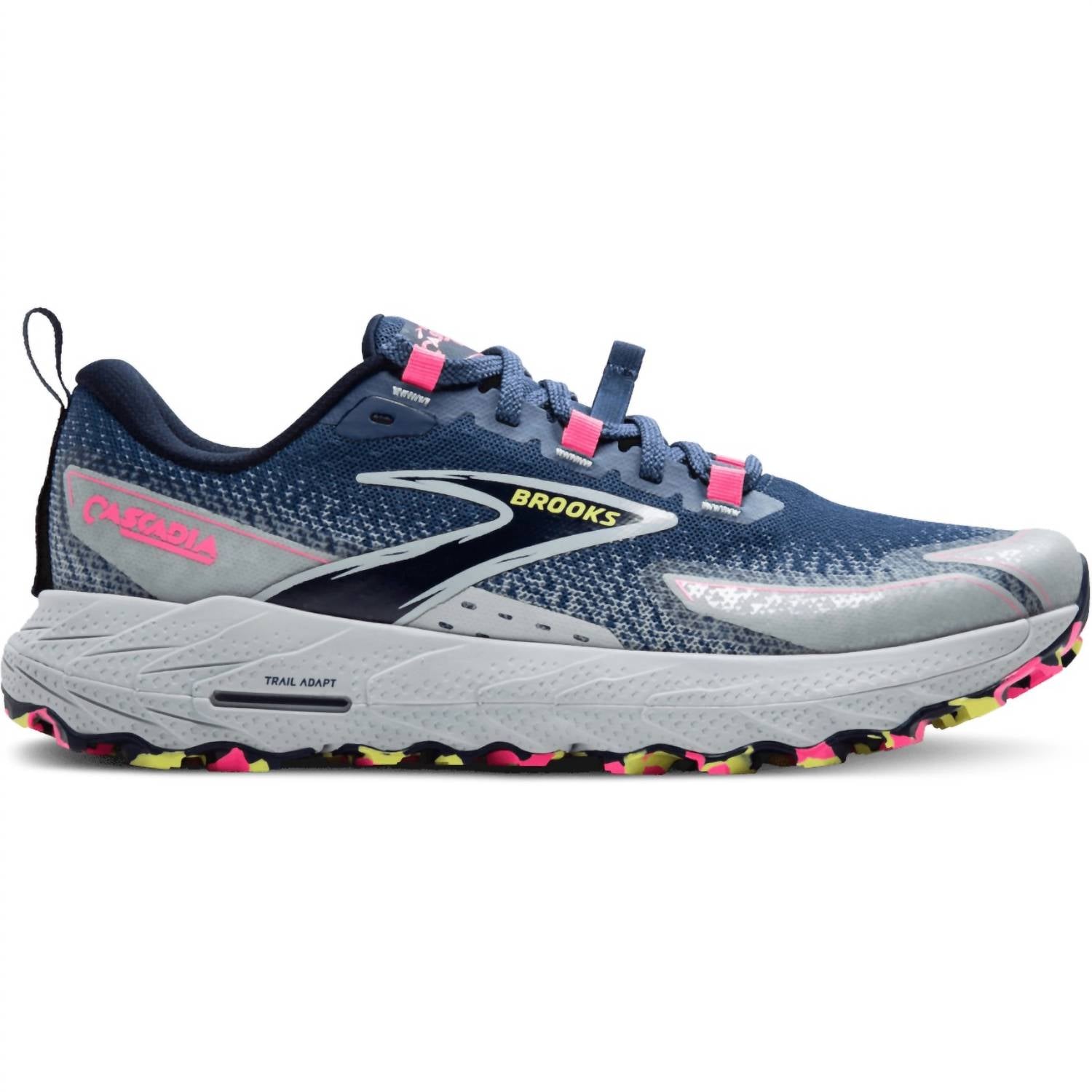 Introducing the Brooks Women's Cascadia 18 Shoes, crafted for those who crave adaptable stability and trail-ready protection. Designed in a chic Oceana/Pearl Blue/Pink color scheme, these athletic shoes feature a unique Trail Adapt System. The system integrates a midsole, rock shield, and zonal outsole pods to provide enhanced control and stability, while the DNA LOFT v2 cushioning ensures a soft impact with every step. Ideal for fitness and workout occasions, the TrailTack Green outsole rubber offers excellent traction on both wet and dry surfaces.