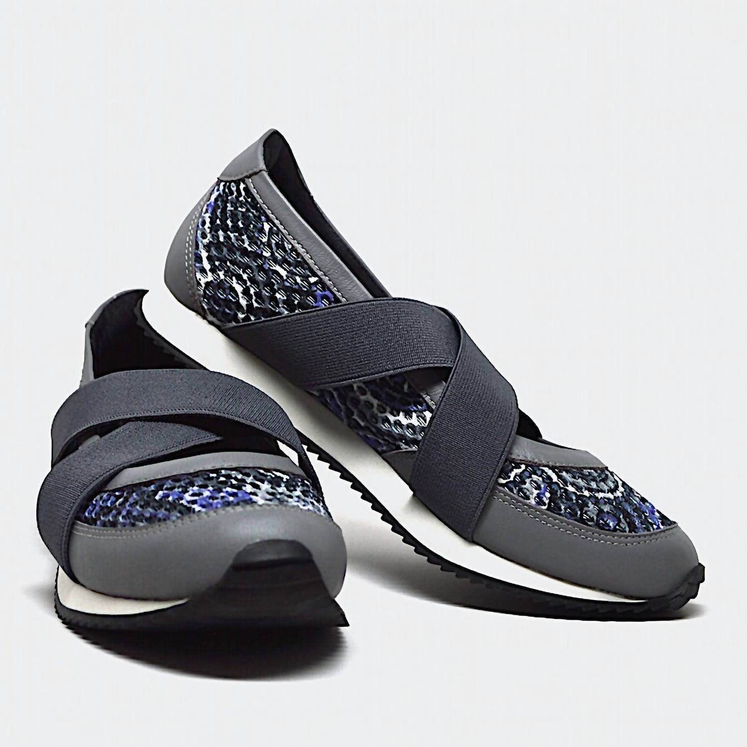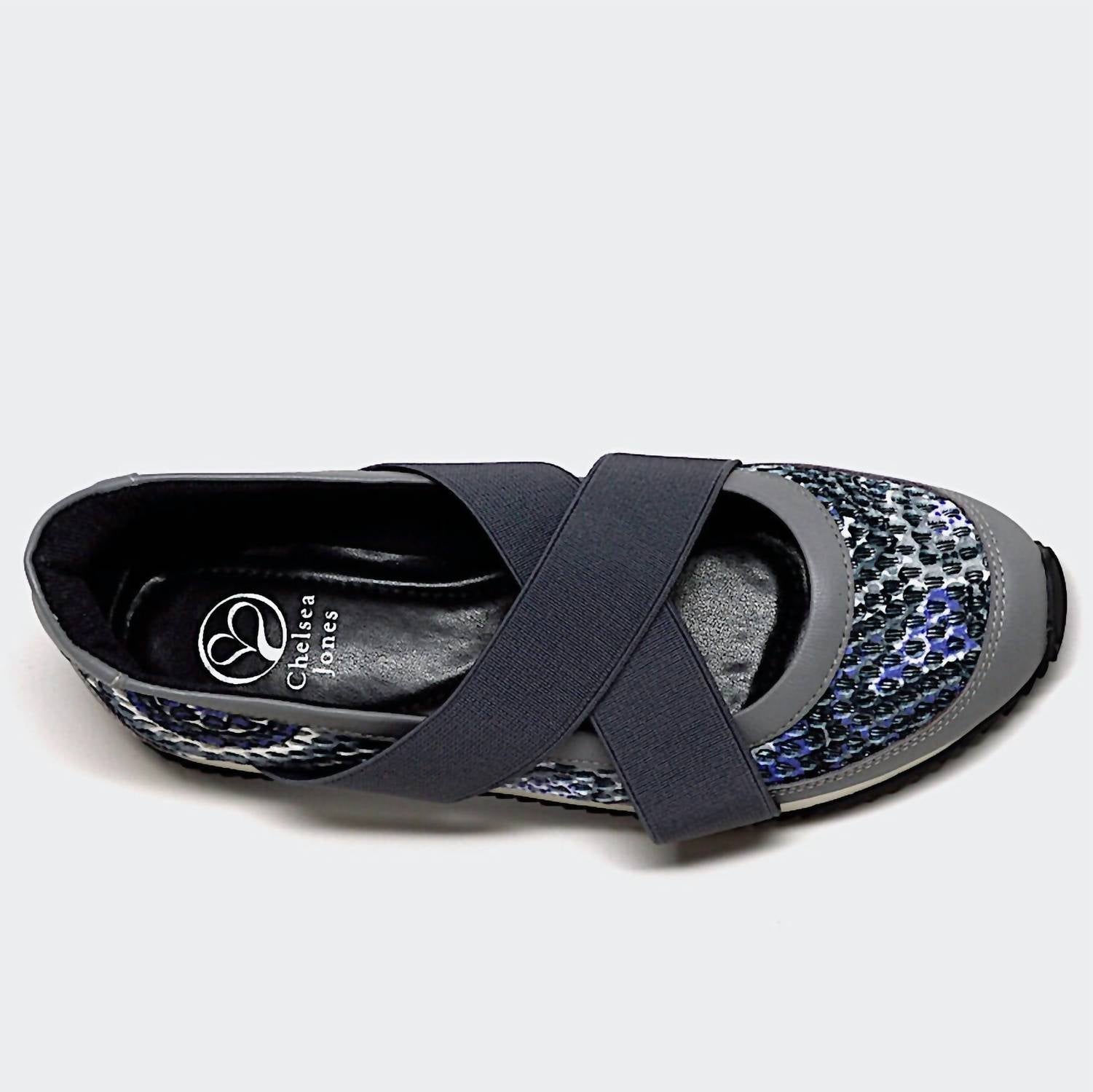 Introducing the Women's Tuck Walking Shoes by Chelsea Jones, a perfect blend of style and functionality for your summer adventures. With a sophisticated mesh and leather upper in grey leather and purple mesh, these sneakers feature elastic cross-straps for a secure fit. They rest on a comfortable 1" platform with a traction rubber sole, ideal for fitness and workout occasions. Crafted with care in Brazil, these shoes embody the athleisure trend with a chic round toe design.