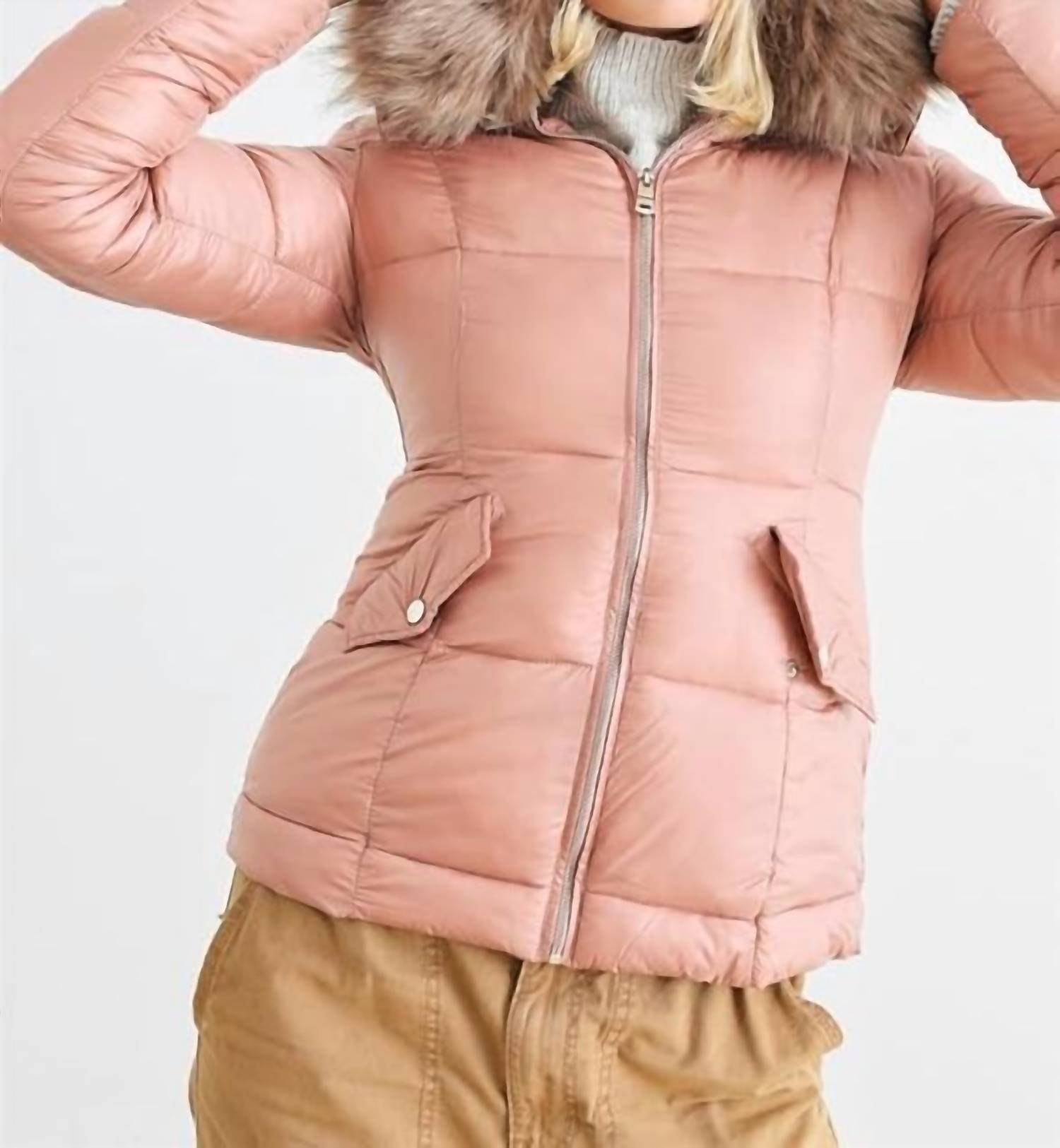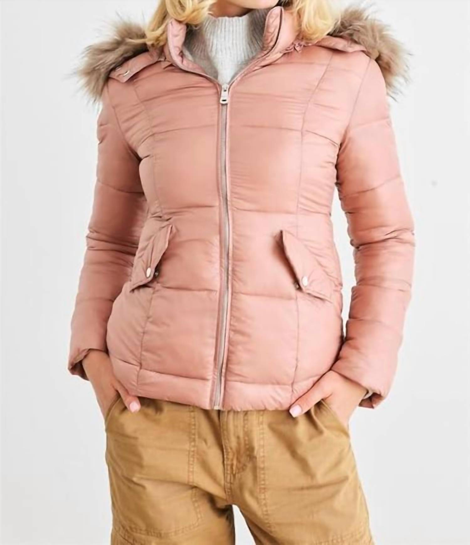 Cozy, cute and timeless. The puffer jacket that will keep you warm all season long. Discover warmth and style with the Coalition LA Faux Fur Water Resistant Jacket in a chic mauve hue. This long sleeve jacket features a faux fur-lined detachable hood and trim, providing extra insulation against harsh weather. Crafted from 100% polyester with a zip closure and designed for winter sports like snowboarding and skiing, its water-resistant finish and padded design combine functionality with fashion. Item measurements are 25" in length and a 38" bust, and it is true to size. Care: Hand wash for best maintenance.