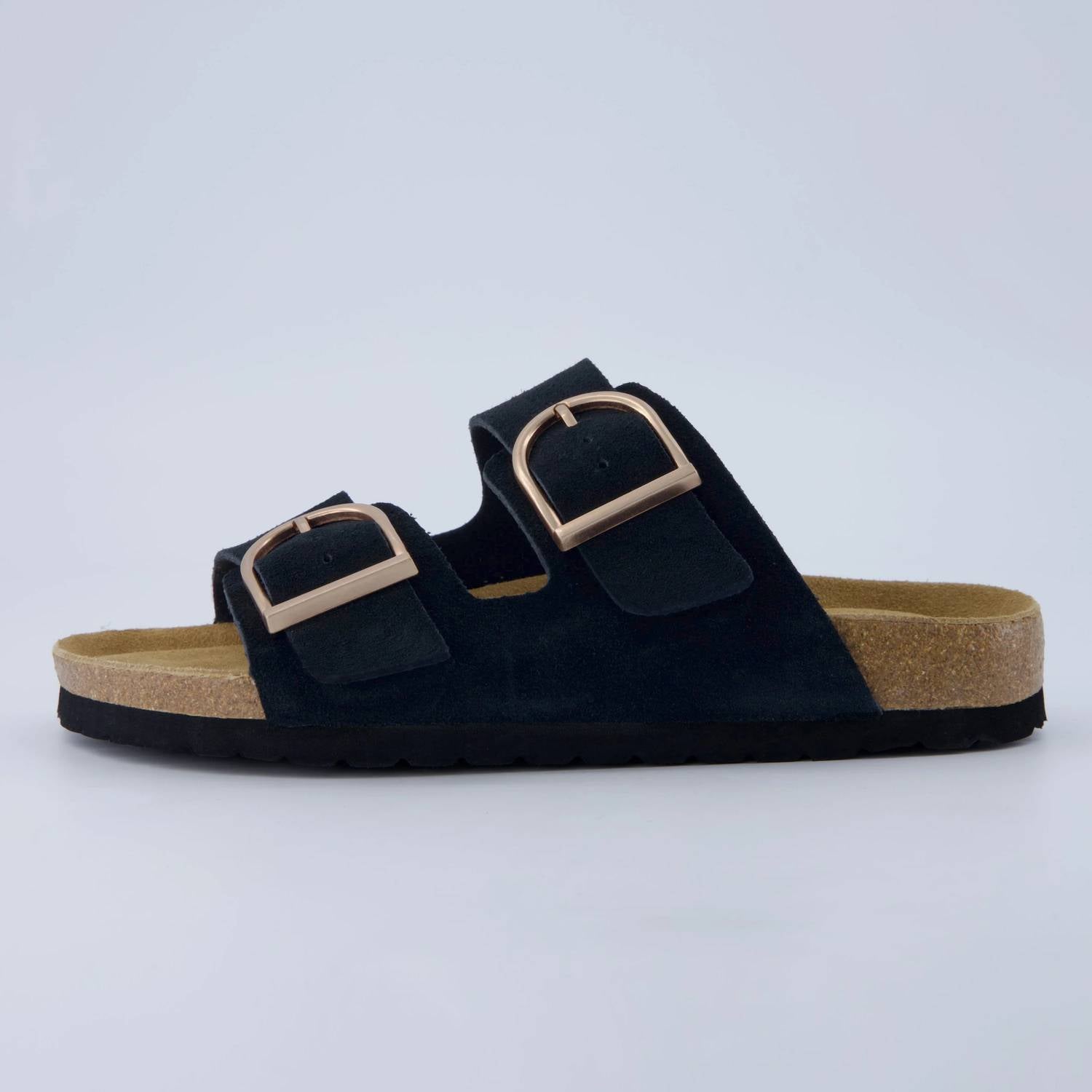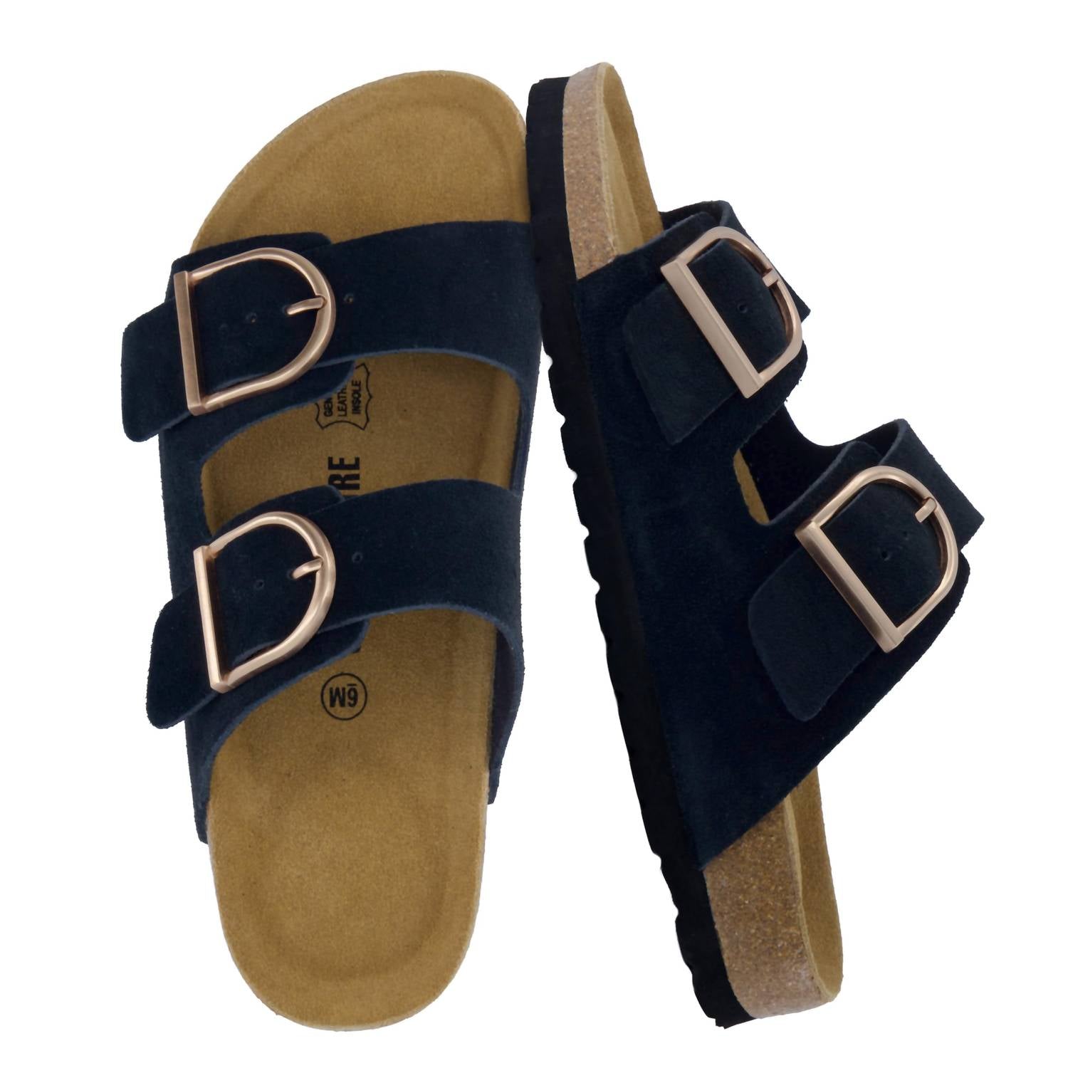 Step into effortless style and comfort with the Women's Legacy Cork Footbed Sandals by Cushionaire, available in sleek black. These sandals boast a genuine suede leather upper combined with adjustable buckle straps and polished gold hardware for chic elegance and wearability. The molded cork footbed is anatomically supportive and enhanced by a memory foam layer for superior cushioning, making it ideal for weekend errands or beach strolls. Perfectly finished with a grippy outsole, these open-toe sandals seamlessly blend style with all-day comfort.