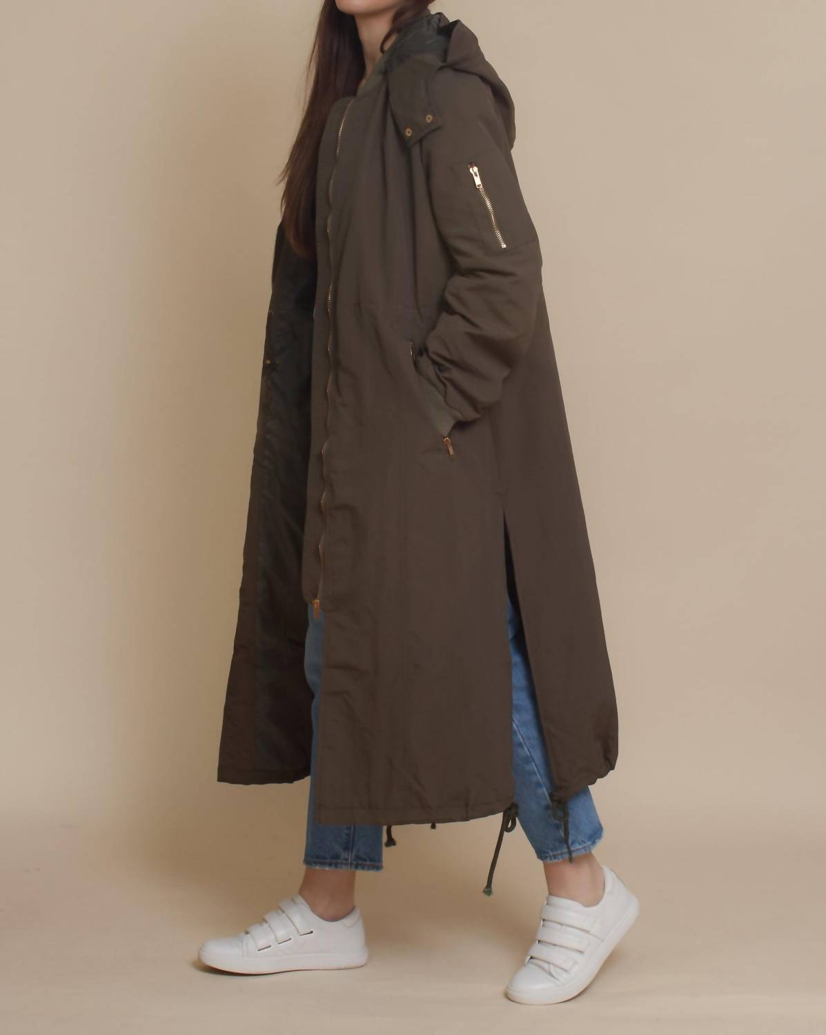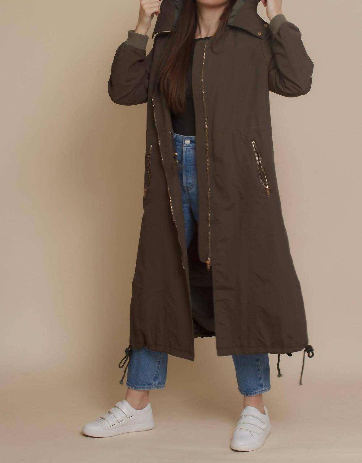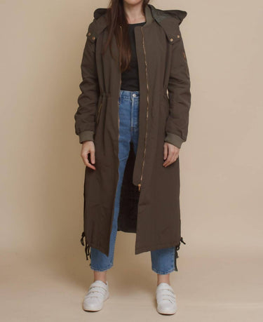 Introducing the Alexa Water Resistant Jacket by Daisy, designed for women who appreciate both style and functionality. This long-sleeve bomber style trench coat in olive features a detachable hood and comes fully lined. Made from 80% polyester and 20% cotton, it boasts a convenient zip closure with gold hardware, completed with side vents, zipper pockets, and a single sleeve pocket for added practicality. The jacket also offers an optional cinched waistline via an inside drawstring, making it a standout piece for winter and vacation occasions in streetwear fashion.