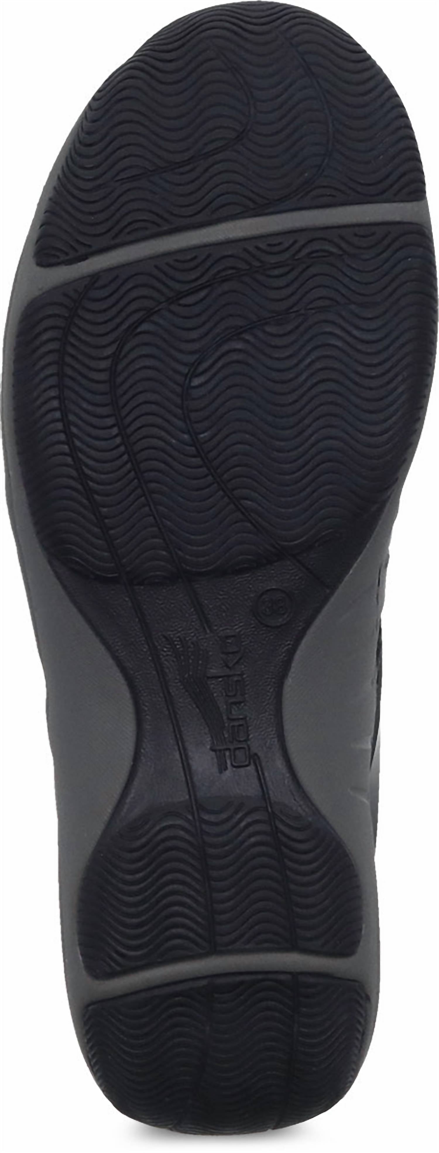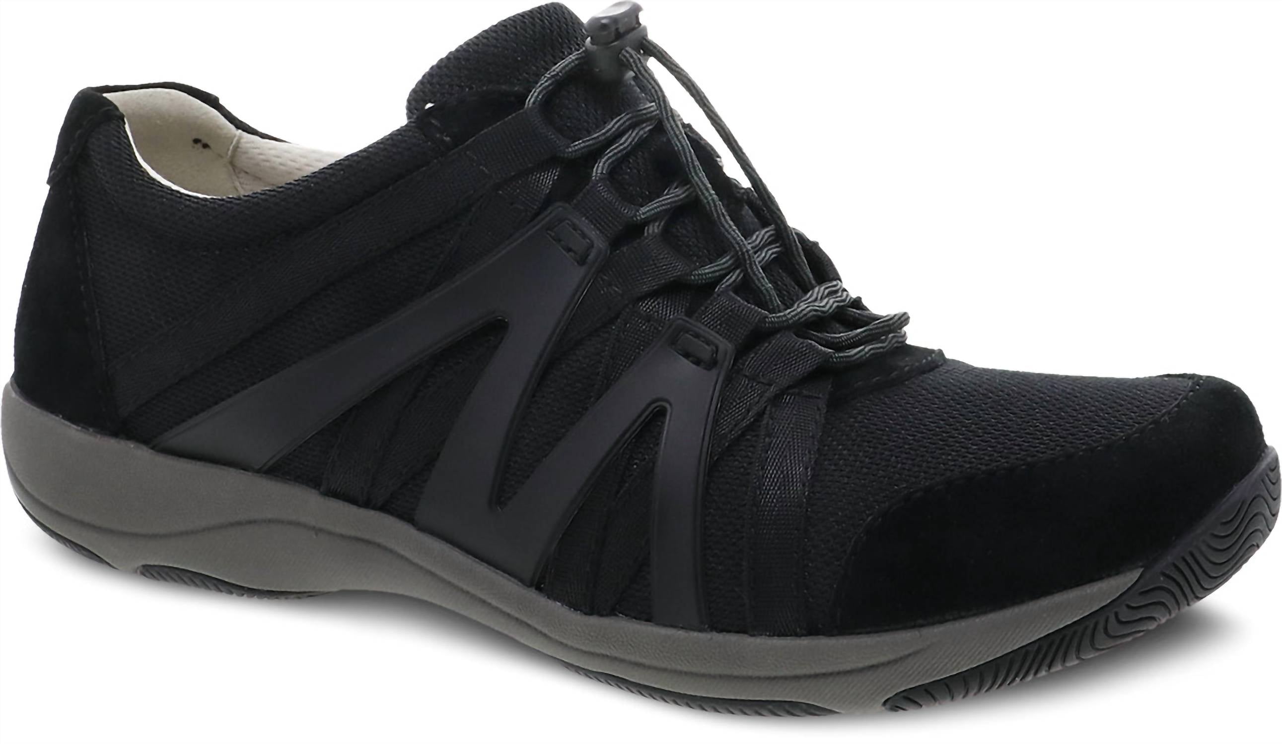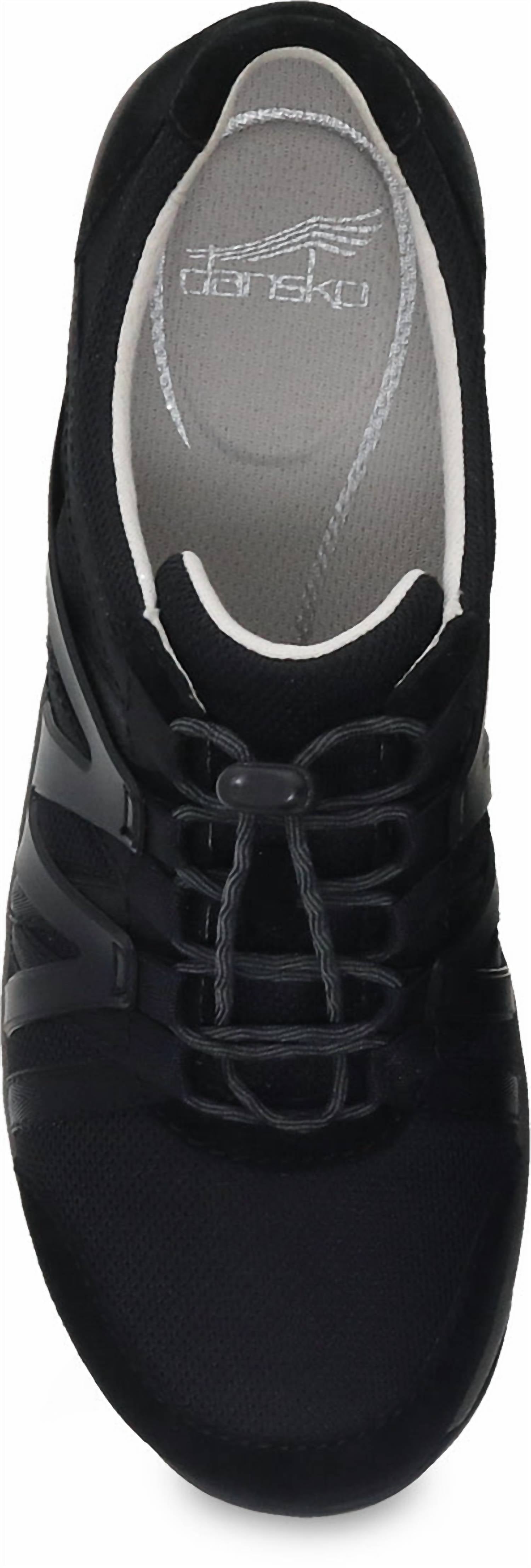 Discover the Women's Henriette Sneakers by Dansko, a stylish choice in classic black for a sporty yet sophisticated look. Crafted with stain-protected chrome-free leather and recycled nylon uppers, these sneakers offer adjustable bungee laces for a personalized fit. The footwear ensures comfort with soft textile linings treated with Aegis® Microbe Shield and a removable PU footbed featuring Dansko Natural Arch™ technology and memory foam. The energy-returning EVA midsole and natural rubber outsole provide long-lasting wear and stability, perfect for all-day comfort and support.