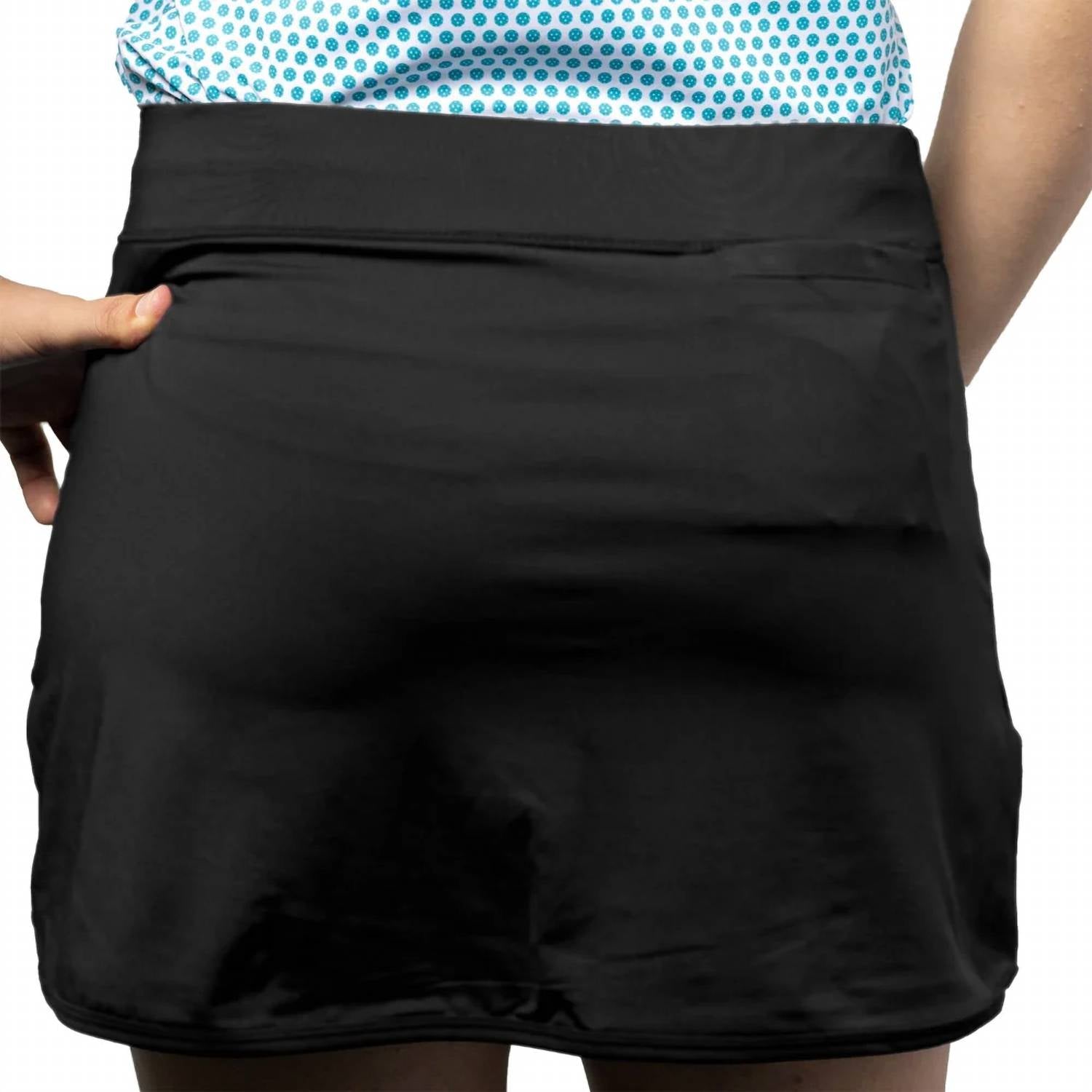 Introducing the Scales Iconic Skort by Diadem Sports, designed for women seeking a seamless blend of style and performance. This black 14” skort is crafted from lightweight, quick-drying material with a solid pattern and enhanced with UV 30+ protection and 4-way stretch for unrestricted movement. Featuring a convenient front pocket and pull-on closure, it effortlessly adapts to active summer days on the golf course or tennis court. Perfect for the athleisure trend, this versatile piece ensures comfort and freedom in every swing without compromising on style.