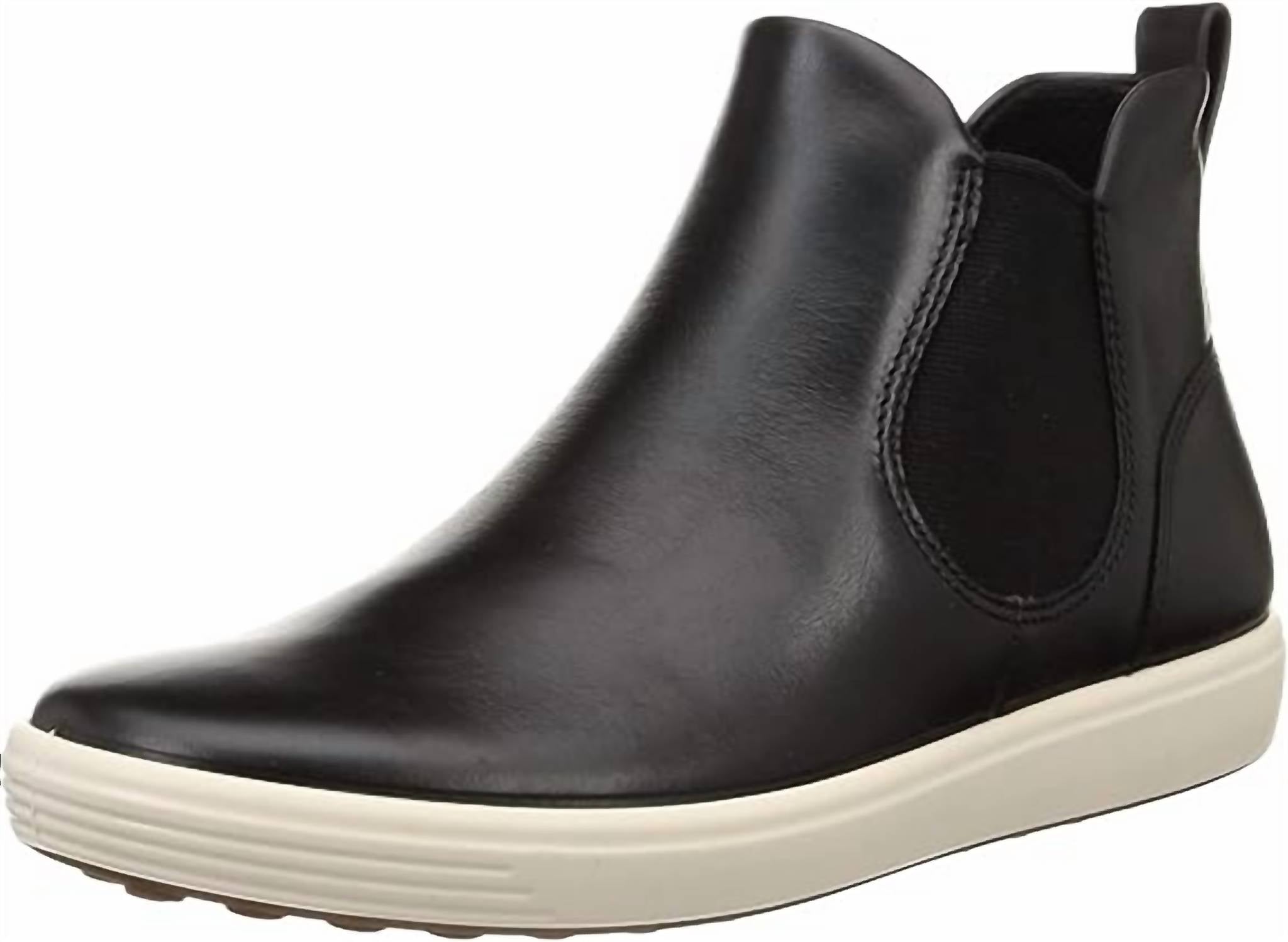 Discover the ECCO Chelsea Ankle Boots, the perfect blend of style and comfort in sleek black leather. These boots feature a two-component PU/TPU outsole, known for being hard-wearing yet light and flexible. The design includes streamlined elastic inserts for easy on-and-off wear, and some styles use leather treated with ECCO's DriTan method, which reduces water and chemical usage. Heel height: Low (1 1/4"-2") with a flat heel style. Originating from a commitment to innovation, the lightweight sole is enhanced by ECCO's FLUIDFORM construction, ensuring superior cushioning and flexibility.