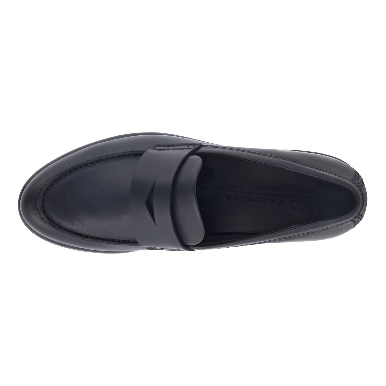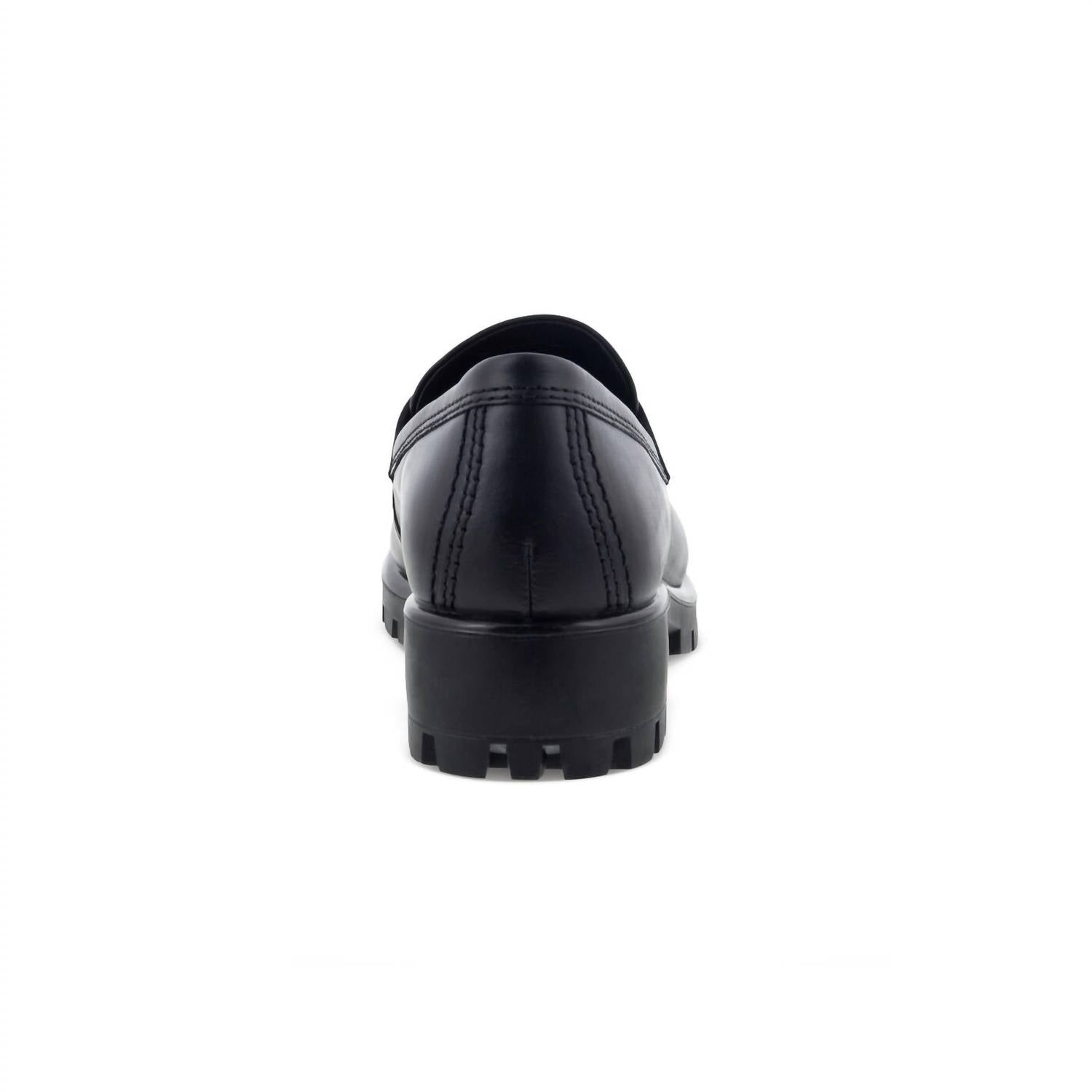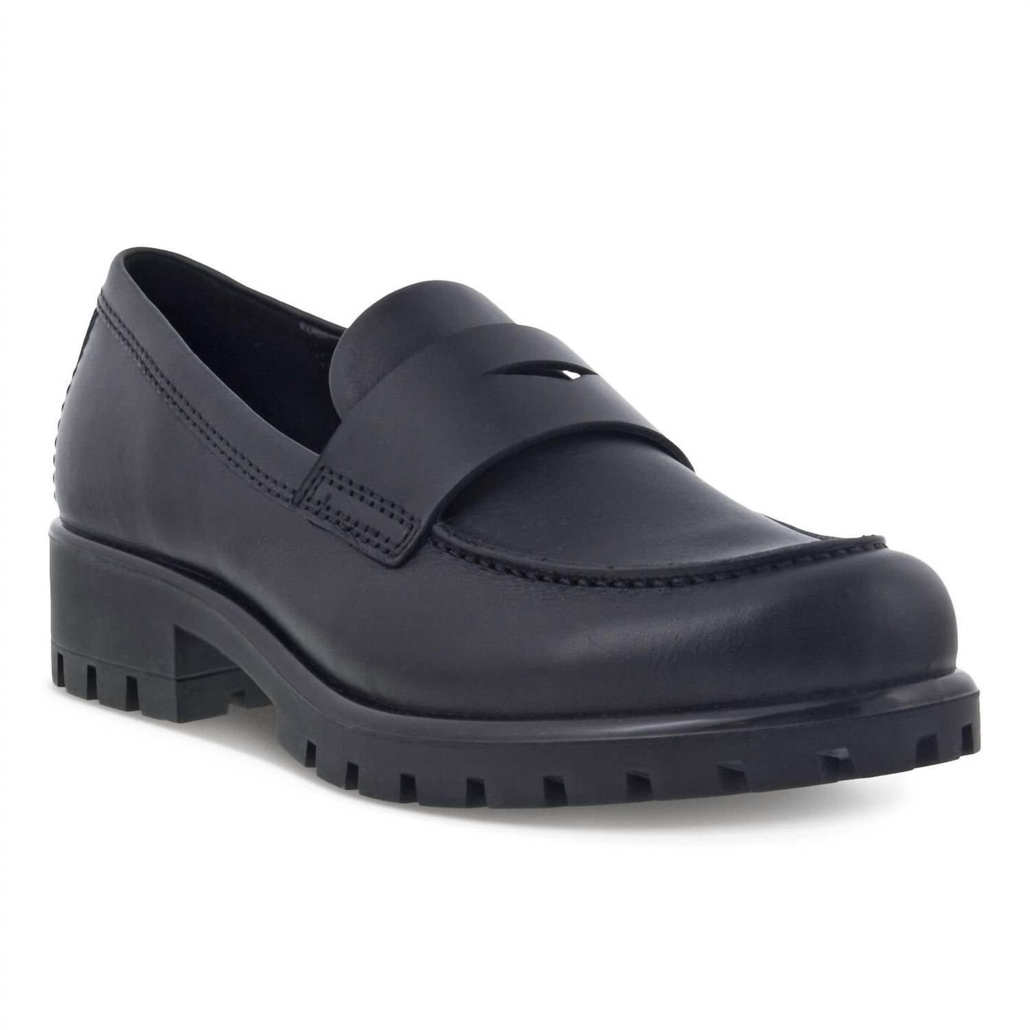 ECCO's Women's Mod Tray Loafer in Black is a sophisticated workwear staple combining edgy moc-toe styling with cutting-edge technology. Crafted from smooth, full-grain leather, these loafers feature a lightweight lugged sole for added cushioning and flexibility courtesy of ECCO FLUIDFORM™ Direct Comfort Technology. This versatile shoe is lined in leather and textile for a luxurious yet breathable experience, and its rubber outsole ensures stability with ECCO TRAYTECH™ Technology. Ideal for travel or everyday office wear, this round toe loafer boasts a polished midsole and removable molded leather inlay sole.