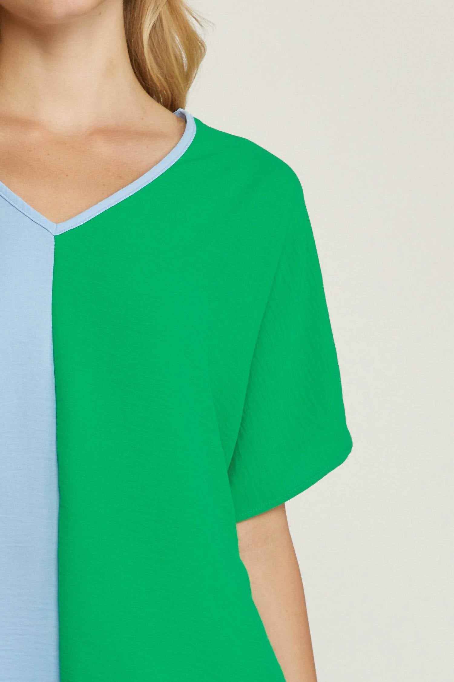 The Color Block V-neck Top by Entro is a chic and comfortable addition to your wardrobe, featuring a trendy mix of green and blue. With short sleeves and an oversized relaxed silhouette, this top is perfect for both work and play. Made from 100% polyester, it's crafted in the USA and offers a pull-on closure. To maintain its vibrant color block design, hand wash or opt for dry cleaning. Available in sizes ranging from Small to 2X with a length of 25" to 31".