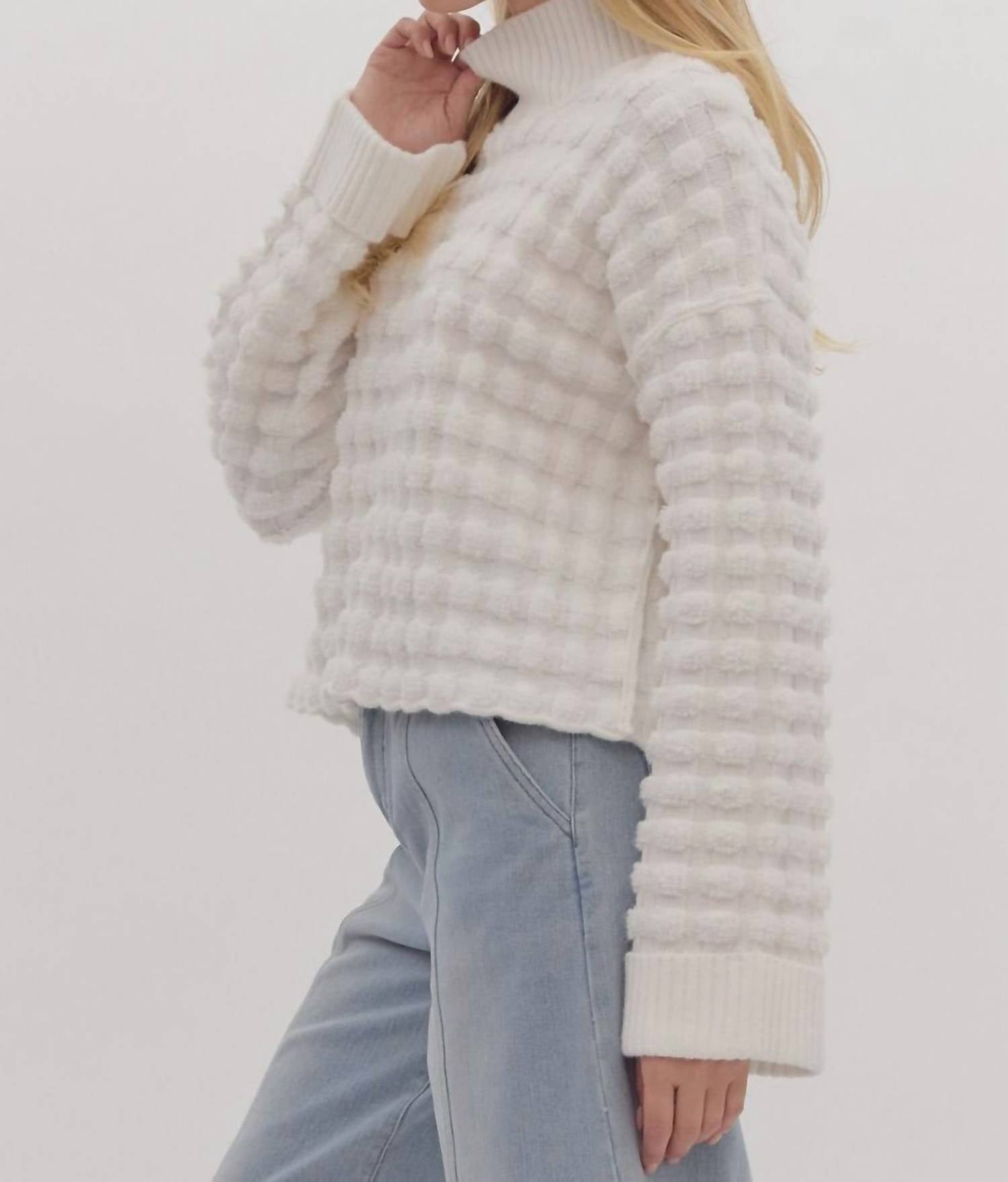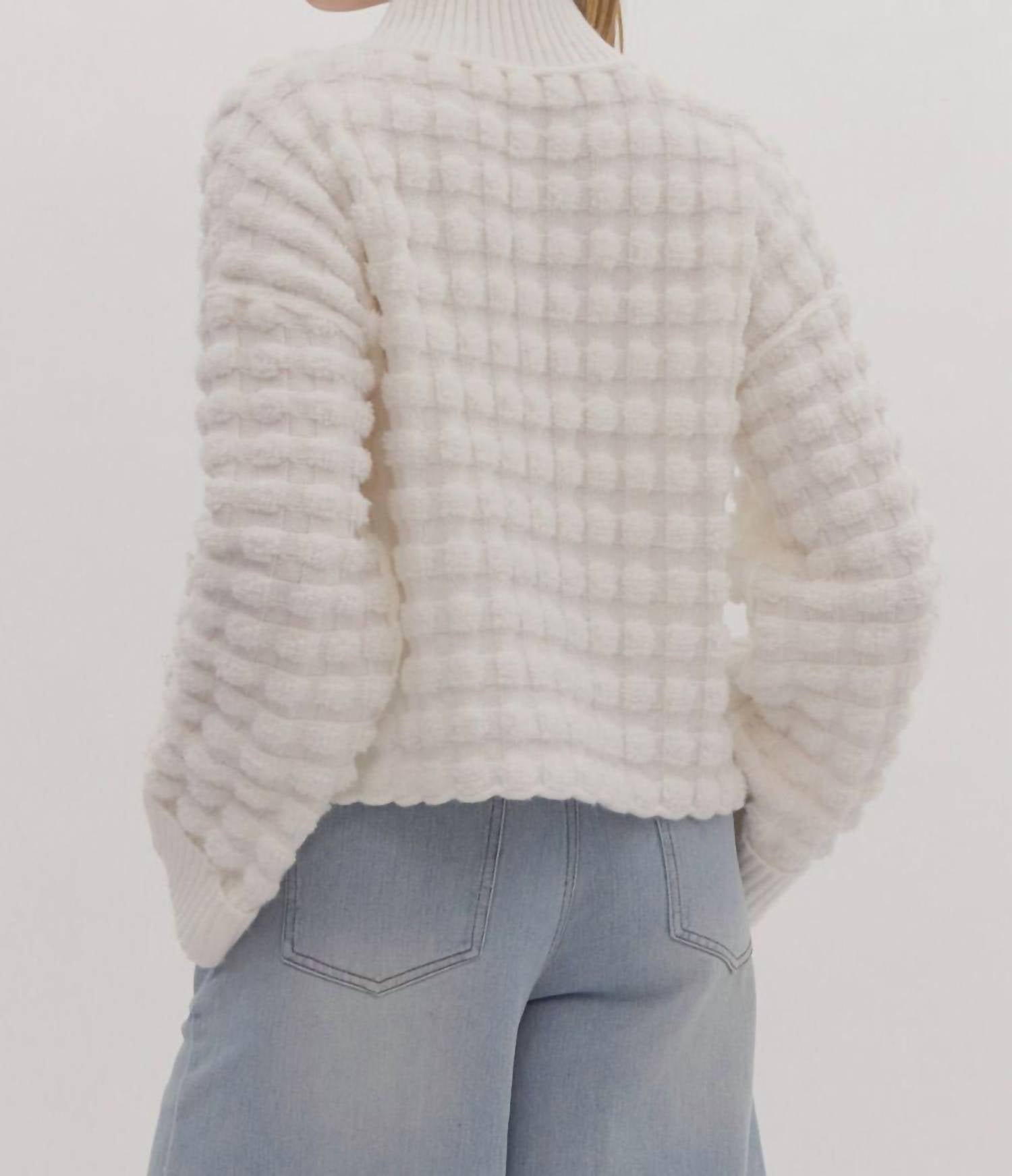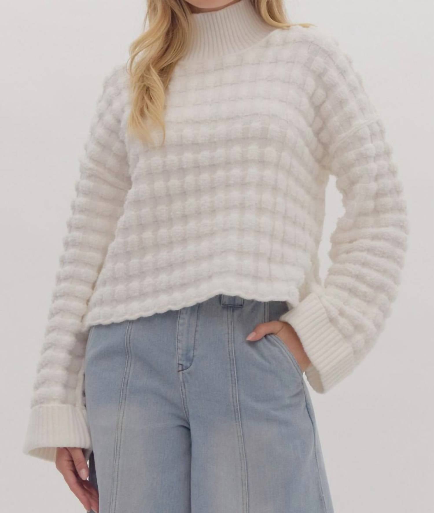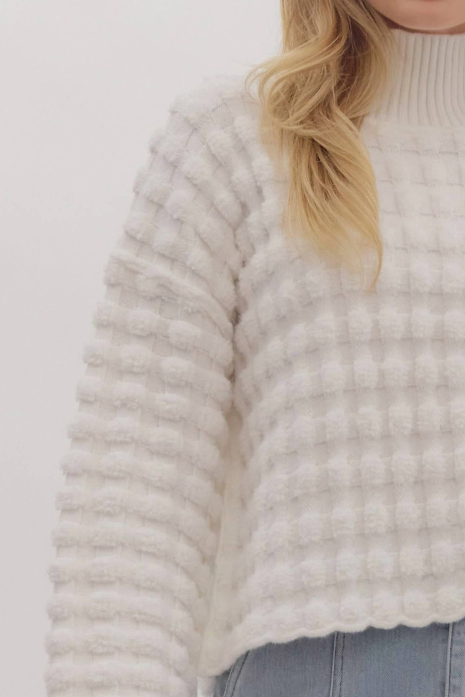 This long sleeve pullover features an all-over textured knit with ribbed detailing at the neck and cuffs, offering a sleek, sculpted fit. Crafted from 52% Acrylic, 28% Nylon, and 20% Polyester, this cropped silhouette is perfect for pairing with high-waisted bottoms. Pull on. Hand wash cold, line dry. Model 5'10" and wearing size Small.