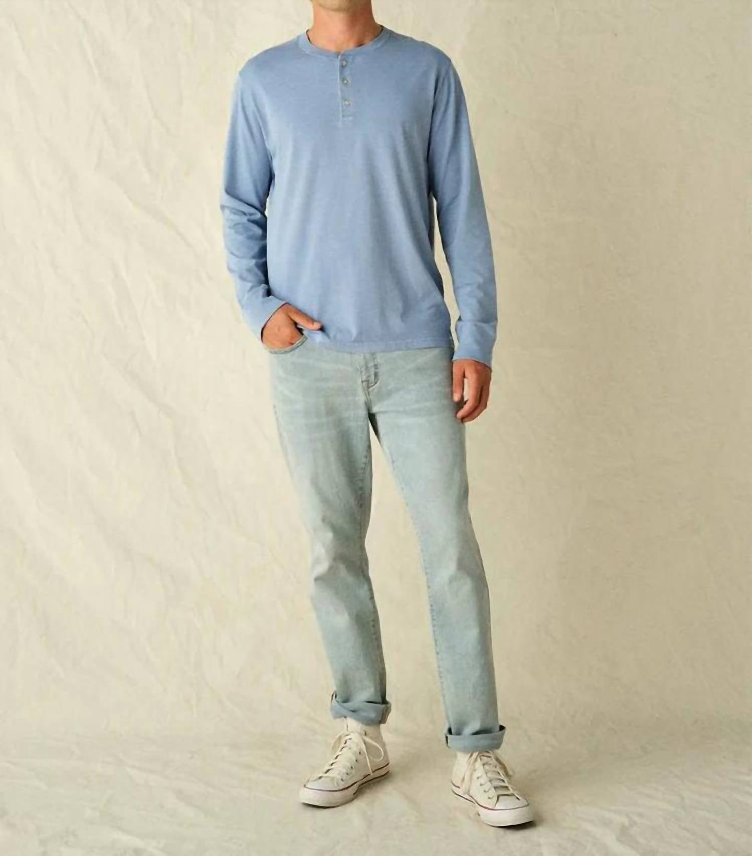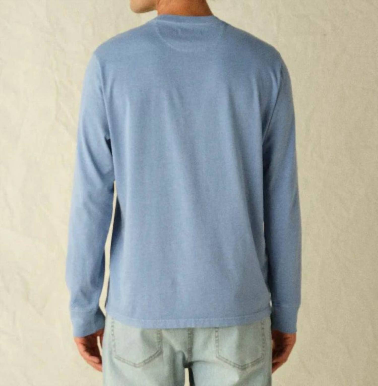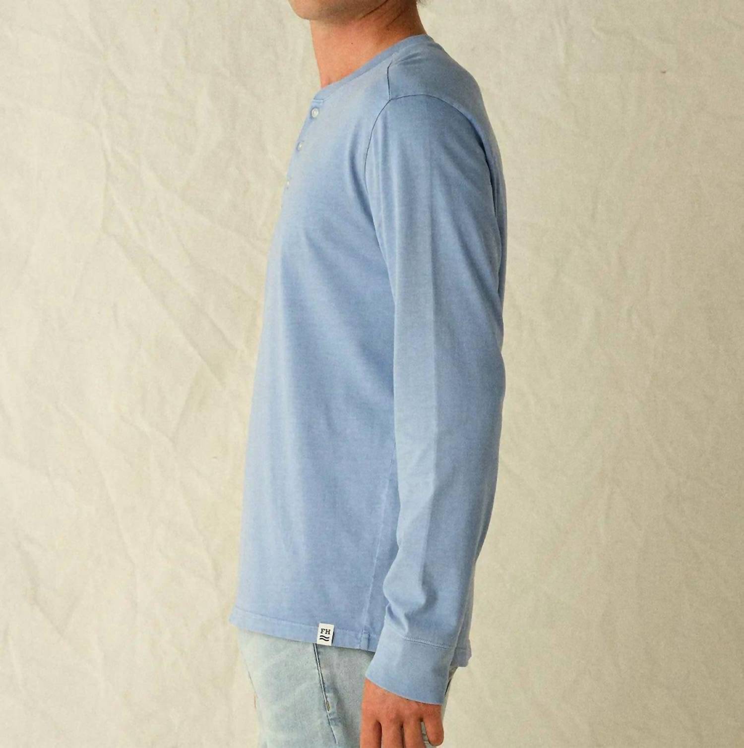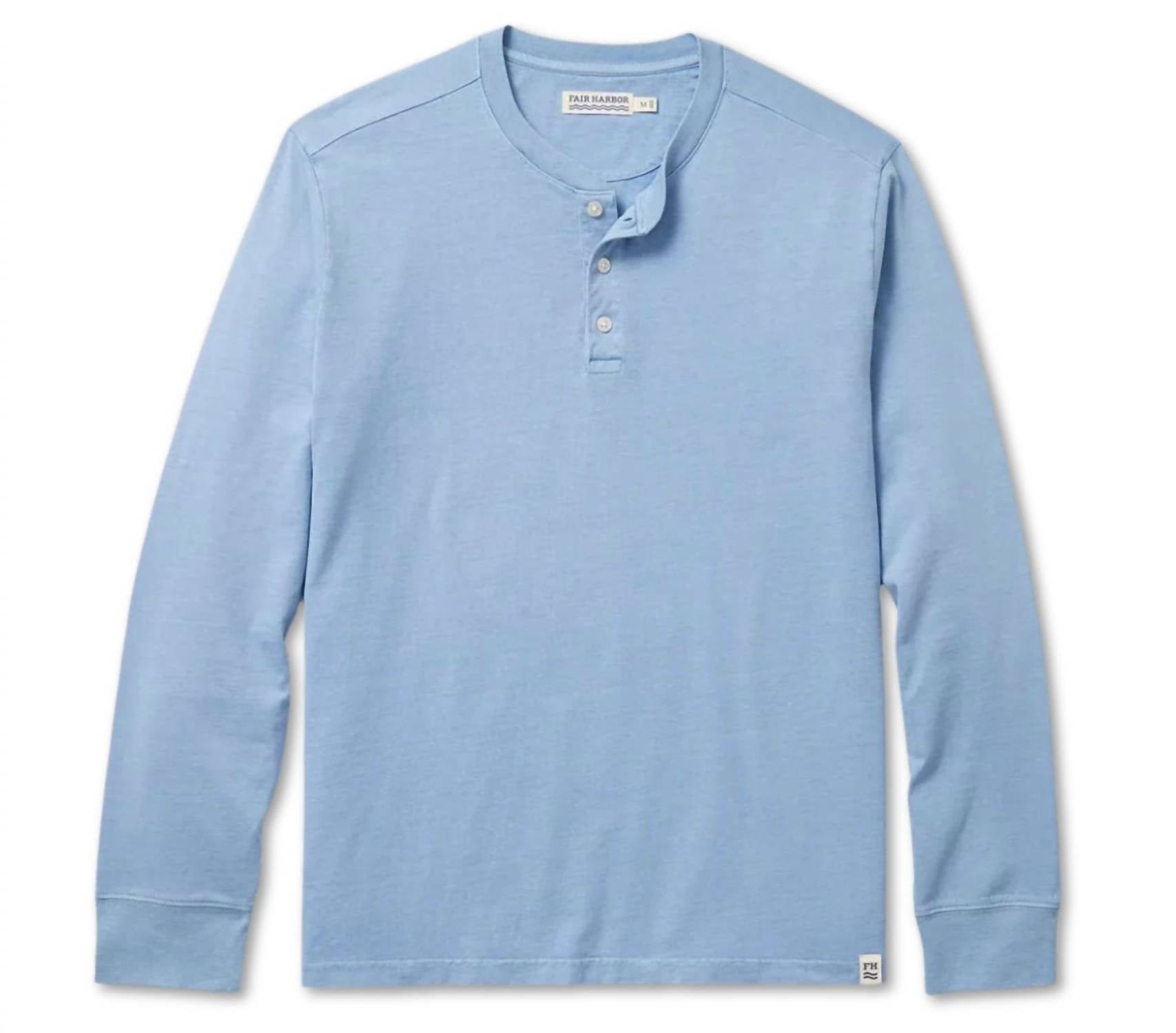 Experience timeless comfort with the Saltaire Henley Long Sleeve Top by FAIR HARBOR, crafted from 100% organic cotton heritage fabric for a soft, breathable feel. This light blue Henley boasts a garment-dyed, sun-drenched look for a unique vintage style, ensuring no two pieces are alike. Designed with long sleeves, a ribbed neck and cuff, and a relaxed fit, this tee is an effortless addition to any wardrobe. Closure type is pull-on, and for care, simply machine wash and line dry.