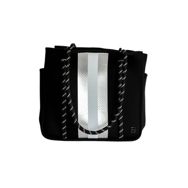 The perfect throw-it-in-and-go bag for your next weekend away or beach vacation! Its classic design will never go out of style and you'll be reaching for this bag season after season. Introducing the Women Courtside Small Pickleball Paddle Tote Bag by Five Love, a stylish and functional accessory for enthusiasts. This chic tote in black with silver and white stripes is made from durable neoprene, ensuring reliability and timeless appeal. Measuring 13" in depth, 7" in width, and 12" in height, it provides ample space for your pickleball gear, accommodating two paddles and offering multiple pockets for essentials. While it’s not completely waterproof, its water-resistant material offers protection against light rain, making it an ideal choice for any outing.