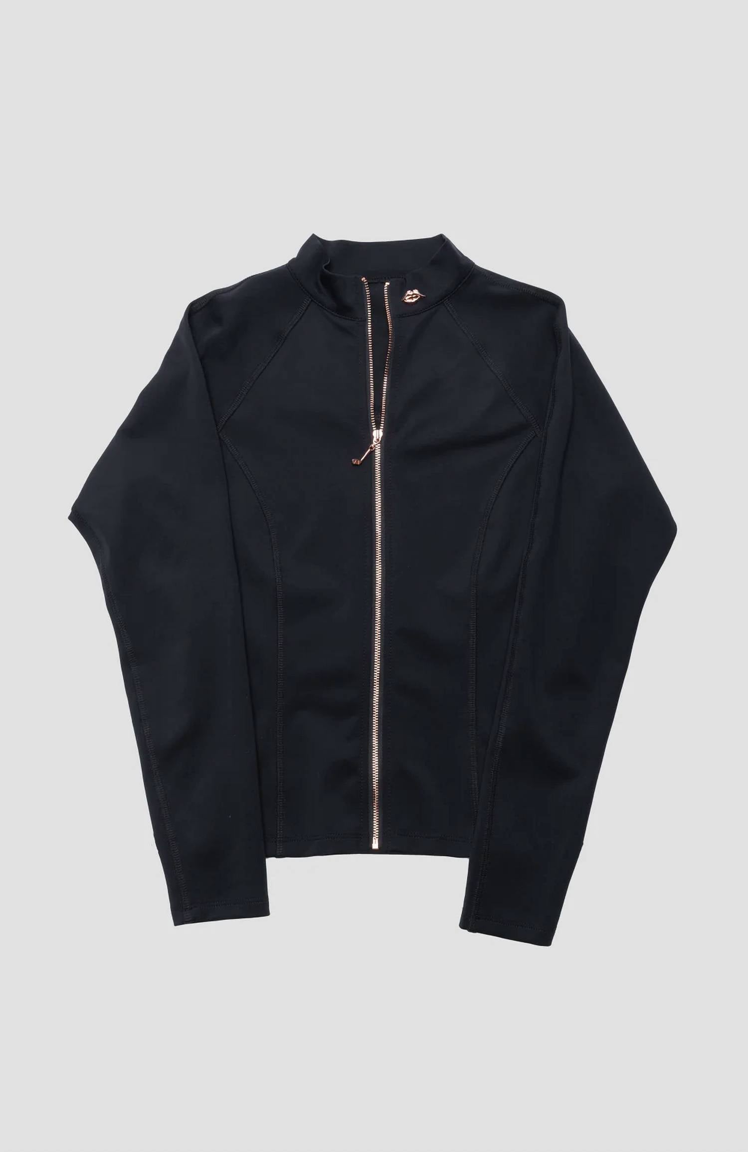 New sporty essential for both on and off the course. With long sleeves and a fitted collar, boasts a figure-flattering design. Crafted from high-quality Italian fabric, composed of 45% polyester, 40% cotton, and 15% elastane, allowing for 360-degree stretch. Made in US. Features a chic rose gold zip closure with a signature golf club zipper pull and removable lip pin for an elegant touch. Care for your jacket by machine washing it warm, then laying it flat to dry.