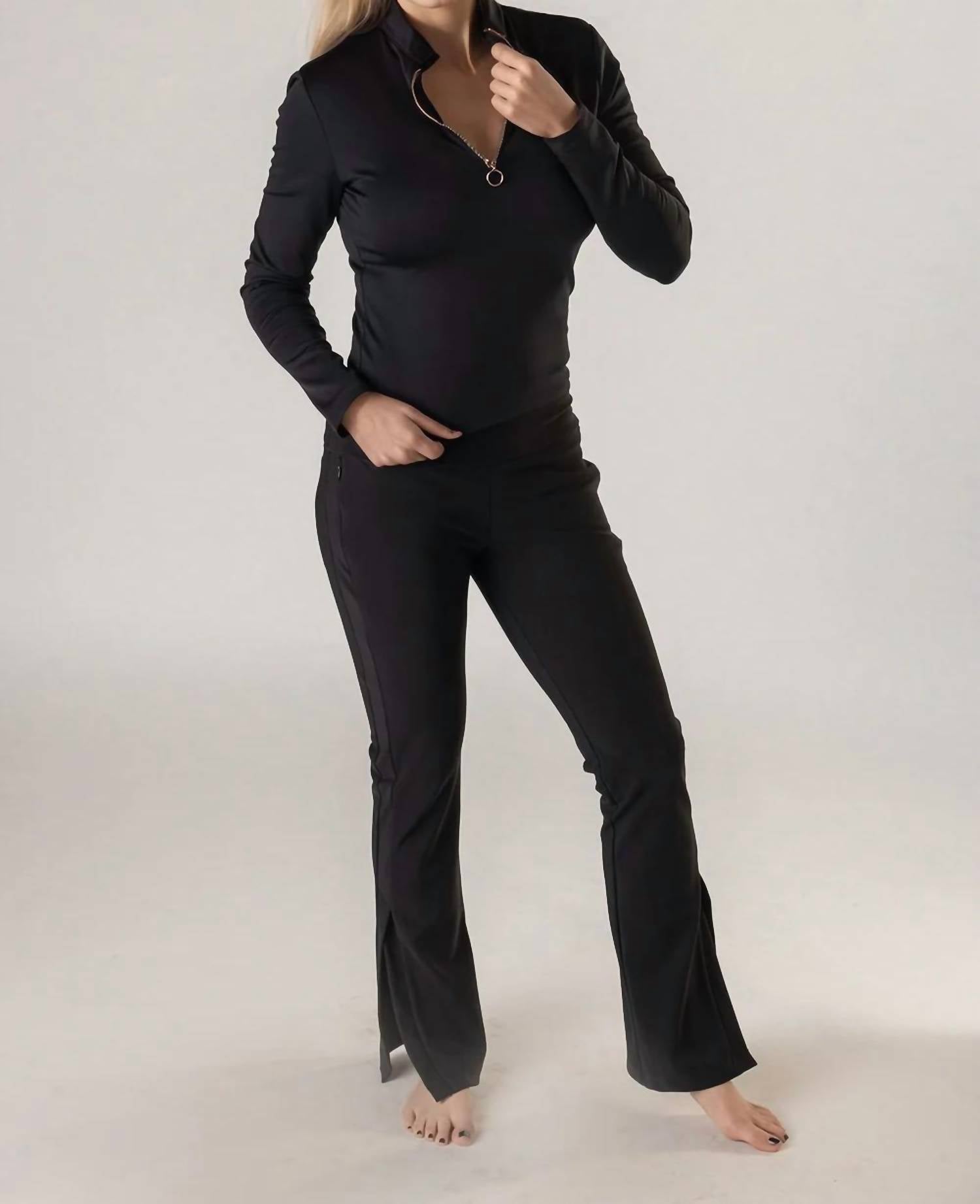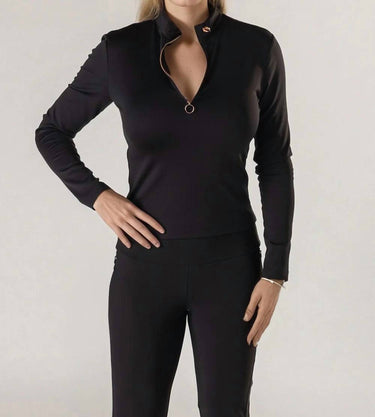 Stylish and functional piece, designed with long sleeves and collar neckline. Crafted from a premium blend of 45% Polyester, 40% Cotton, and 15% Elastane. Offers 360-degree stretch for unrestricted movement. Made in US with Italian fabric. Features a chic rose gold zip closure, perfect for layering during fall sports. Care instructions include machine washing warm and laying flat to dry, ensuring easy maintenance.