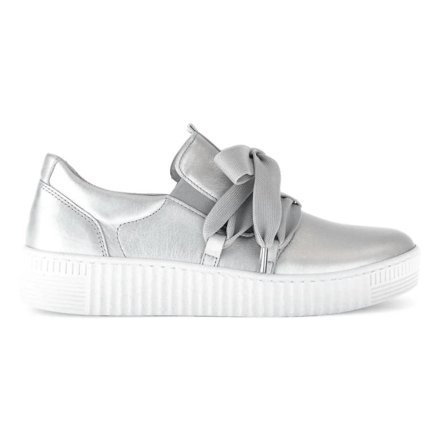 Discover the 63.333 Women's Sneaker by Gabor, a stylish silver piece that combines comfort with a modern twist on the classic sneaker. The shoe is crafted from premium leather and features a platform heel style for a 15 MM lift, ensuring both elegance and trendiness with its Y2K flair. Designed with elastic side panels and a wide satin bow lace, it offers a snug, flexible fit, complete with a removable insole for personalized comfort. This round-toe sneaker is perfect for elevating your winter wardrobe with a chic, effortless edge, making it an ideal choice for New Year's Eve festivities.
