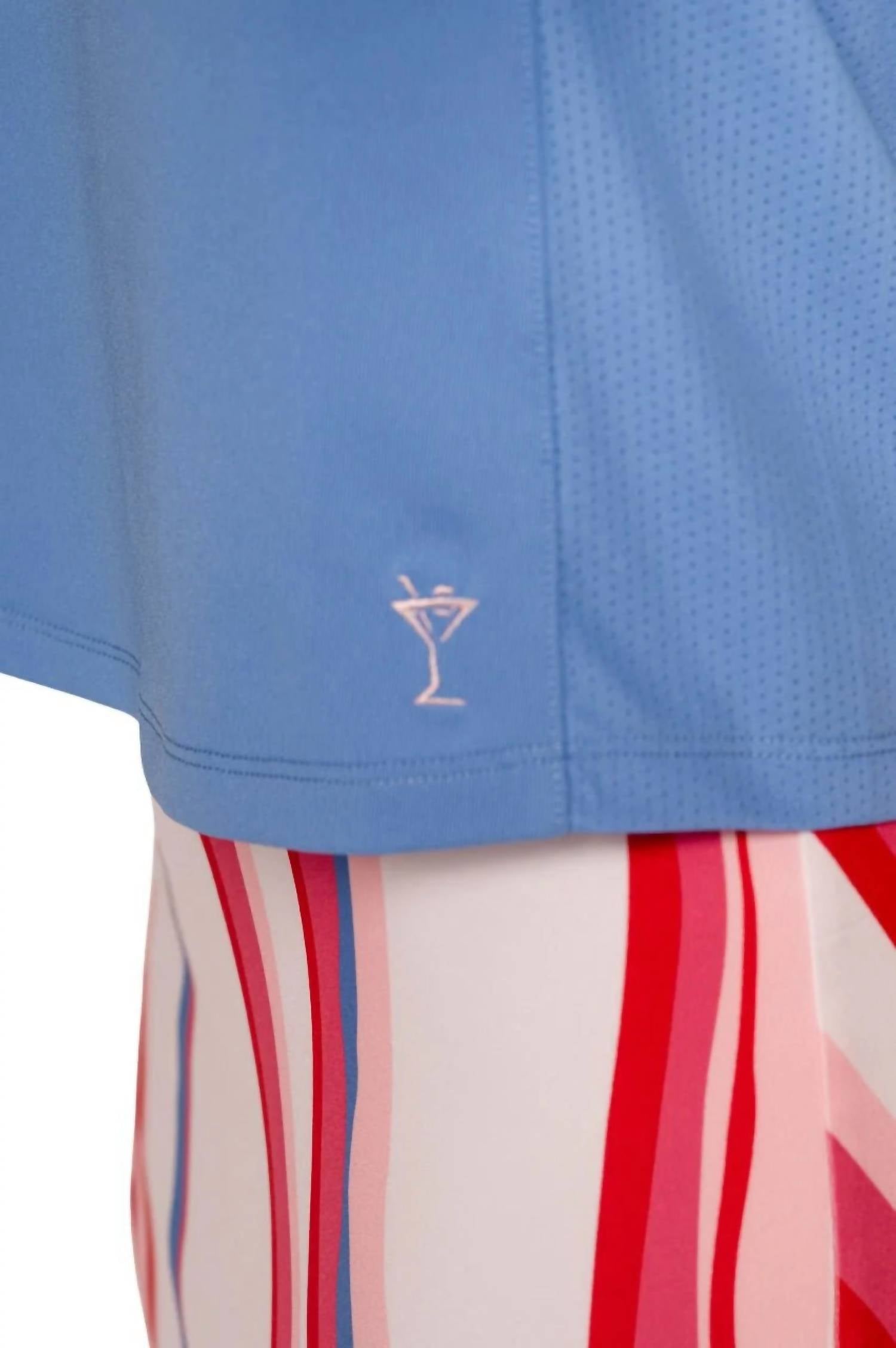 Elevate your golfing wardrobe with the Long Sleeve Ruffle Polo Tee by Golftini, a stylish piece perfect for the active yet feminine golfer. Featuring long sleeves, this top is crafted from 95% Polyester and 5% Spandex, providing a moisture-wicking, wrinkle-free experience. In a chic Zoo Blue with a light pink martini logo, it boasts hidden buttons with a ruffle placket and princess seams for a flattering fit. Closure: Button closure. Care: Machine wash and tumble dry. Model is 5'10" wearing a size small.