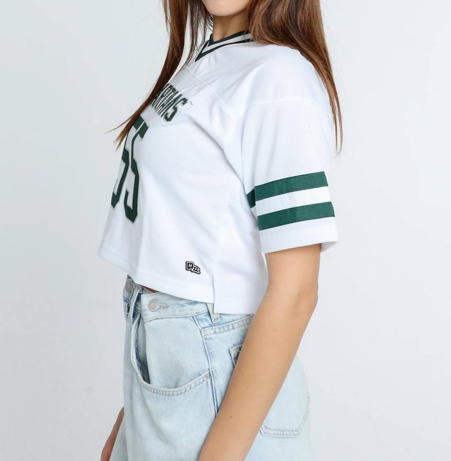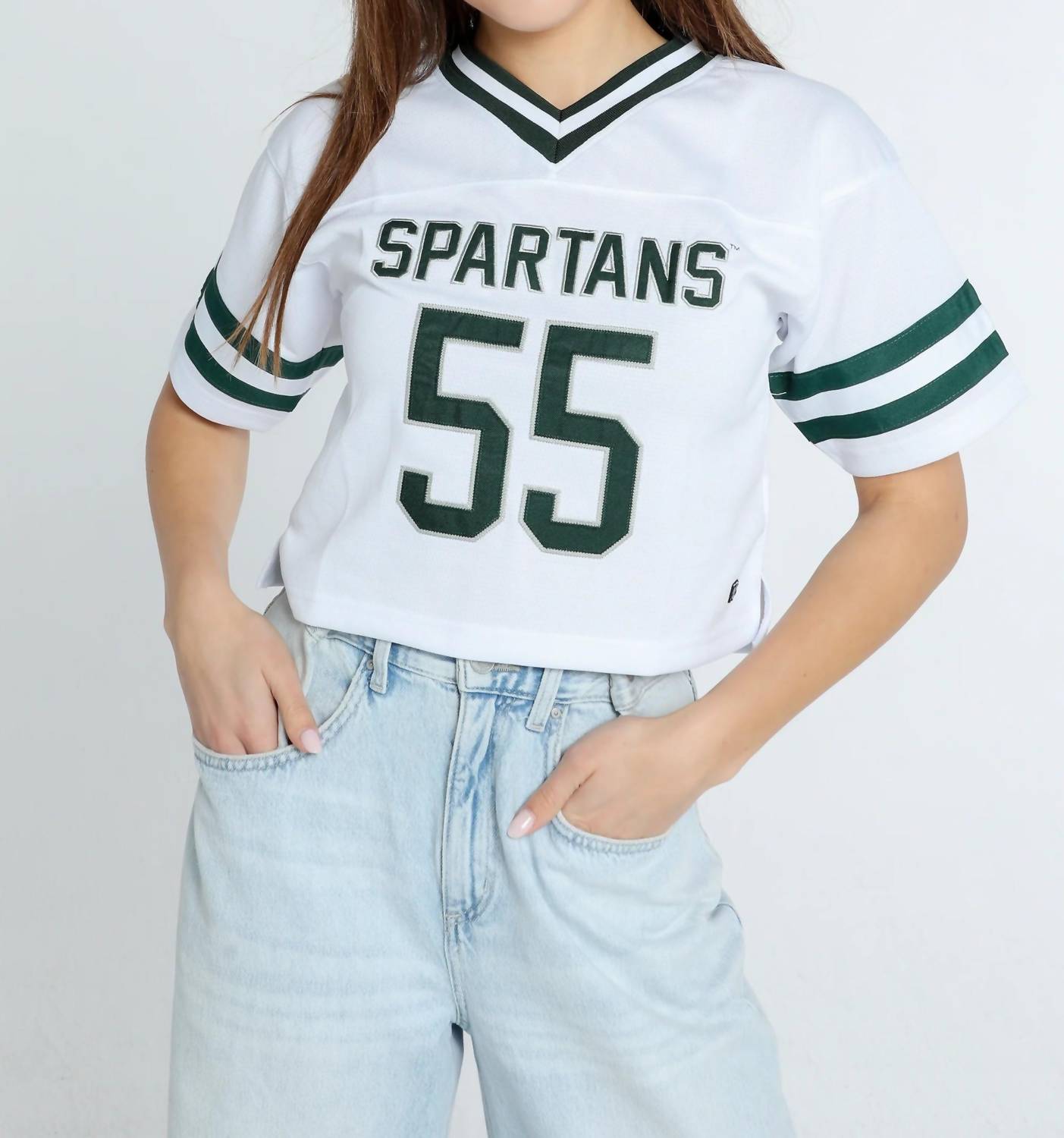 Elevate your game day style with the Michigan State Football Top by Hype and Vice, a chic addition to any fan’s wardrobe. This white, short sleeve crop top features a flattering V-neckline and a quality embroidered school logo. Made from 100% polyester, this versatile piece ensures comfort and breathability. Designed with a convenient pull-on closure, it's a must-have for trendsetters who love showing their team spirit.