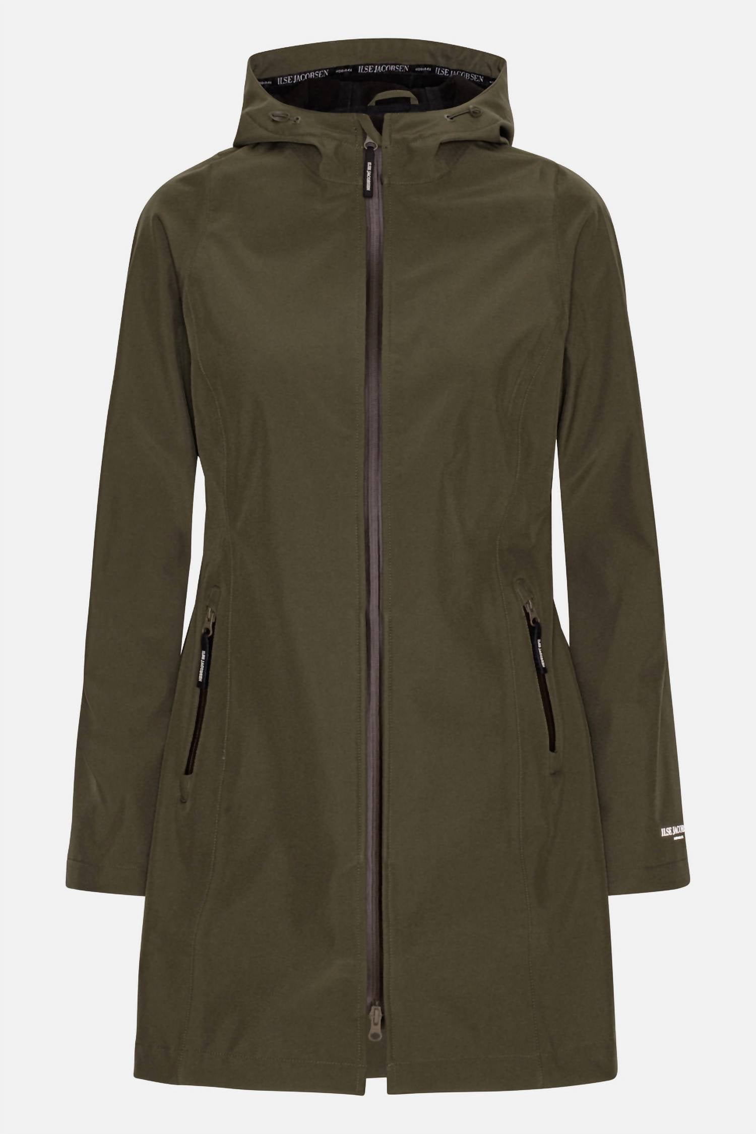 A casual yet cool jacket that every closset needs. Introducing the Daybreak 01 Rain Jacket by Ilse Jacobsen, an essential piece for your active wardrobe in a stylish Army Green. This women's jacket features long sleeves and is made from durable polyester, designed with a zip closure for convenience. With taped seams and Ecorepel® innovation, it boasts a 5000 mm waterproof rating, ensuring you stay dry during your outdoor adventures. Embrace the outdoors with this solid-patterned, functional jacket, complete with pockets and a practical hooded neckline.