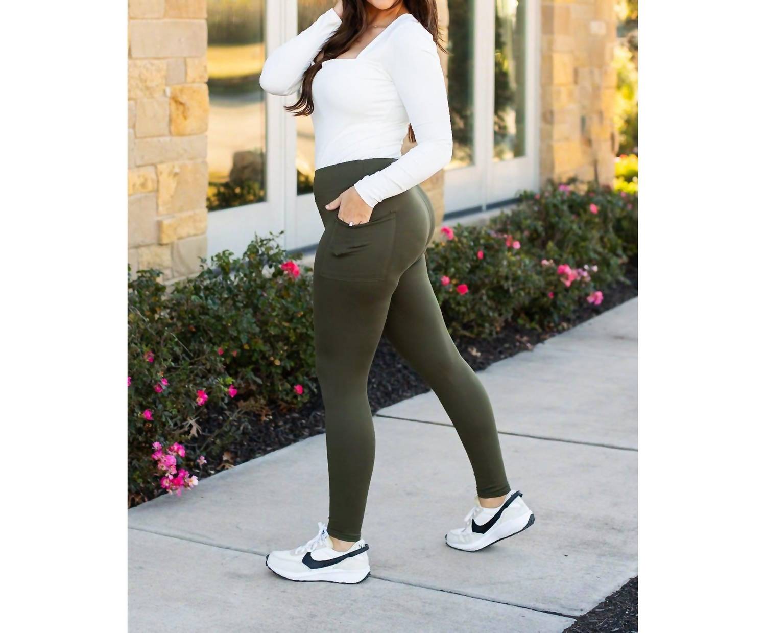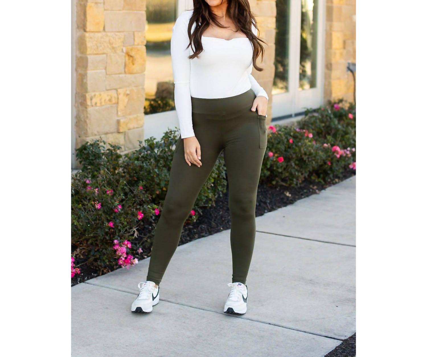 Experience unparalleled comfort and style with the Oakley Full-length Leggings With Pockets by Julia Rose. Crafted from 92% Polyester and 8% Spandex, these olive green leggings offer a super soft and stretchy fit ideal for any workout session or casual outing. Featuring a sleek skinny leg style and convenient pockets, they're perfect for fitness or your everyday wardrobe. With a pull-on closure and available in various sizes, these leggings ensure a flawless fit, with inseams ranging from 70 cm to 74 cm.