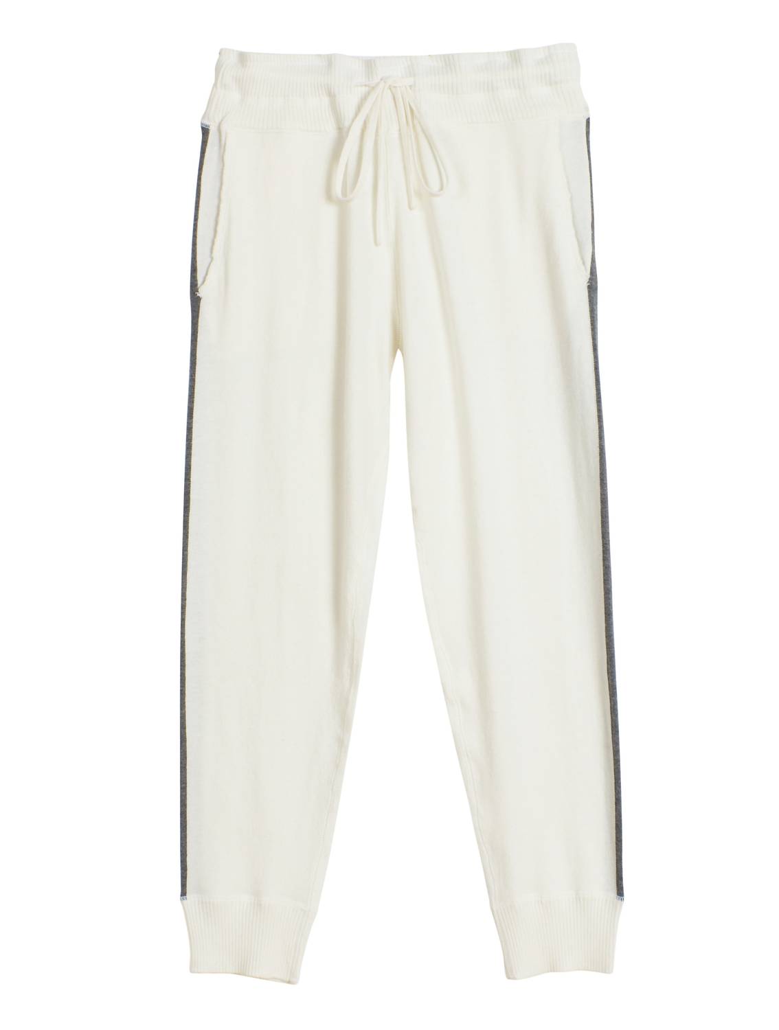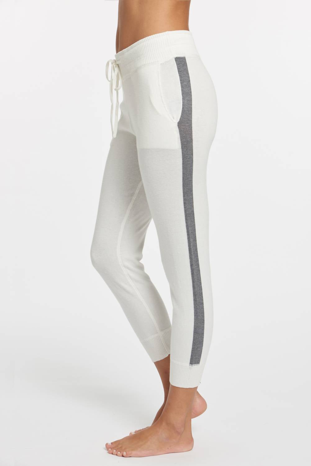 Introducing the Somerset Jogger by LEIMERE, designed for ultimate comfort in a charming Marshmallow hue. These joggers showcase front pockets, a track stripe detail, and a drawstring waist for a relaxed fit. Made from a luxurious blend of 50% Modal, 25% Cotton, 15% Nylon, and 10% Cashmere, they are imported with precision craftsmanship. Care instructions include either hand washing and laying flat to dry or machine washing on a gentle cycle with like colors, followed by a low tumble dry. Model is 5'10" and wears a size small with a 24" inseam, 8" leg opening, 10" front rise, and 13.25" back rise.