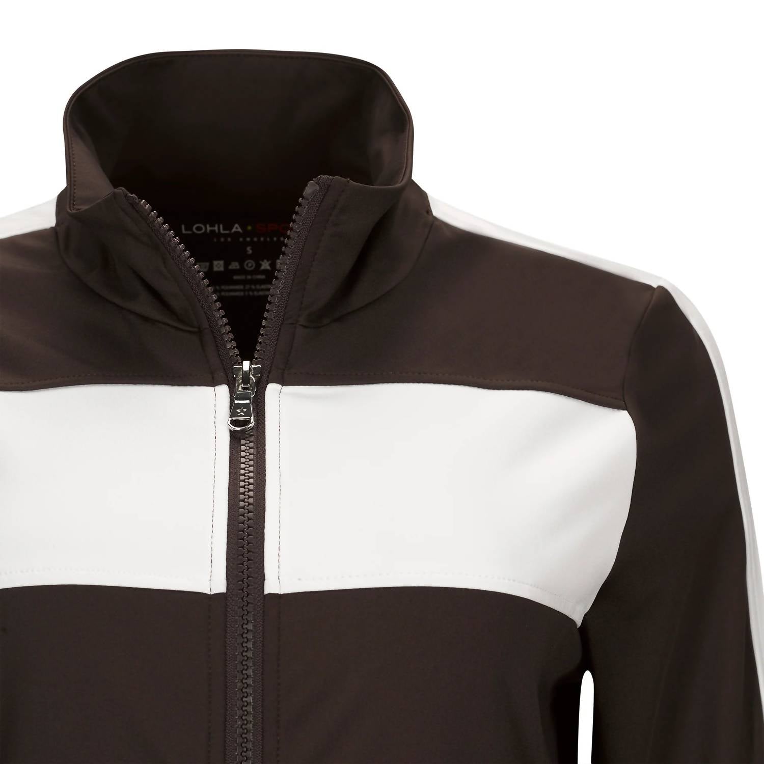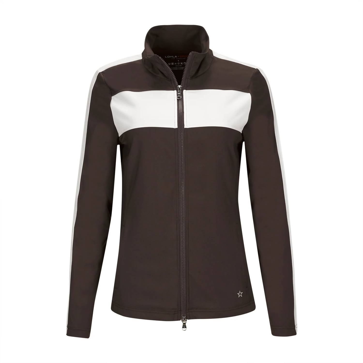 Introducing the Women's Bond Girl Jacket by Lohla Sport, a sleek utility jacket in sophisticated mocha. Featuring long sleeves with striking white accents, this jacket is ideal for a chic athleisure look. Composition: 73% Polyamide, 27% Elastane. Closure: Zip closure.