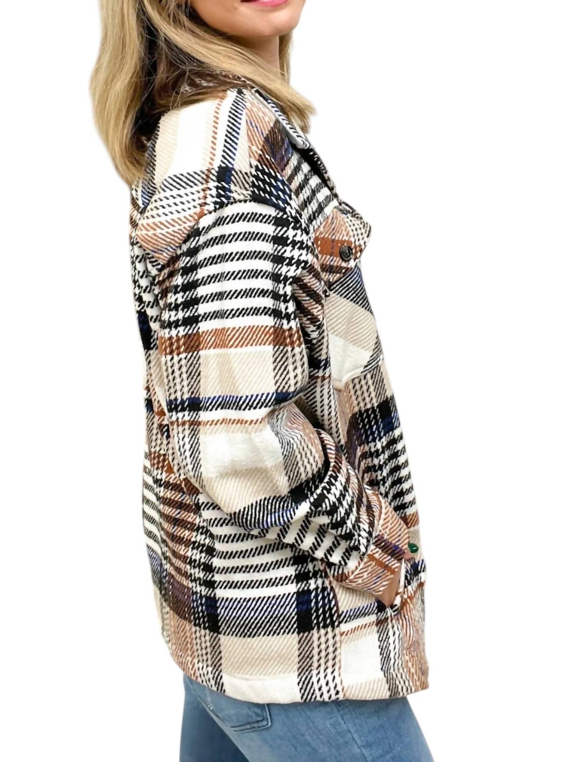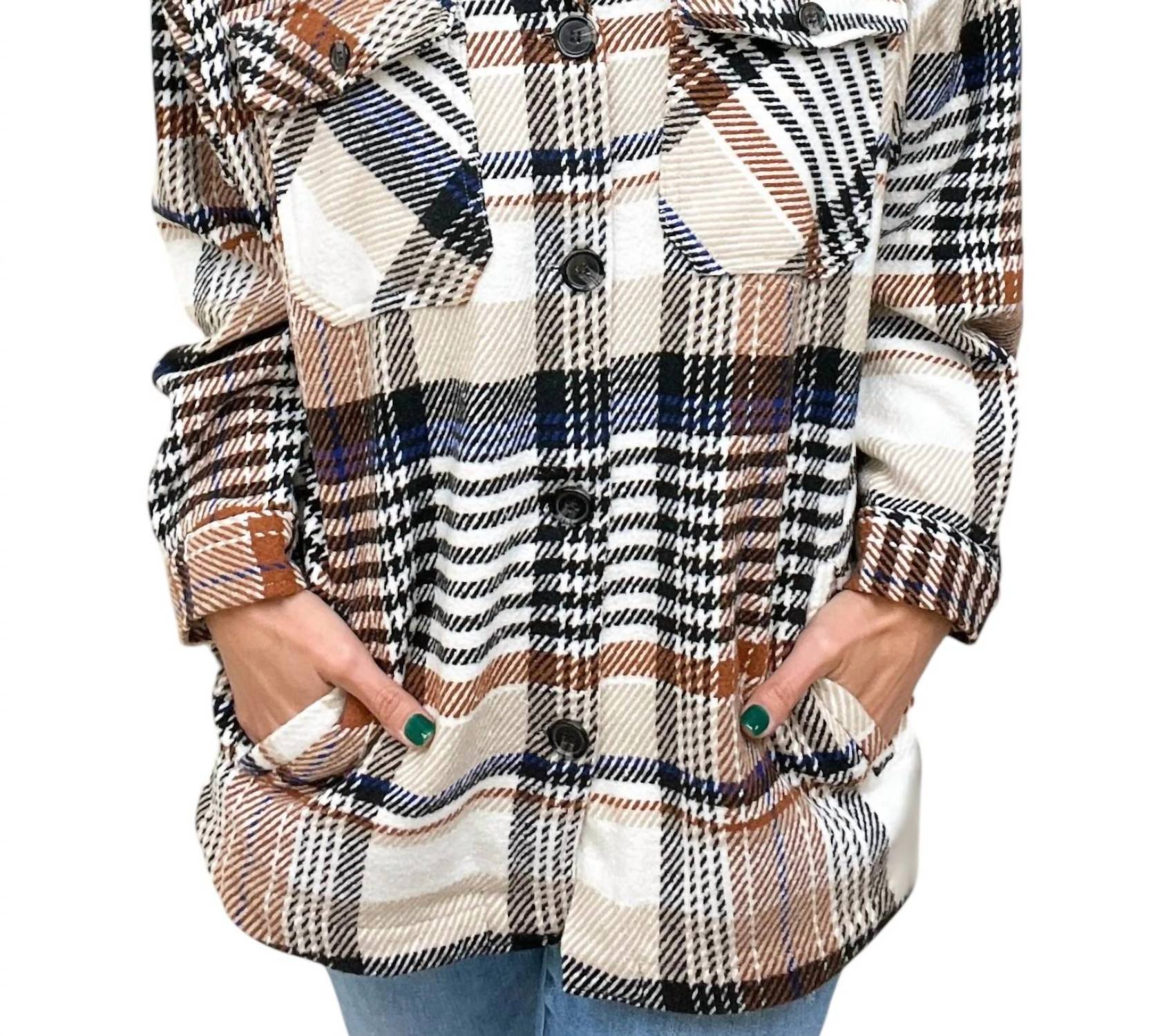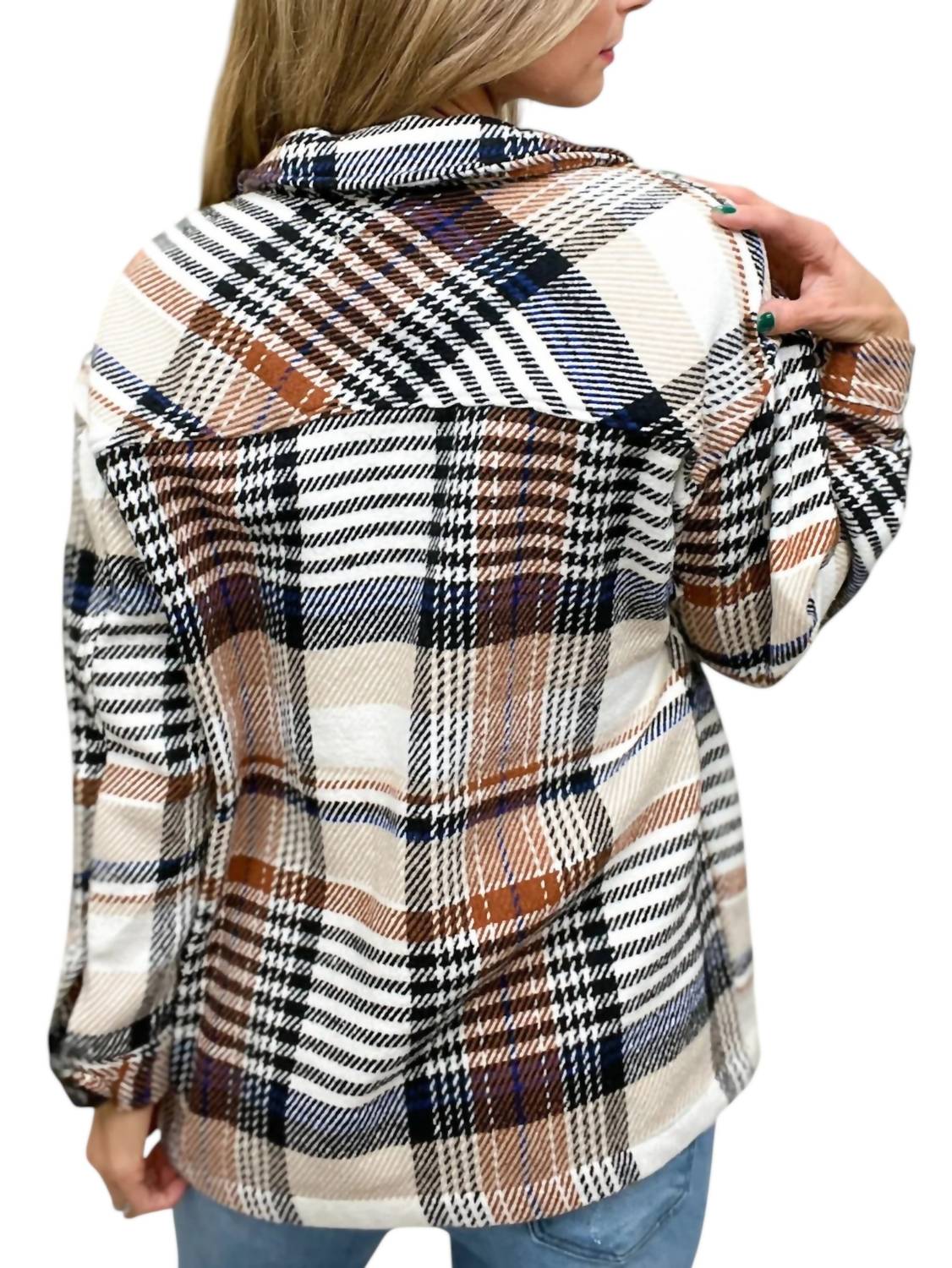 Introducing the Plaid Collared Coat by LTX Sportswear, a grunge-inspired jacket perfect for a dinner party. This women's casual jacket features long sleeves and a classic button closure. It showcases a chic brown plaid pattern with practical pockets for added utility. The crewneck design reinforces a timeless style, while the heavy material keeps you comfortable in colder seasons.