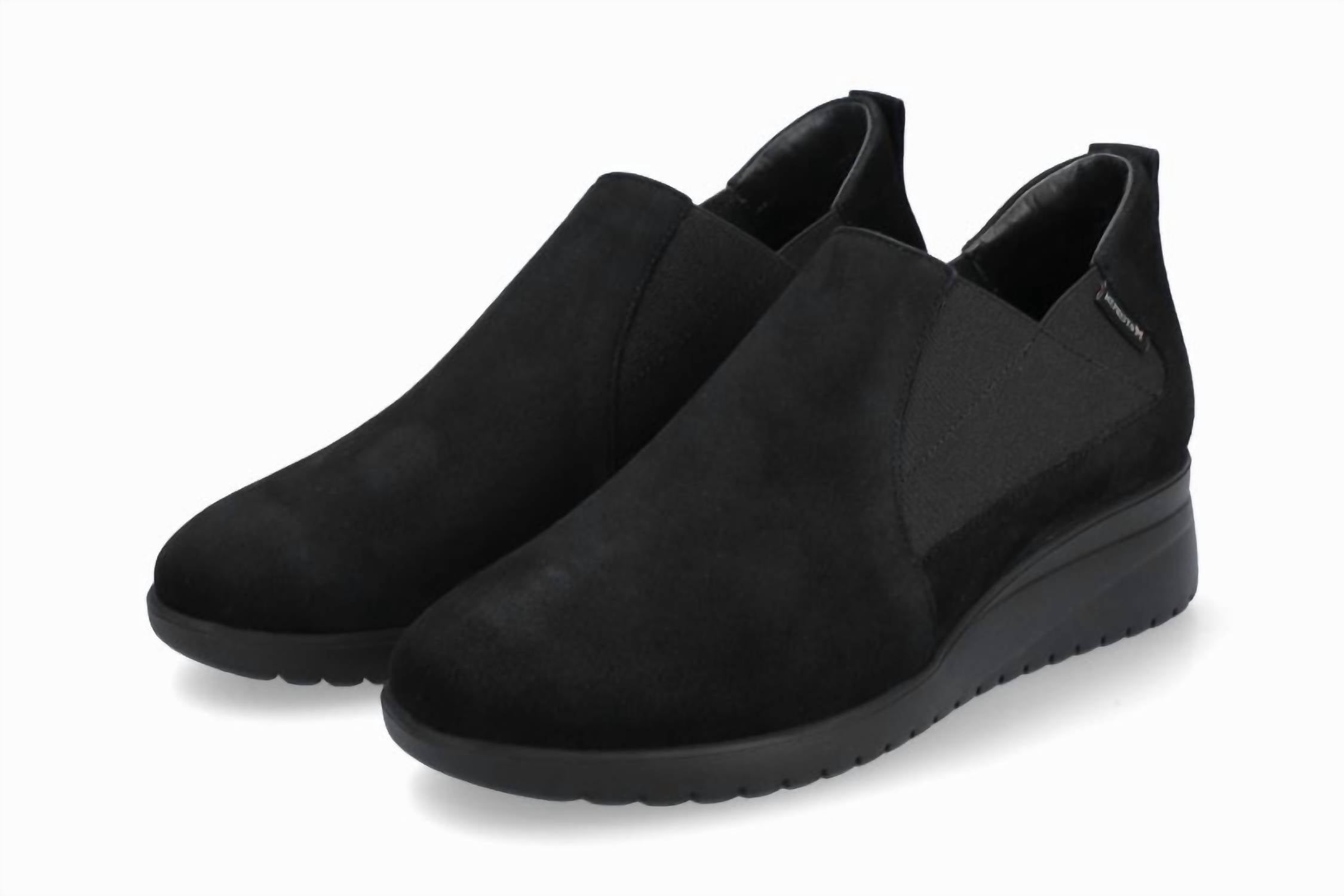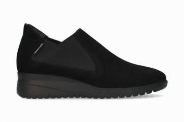 Experience unmatched comfort with the MEPHISTO Women's Ibelina Slip-on Sneaker in sleek black leather. Crafted with velvet leather and lined in genuine leather, this sneaker boasts an elastic side for perfect foot support and a 2 cm wedge heel for added height. Featuring a removable insole with SOFT-AIR technology, it minimizes impact for effortless walking. The caoutchouc lite sole ensures durability, making this the perfect choice for those seeking style and comfort.