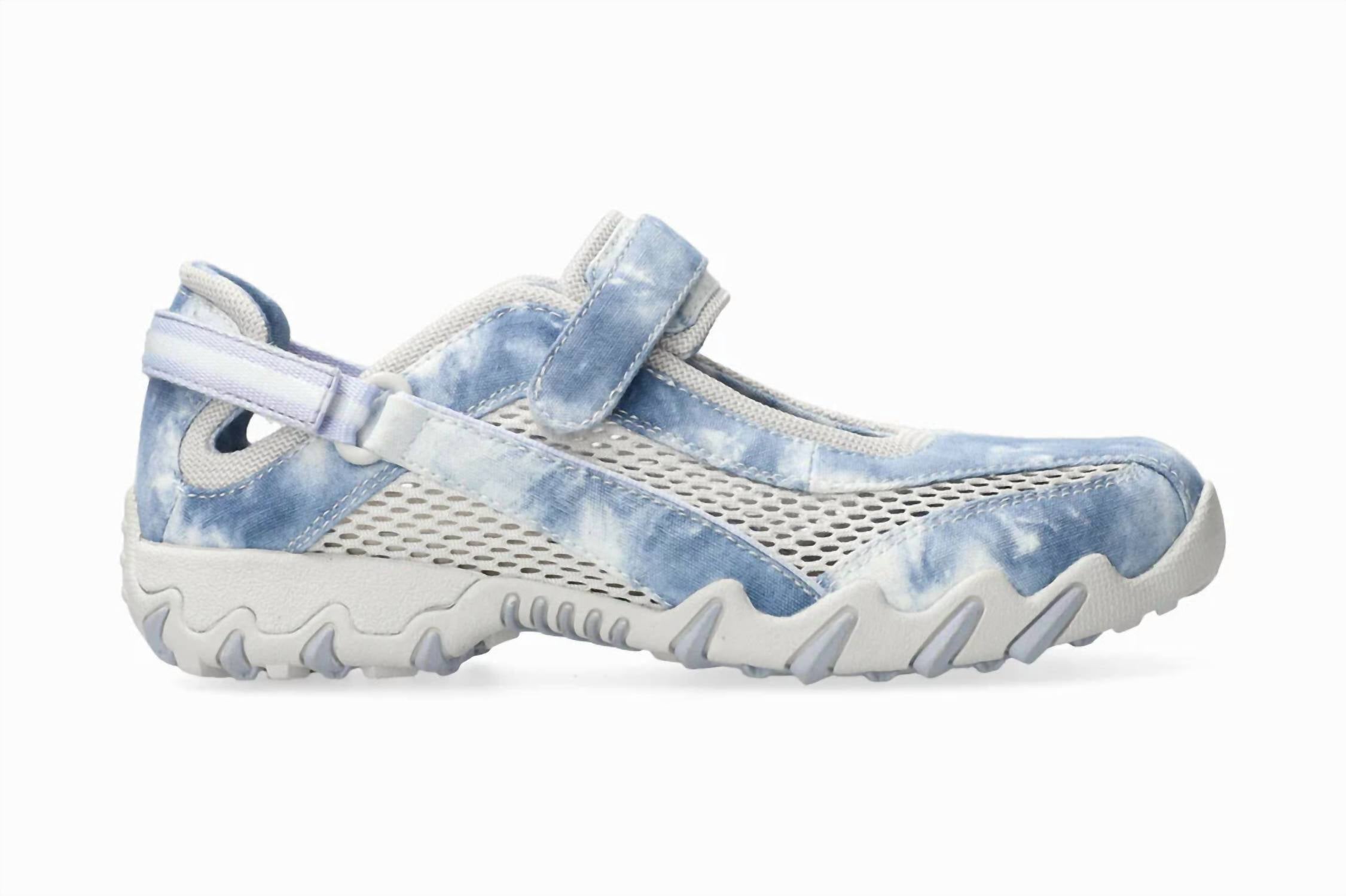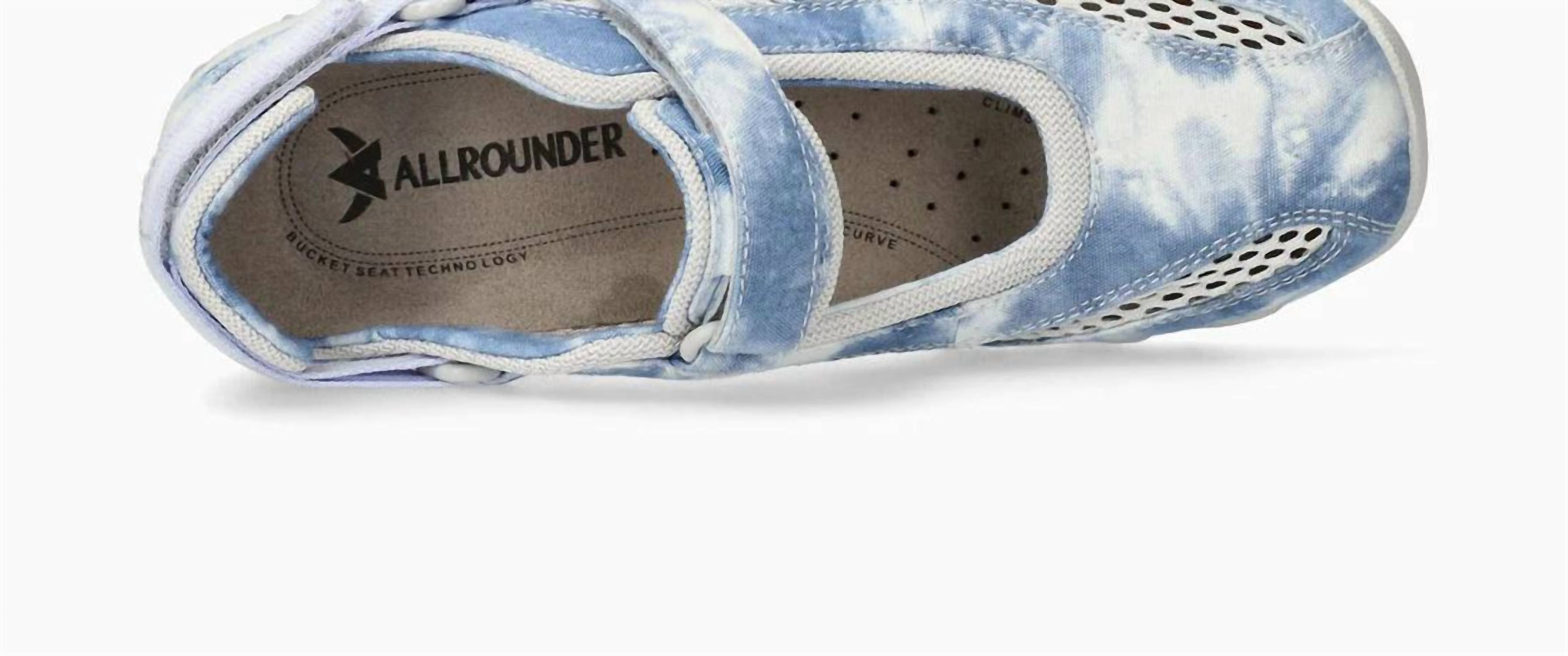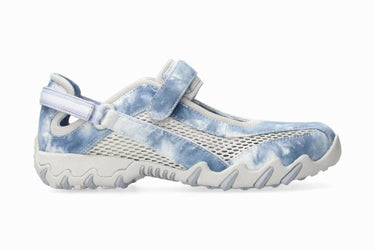 The Women's Niro Rugged Mary Jane Shoes by MEPHISTO in Blue Tie-dye combine elegance with functionality. Made from luxurious velvet leather, these shoes are lined with textile for added comfort and feature a secure hook and loop tape fastener. Designed with a standard width and low, 1.5 cm flat heel, they offer both style and versatility. They also include a removable footbed for customized support, making them perfect for all-day wear.