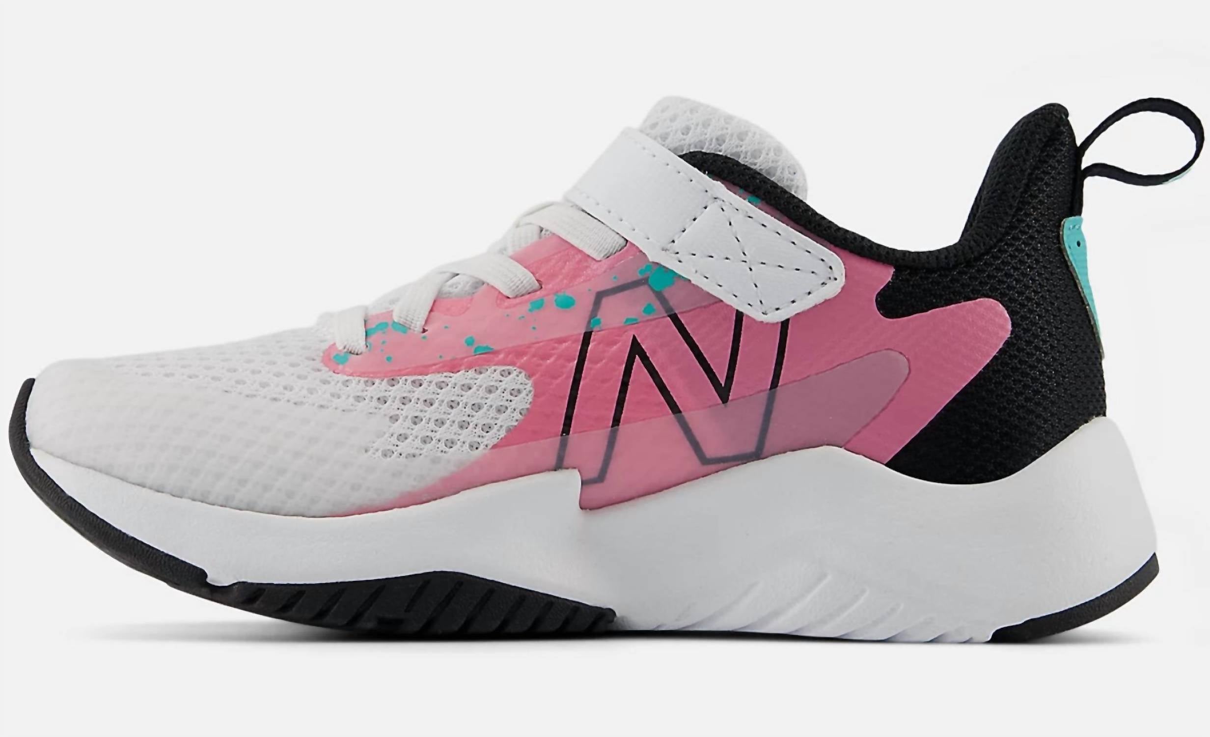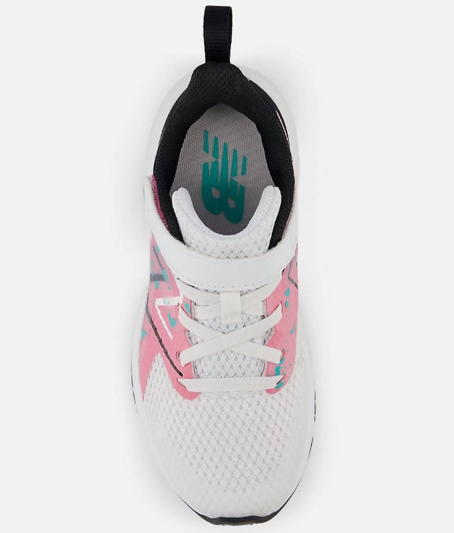 The New Balance Kids Toddler Rave Run V2 Bungee Lace Sneakers in white and pink combine plush comfort with a fresh, youthful style. These sneakers, designed with a lightweight injection-molded EVA foam midsole and no-sew overlays, provide excellent support and durability. At just 89.6 grams (3.2 oz), they feature a durable rubber outsole for added resilience. Made for toddler girls, these sneakers offer a round toe and flat heel design, suitable for everyday adventures.