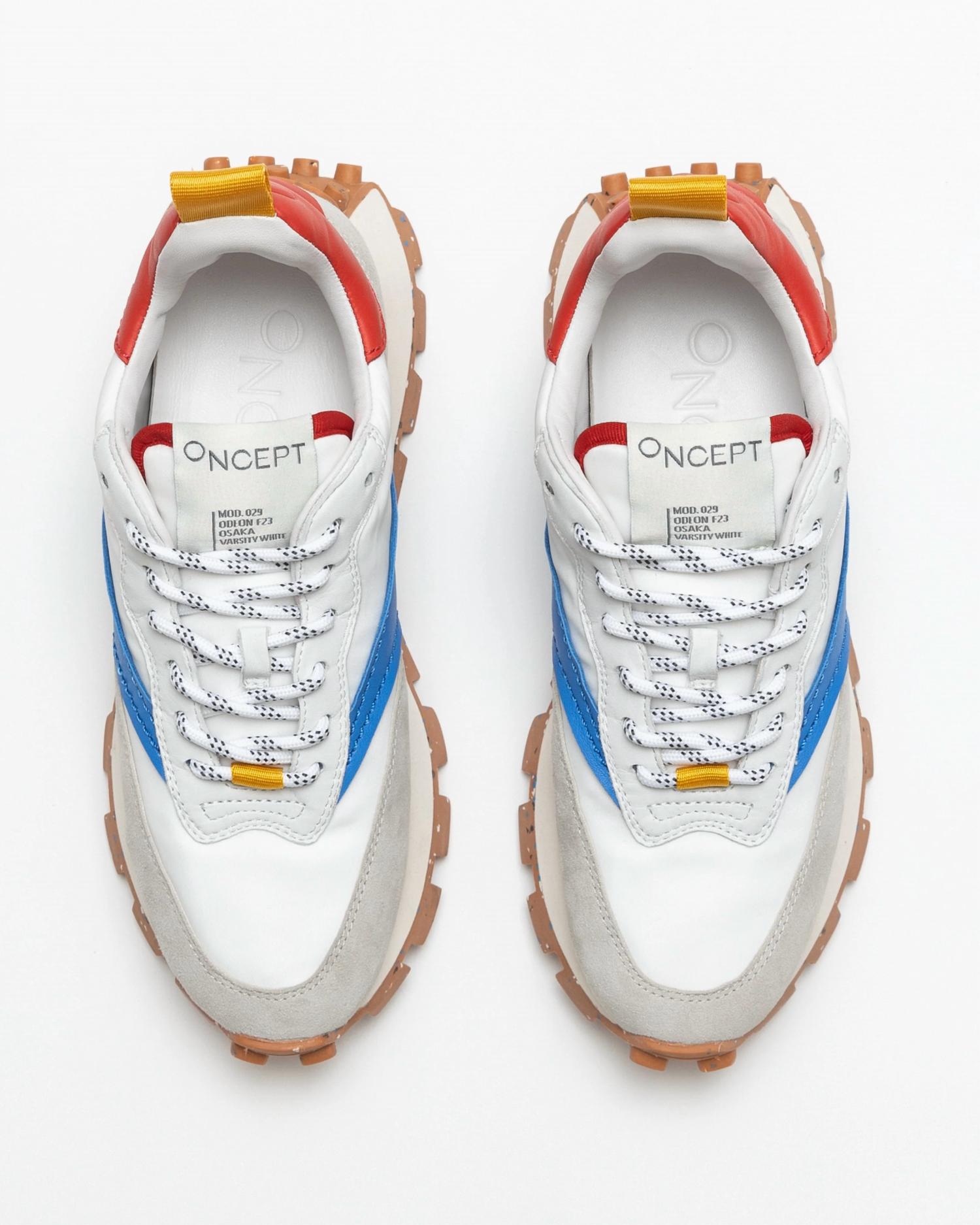 When fashion and function come together seamlessly. Introducing the Women's Osaka Low Top Sneaker by Oncept, a perfect blend of comfort and style in Varsity White. Crafted with a Varsity Re-Nylon upper and chrome-free suede, these sneakers feature a Tencel pulp-based twill lining and a leather sock for added luxury. The bio-density recycled molded footbed and re-speckled rubber outsole ensure each step feels like walking on clouds. Designed with a deconstructed flexible fit, these sneakers are advised to be ordered half a size smaller for the perfect fit. Care: The outsole can be cleaned with a soft cloth and water, while the upper should be gently wiped with a damp cloth. Not machine washable.