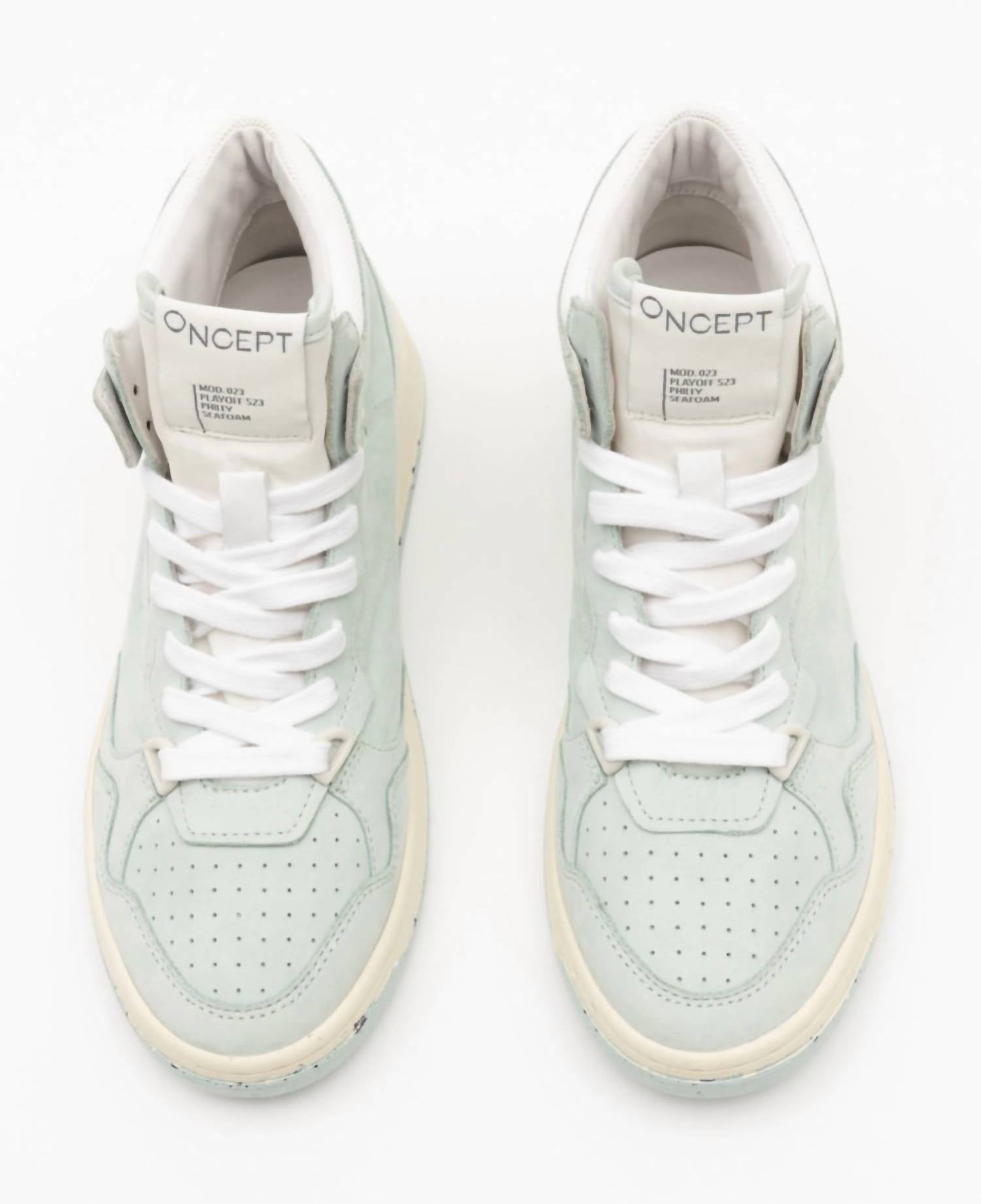 Step into style with the Women's Philly Mid-top Sneaker by Oncept, crafted to be the MVP of your footwear collection. Designed in a chic seafoam color, these sneakers feature a versatile mid-top height and round toe, perfectly blending with any outfit from denim to leggings. The eco-friendly re-speckled two-color outsoles offer excellent support and comfort, complemented by a flat heel for all-day wearability. Elevate your street style with these sneakers, ideal for any modern wardrobe.