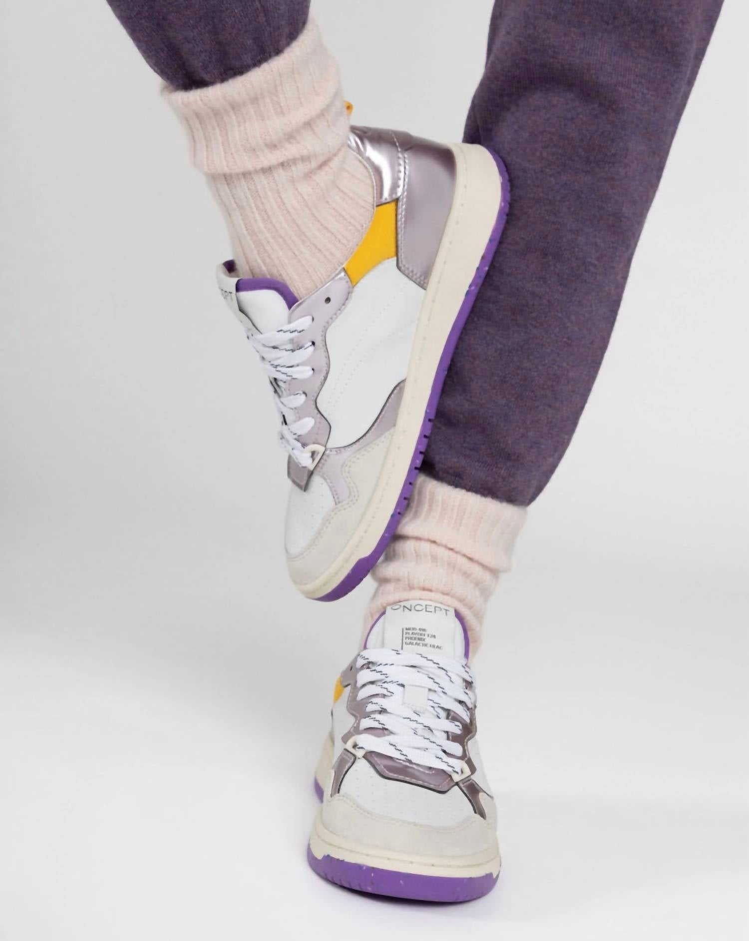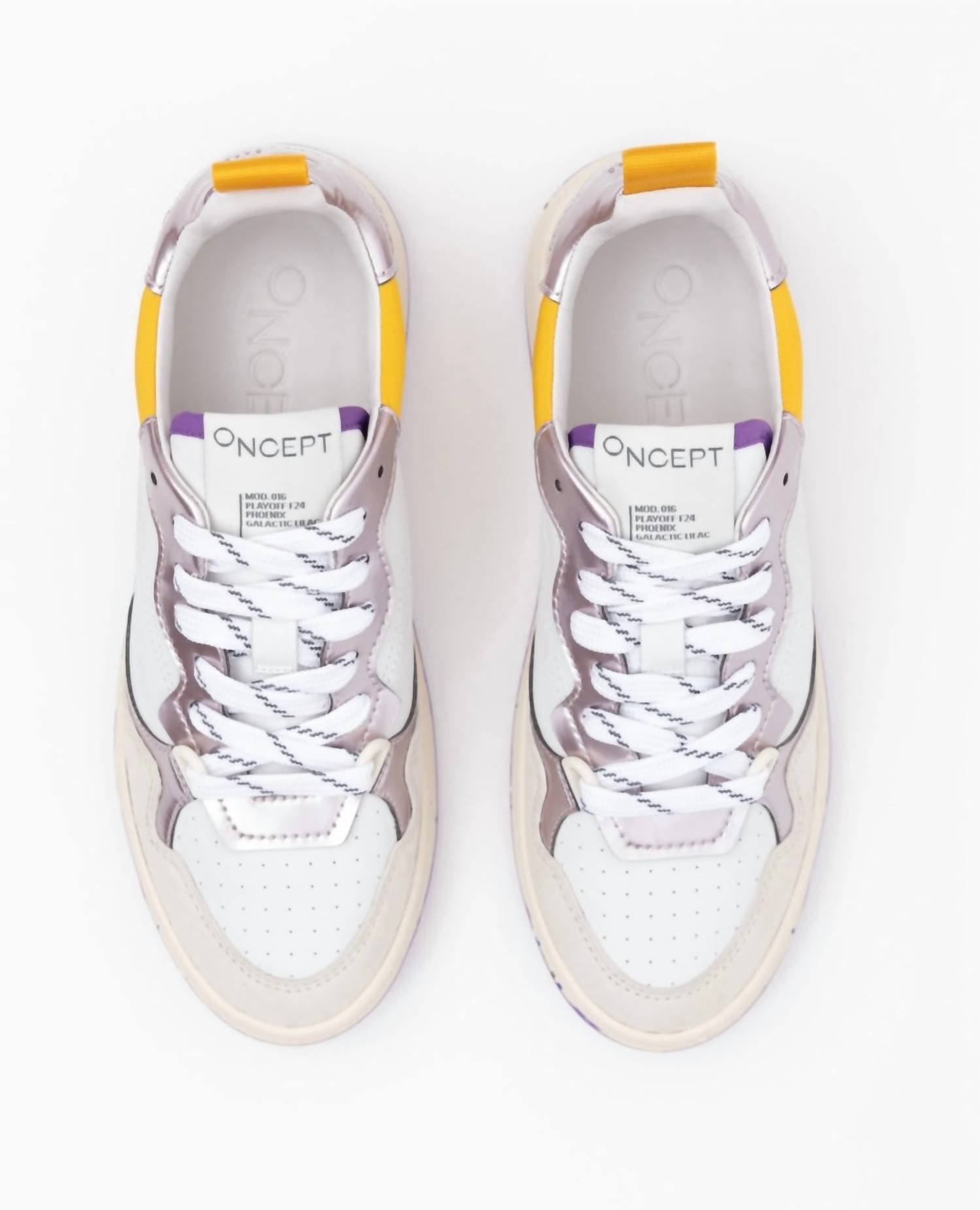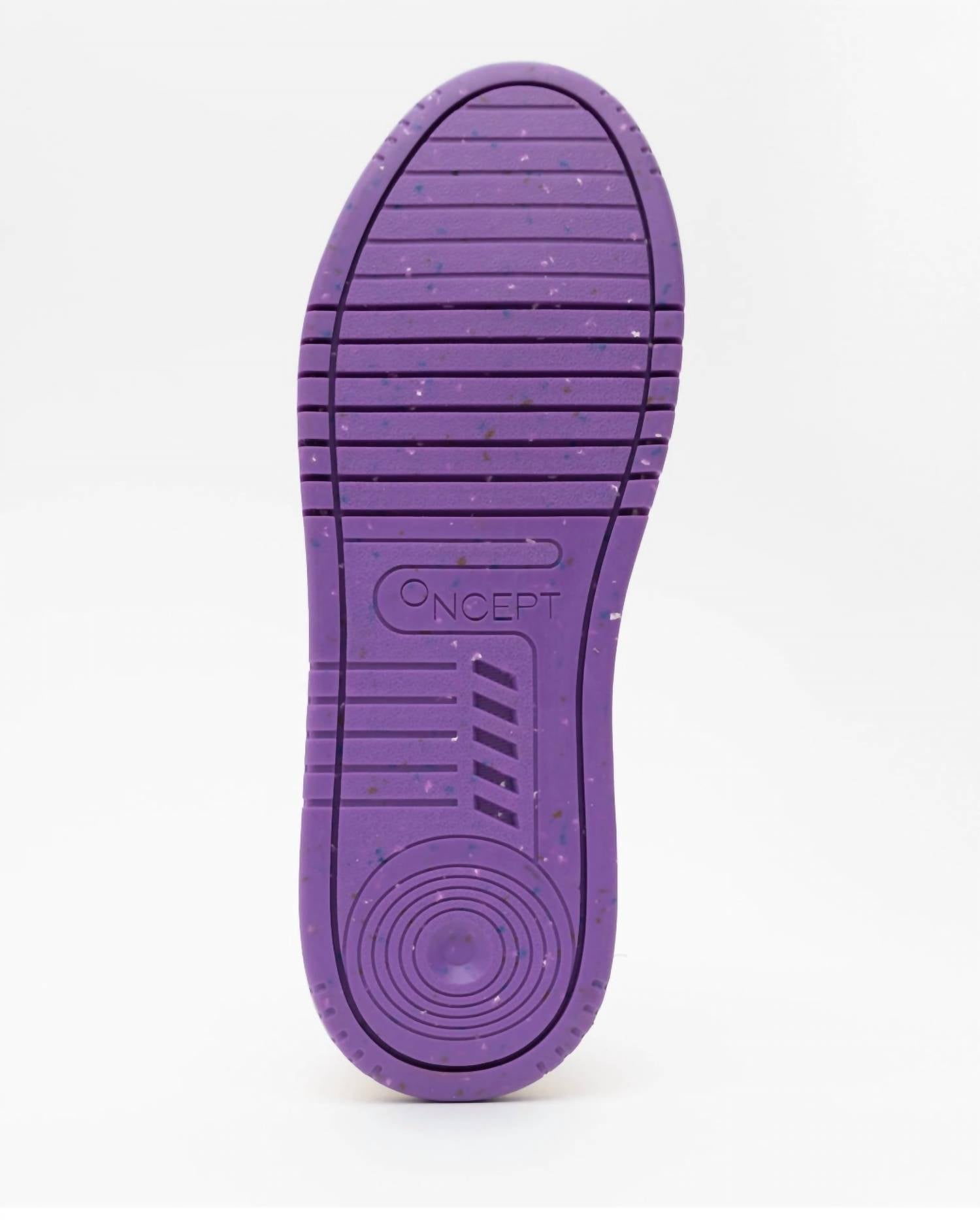 Step out with confidence in the Women's Phoenix Sneaker by Oncept, a stylish reinterpretation of early '90s flair. These sneakers boast luxe butter leather adorned with organic cotton laces, paired with signature re-speckled soles for a unique aesthetic. Designed with a flat heel and round toe, they offer comfort and trendsetting style in the vibrant Violet Multi colorway. Crafted with precise attention to detail, these sneakers are perfect for adults seeking a blend of retro and modern sophistication.