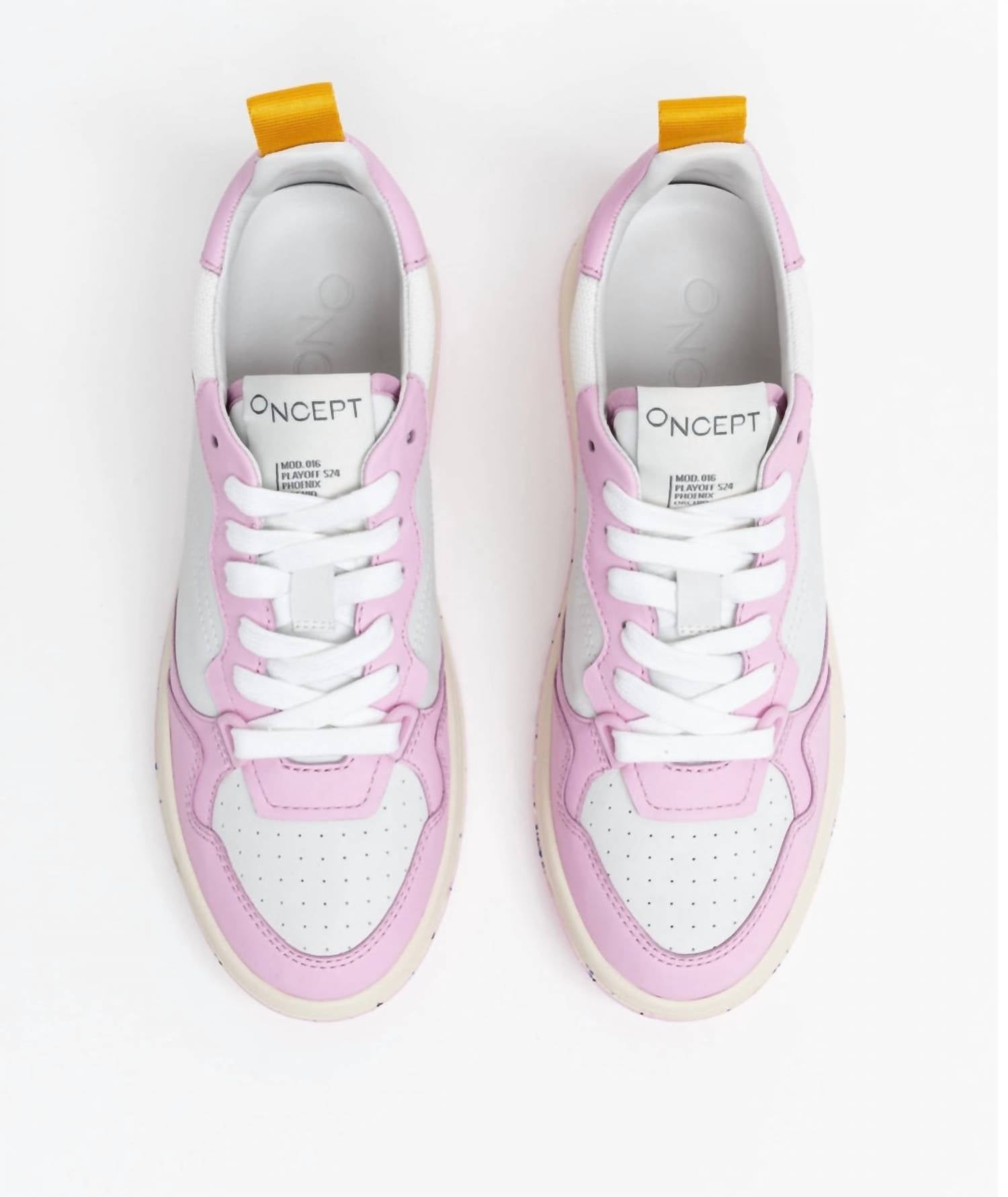 Cute, functional, and comfortable. These sneakers check all the boxes. Step out with confidence in the Women's Phoenix Sneaker by Oncept, a stylish reinterpretation of early '90s flair. These sneakers boast luxe butter leather adorned with organic cotton laces, paired with signature re-speckled soles for a unique aesthetic. Designed with a flat heel and round toe, they offer comfort and trendsetting style in the vibrant Violet Multi colorway. Crafted with precise attention to detail, these sneakers are perfect for adults seeking a blend of retro and modern sophistication.
