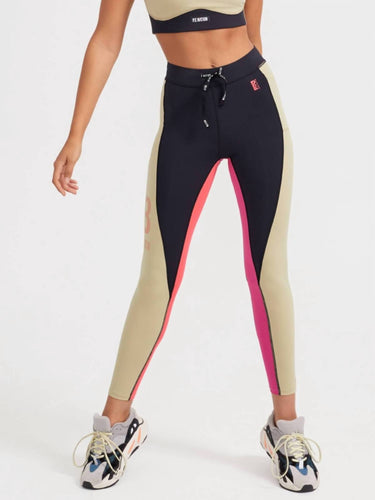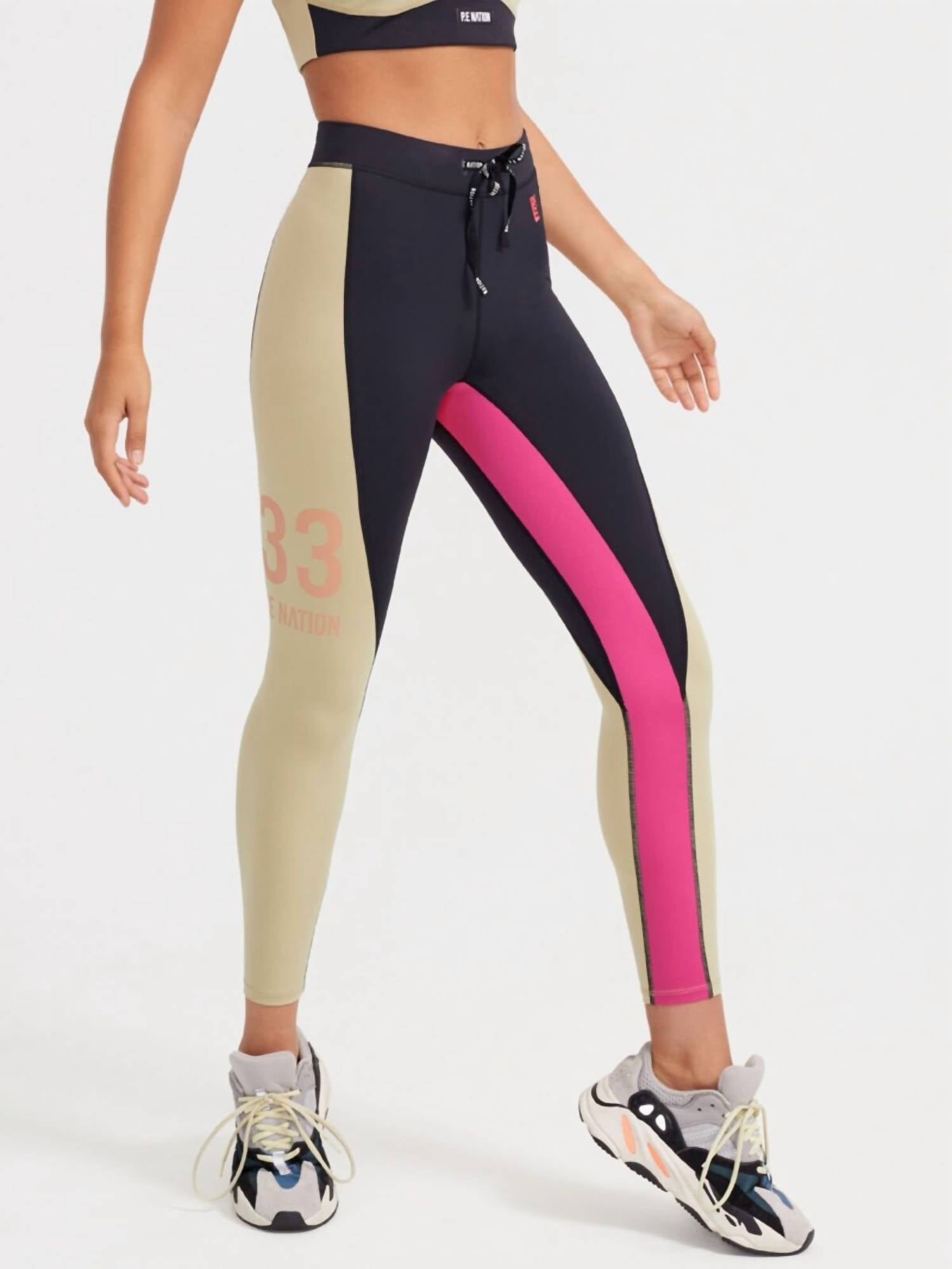 Introducing the Double Team Legging by P.E. NATION, an athleisure essential that combines style and performance. These full-length leggings boast a high-rise fit and are made from a sustainable polyester fabrication that is squatproof and lightweight. Designed with P.E Nation's signature color-blocking, they feature black waistbands, muted khaki side panels, and contrast striped leg panels. Pull-on design. Machine washable. Perfect for high-intensity workouts or casual days, these leggings offer built-in waistband support and a standout branded look with logos and patches.
