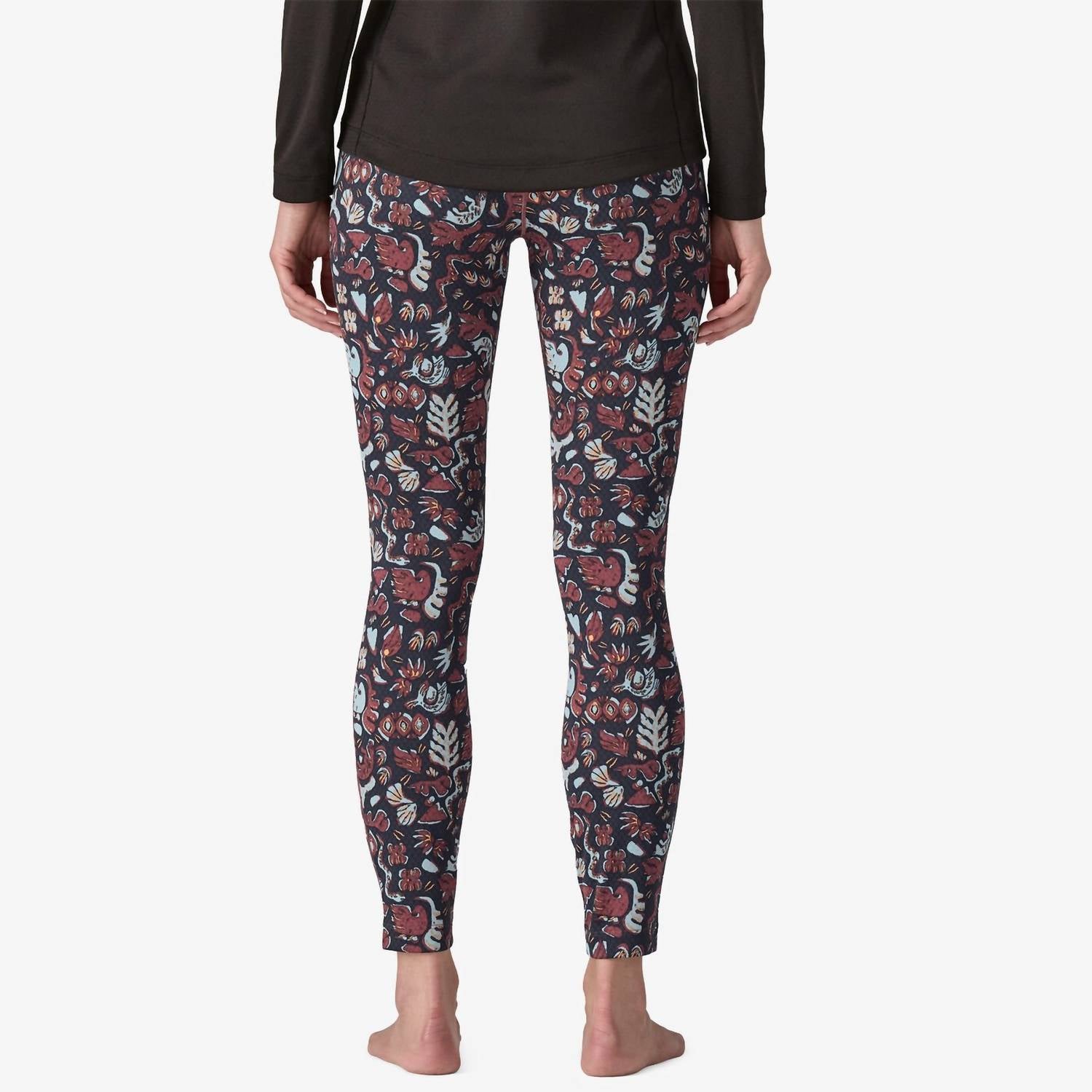 Introducing the Women's Cap Midweight Bottoms by Patagonia, designed for comfort and sustainability in a stylish patterned look. These leggings feature a pull-on closure and are crafted from 100% recycled polyester with hollow-core yarns and a diamond-grid back for warmth and quick-drying performance. Perfect for layering during spring, they offer a regular fit with a mid-rise waist and skinny leg style. Care: Machine wash and tumble dry for easy maintenance.