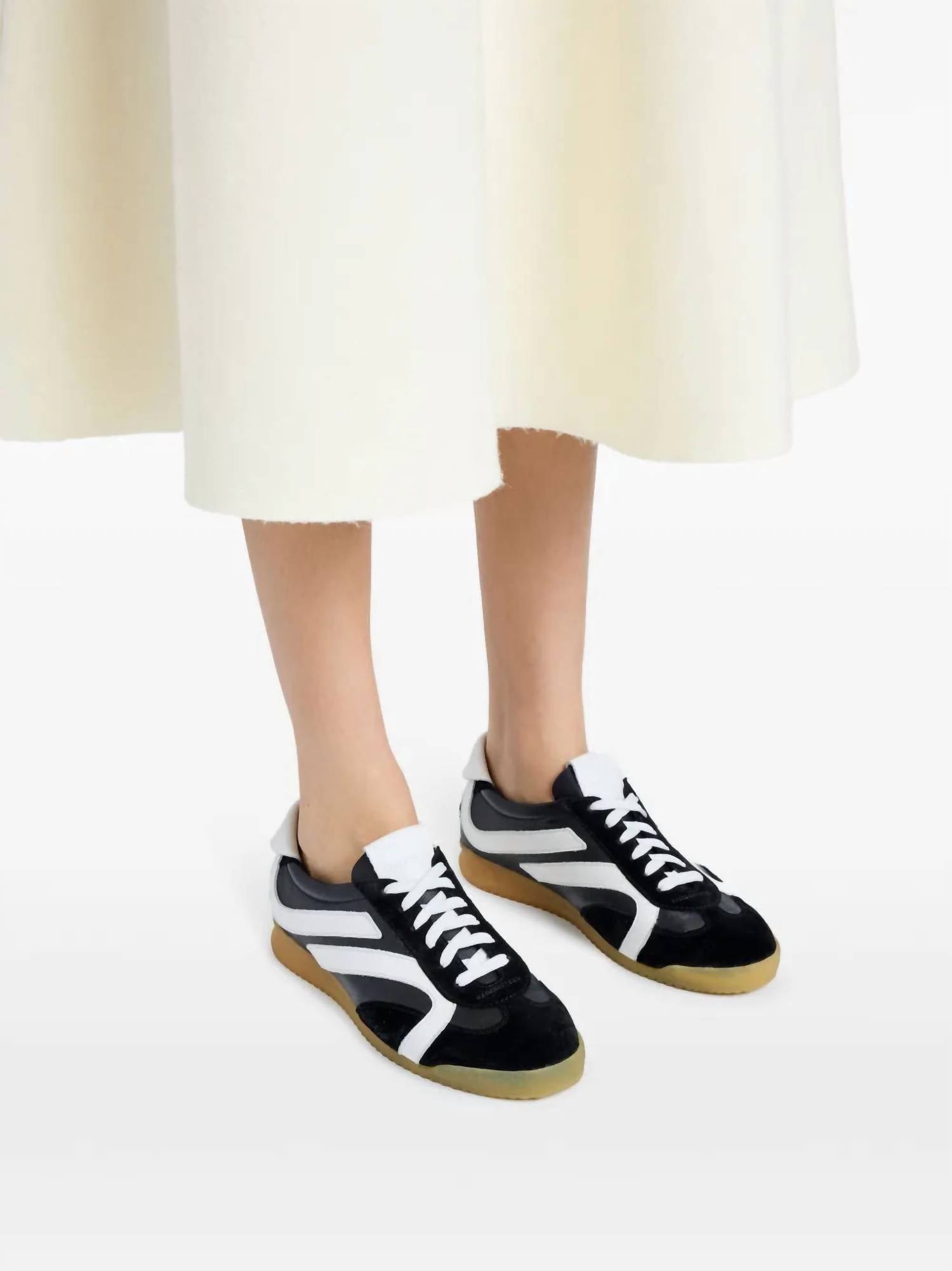 Step into comfort and style with the Proenza Schouler Women's Track Sneaker, a chic addition to any athleisure wardrobe. Crafted from a blend of 50% calfskin and 50% lambskin, these sneakers feature a leather upper and a supportive memory foam insole for all-day comfort. The design is completed with suede detailing, signature monogram elements, an embossed logo back tab, and durable nylon laces. Made in Italy with a 100% rubber sole, these sneakers are perfect for game day and every casual occasion.
