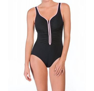 Reebok - Zip Tide Outline Shirred Zipper Front Scoop Neck One Piece Swimsuit