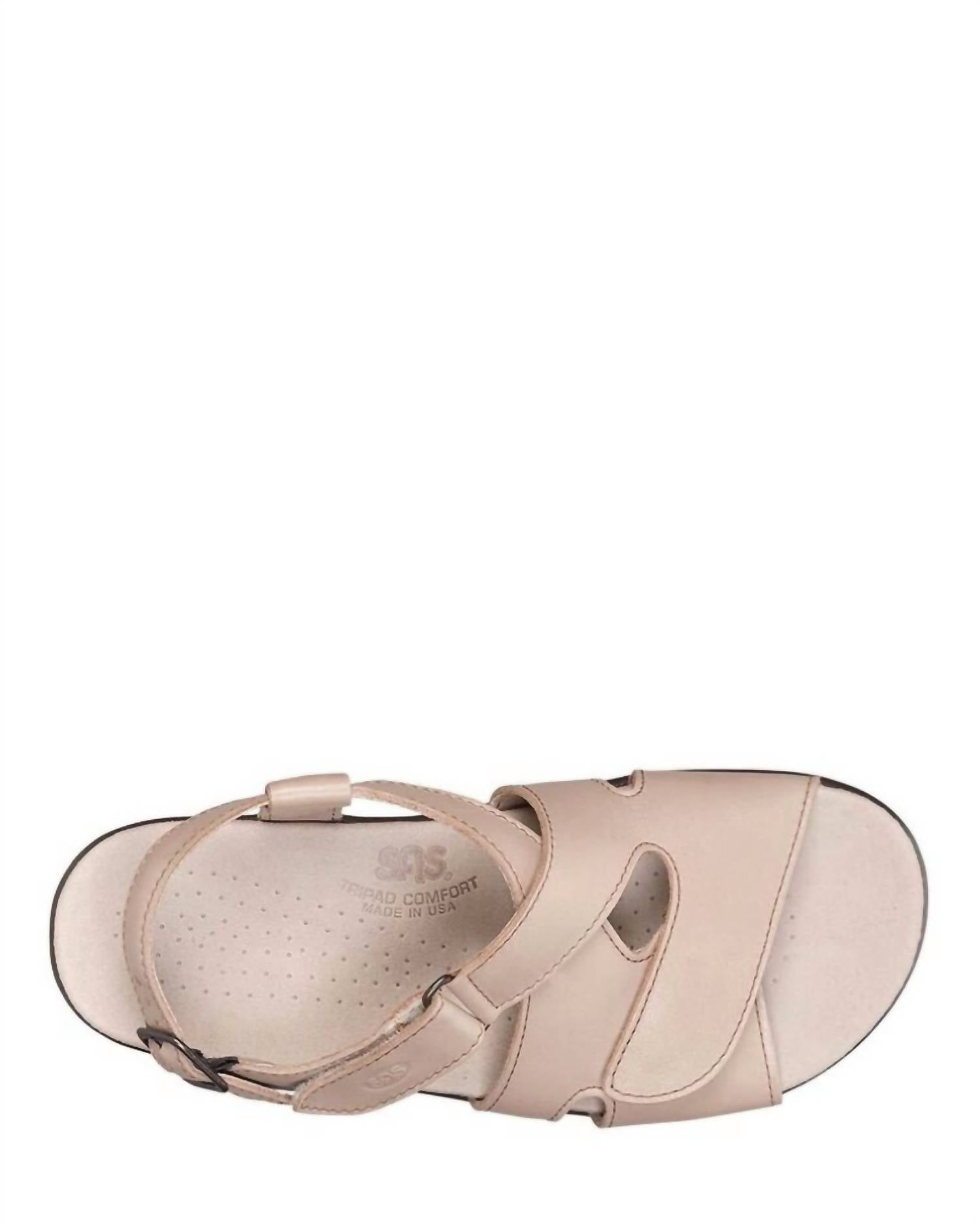 Wide leather straps. Broad and contoured insole covered in Super Suede. Adjustable EZ Strap. Soft sole that rebounds with each step. Made in the USA.