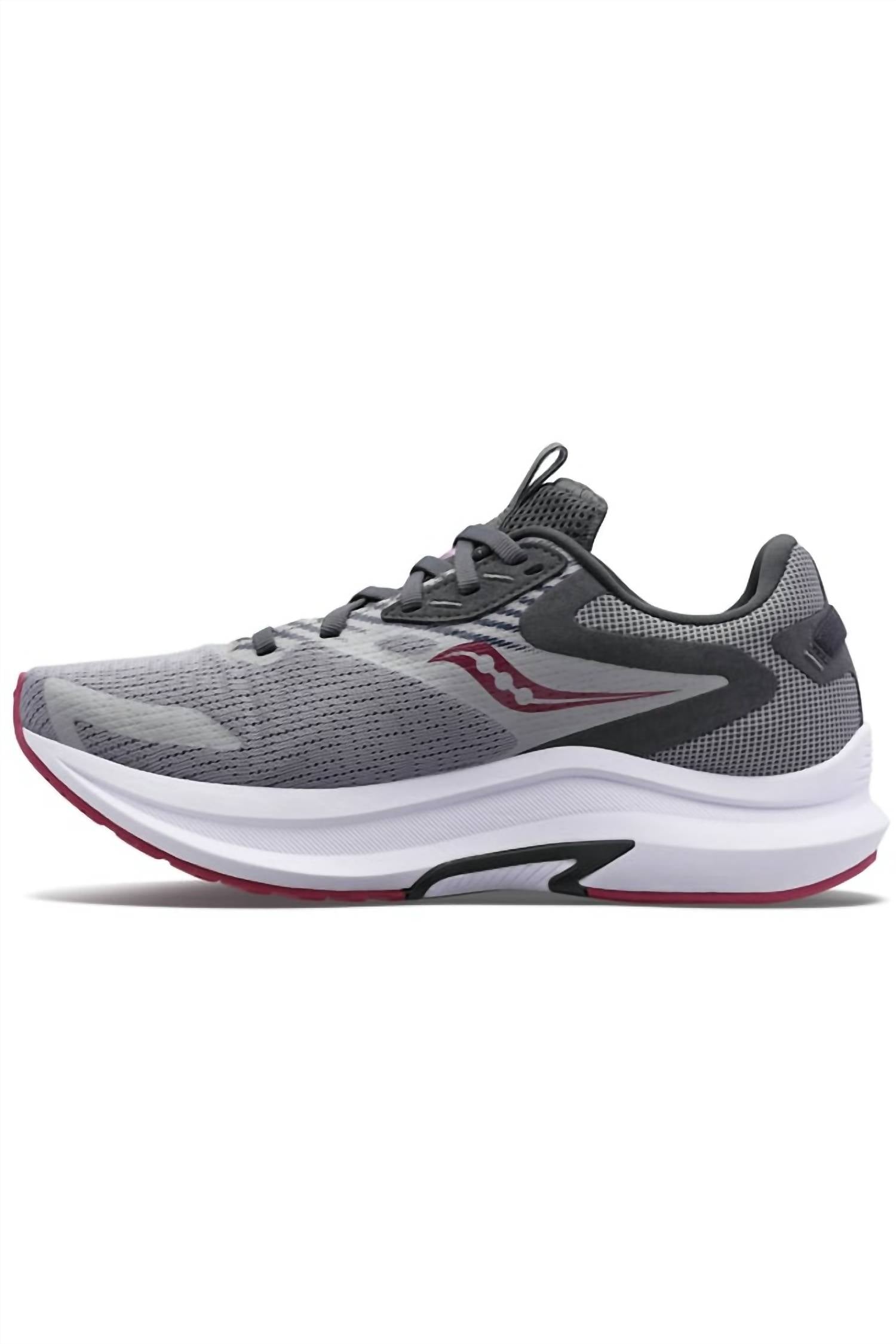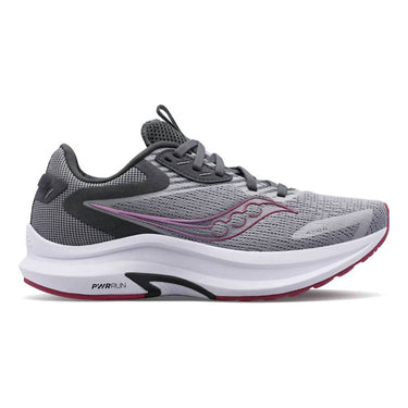 Introducing the Women's Axon 2 Running Sneakers by Saucony, a perfect choice for your fitness and workout needs. Designed with a breathable air mesh upper and a durable carbon rubber outsole, these sneakers promise long-lasting comfort. They feature a responsive PWRRUN cushioning and speed-driven geometry for a fast ride. Weighing only 8.5 oz (241g) in a striking Shadow/Quartz color, these round-toe sneakers are ideal for summer and athleisure trends.