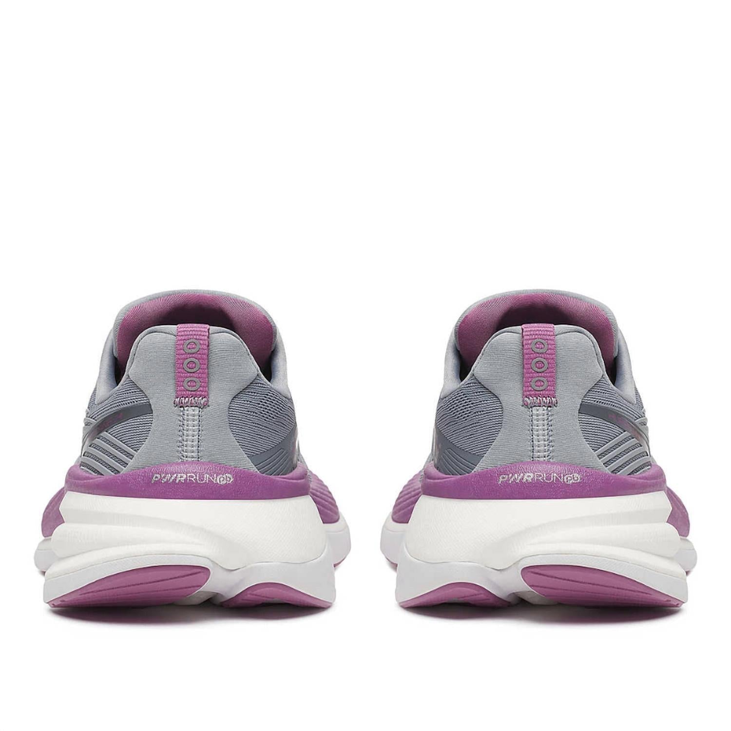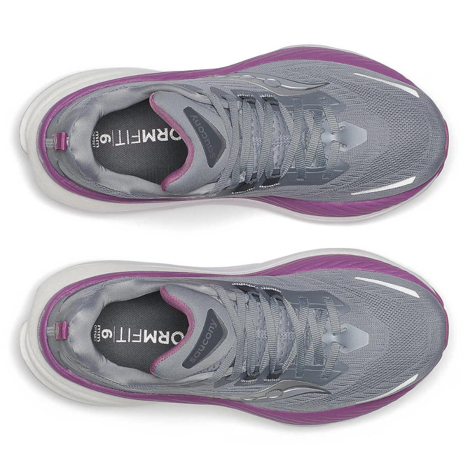 When fashion meets function. Discover the Women's Hurricane 24 Shoes by SAUCONY, designed to elevate your summer runs in style. These athletic shoes in Flint/Viola feature a round toe and flat heel, ideal for fitness and workout activities. Featuring an innovative dual-cushioning system, the PWRRUN PB foam offers plush, energy-returning comfort while being supported by a PWRRUN foam frame. A perfect choice for athleisure enthusiasts celebrating the 4th of July, these shoes promise both comfort and performance.